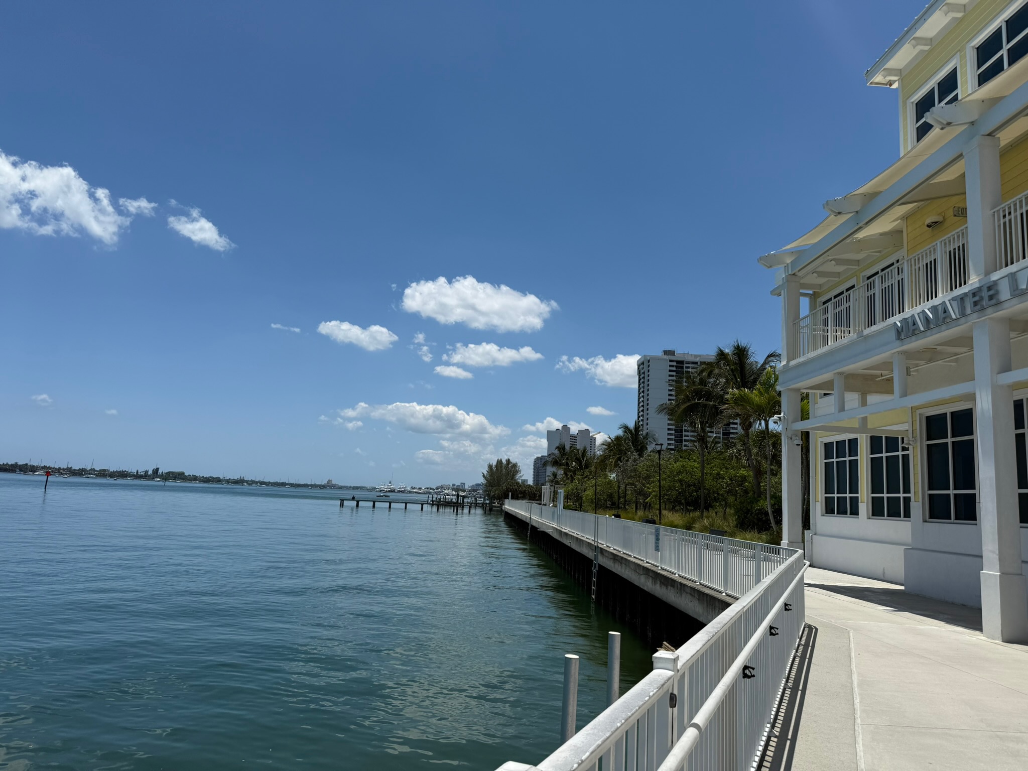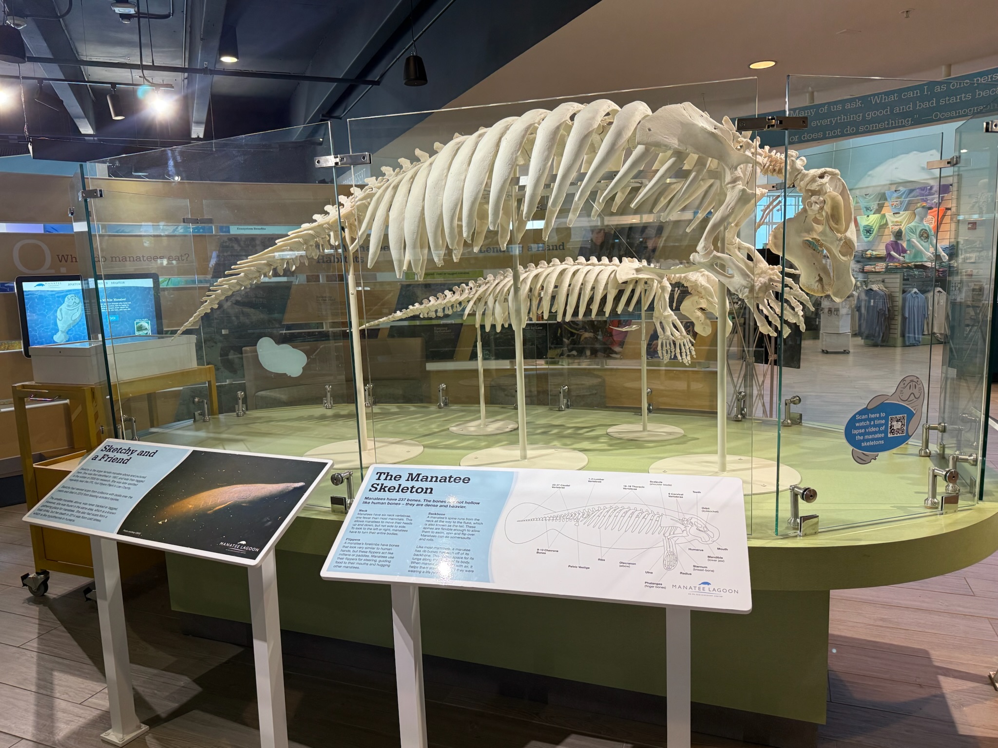 We were pleased to find out that there was no admission fee, though donations were accepted. The upstairs was closed today for a private event, but the upstairs had traveling art exhibits and beautiful views, so we didn’t miss any important information about manatees.