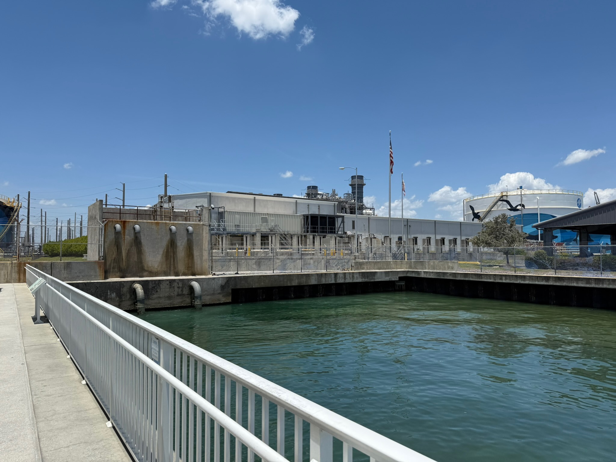 Manatees can die from being in water less than 68-degrees Fahrenheit. They tend to migrate to northern Florida (and sometimes beyond) in the summer and move to southern Florida in the winter, though they won’t necessarily move south if they find a spot with warm water to spend the winter in. One of the warm spots that they congregate at is this little alcove along the patio of the Manatee Discovery Center. The adjoining electricity plant makes electricity via steam, and the excess water is drained into the lagoon via the pipes pictured, making this spot warm. While manatees generally live alone or in small groups, larger groups will congregate here peacefully. Since it was summer, there were none here today.