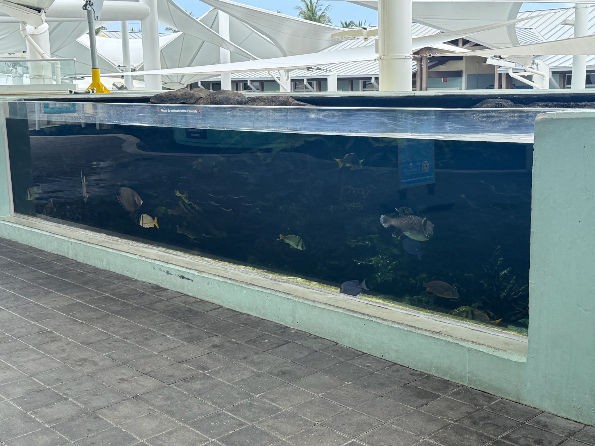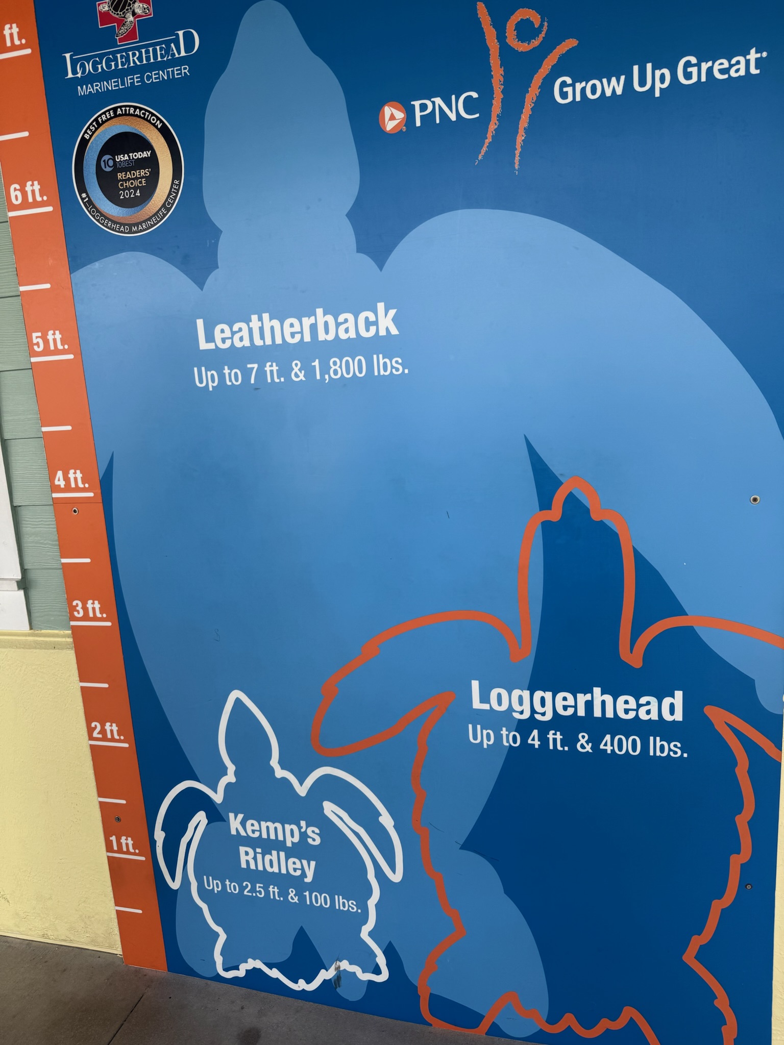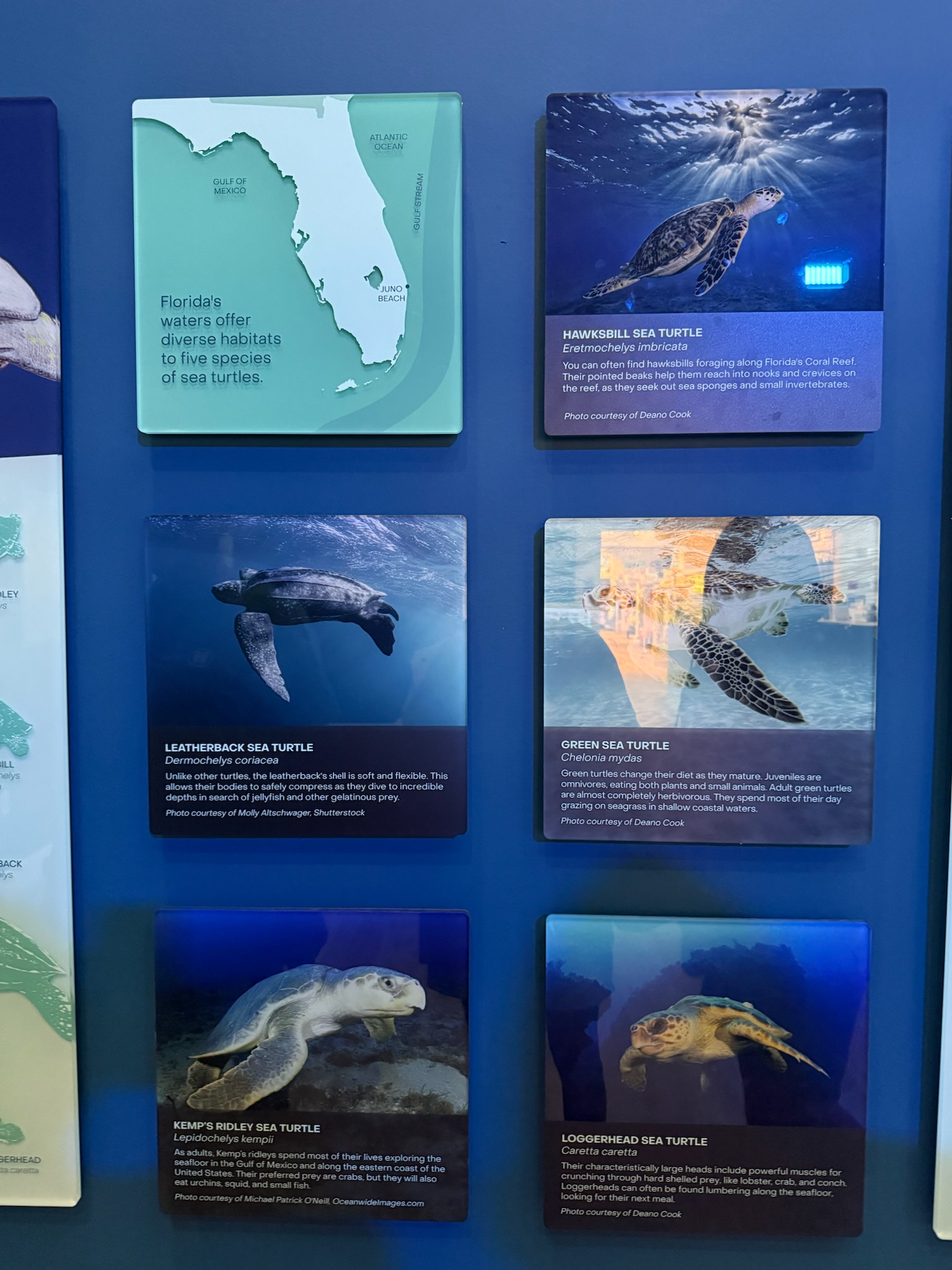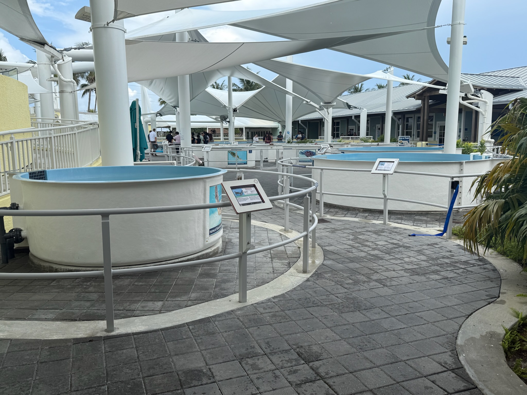 The majority of the displays were outdoors. We were allowed to visit the displays that were under the covered walkways. While the indoor exhibits had general marine information, the outdoor displays under the walkway were focused on turtles. Per the signs, there were seven species of turtle in the world. Five swim in Florida waters, but only the Leatherback, Green and Loggerhead turtles lay eggs in Florida.