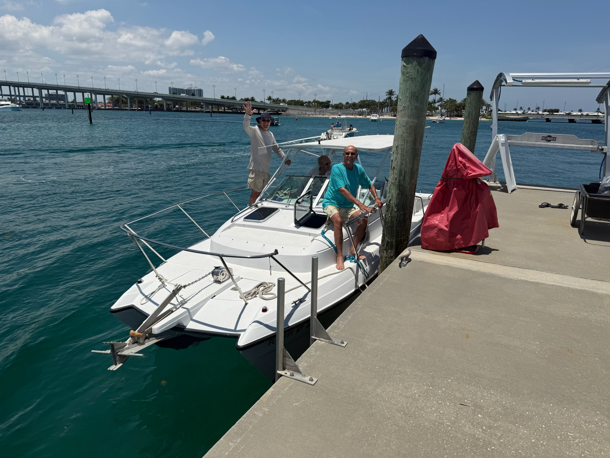 In the afternoon, Eric went on a boat ride with Johnny and Steve on Steve’s boat. Steve picked Eric up from the end of the dock.