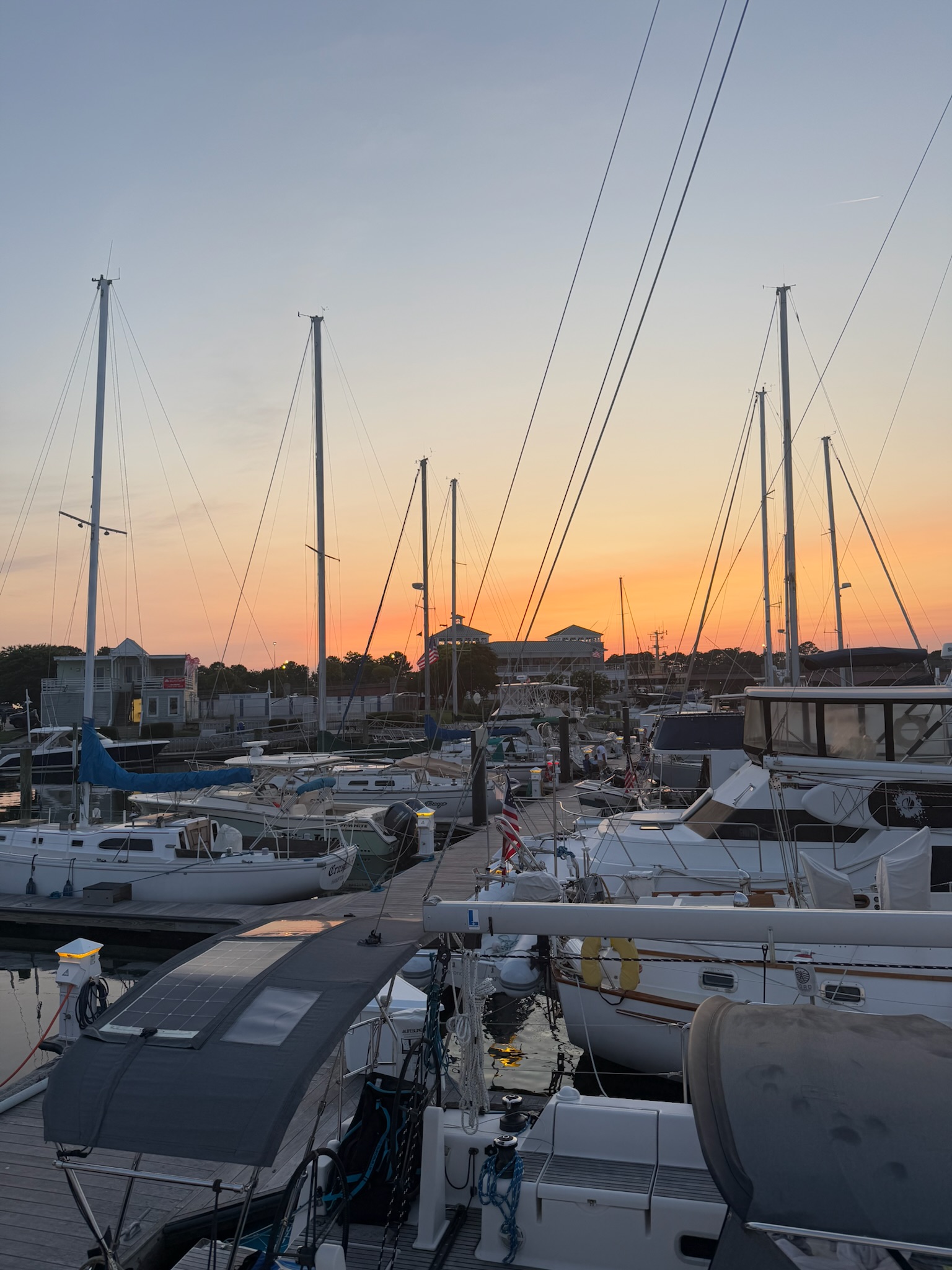 Anxious to avoid terrible crowds and traffic, we left the fort at about 1645. As we were leaving, we noticed several more vendors streaming in and a conga line of people entering the field. We felt like we were getting out just in the nick of time. Dusk at the marina: