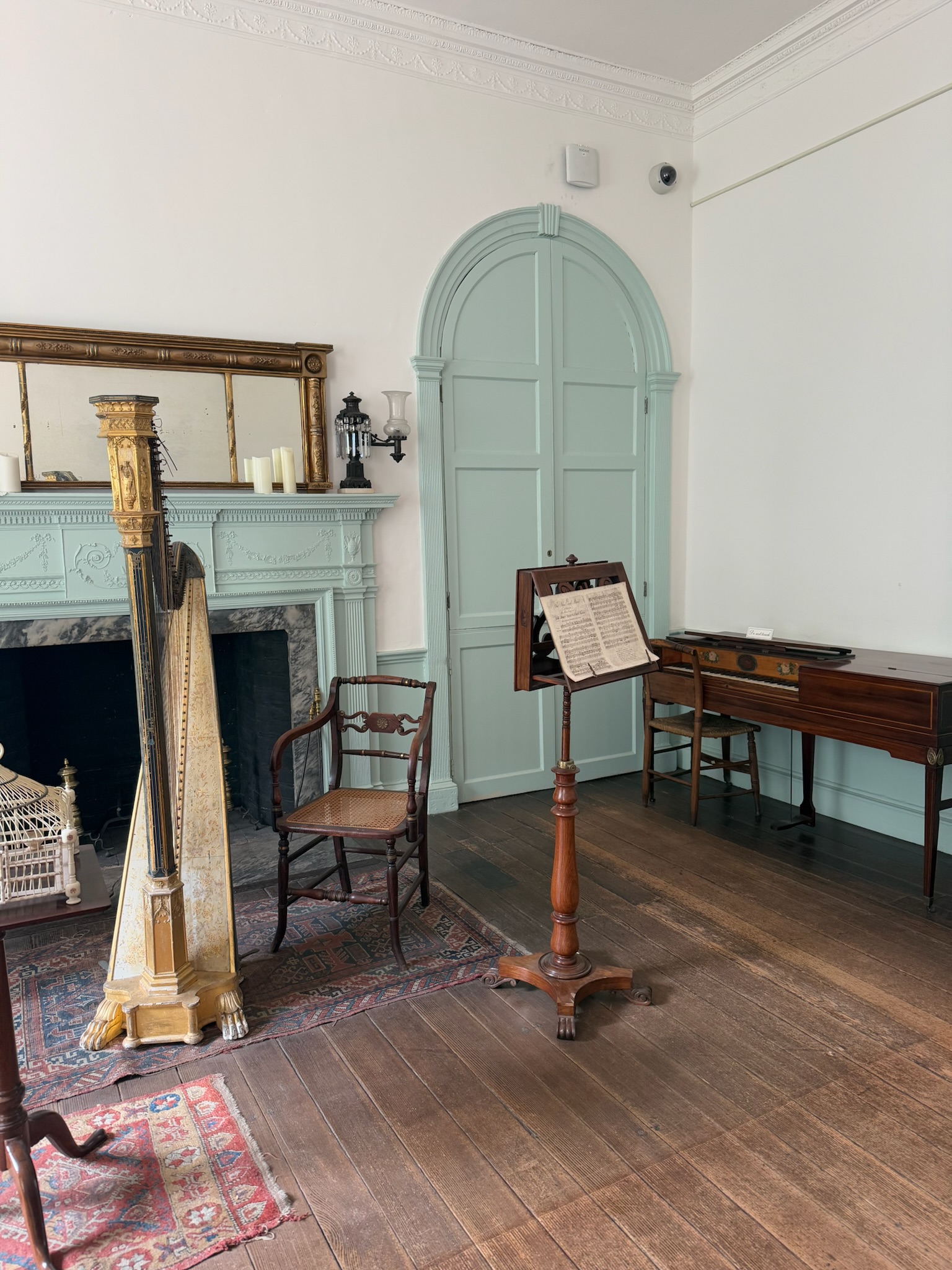 The drawing room was used solely for formal entertaining. The room was intended to wow people with their wealth, hence the real gold leaf on the mantle and the expensive paintings of the family members on the wall. Fun fact: the gold leaf was painted over before the assets in the home were inventoried. As we’d mentioned in the 4th of July post, the Revolution occurred during a period in history called The Enlightenment. The Enlightenment ideals were heavily influenced by the Ancient Greek and Roman doctrines, and thus, the popular decorating style of the time was Neo-Classical. The Myers’ furniture and decor was very en-vogue for the era.