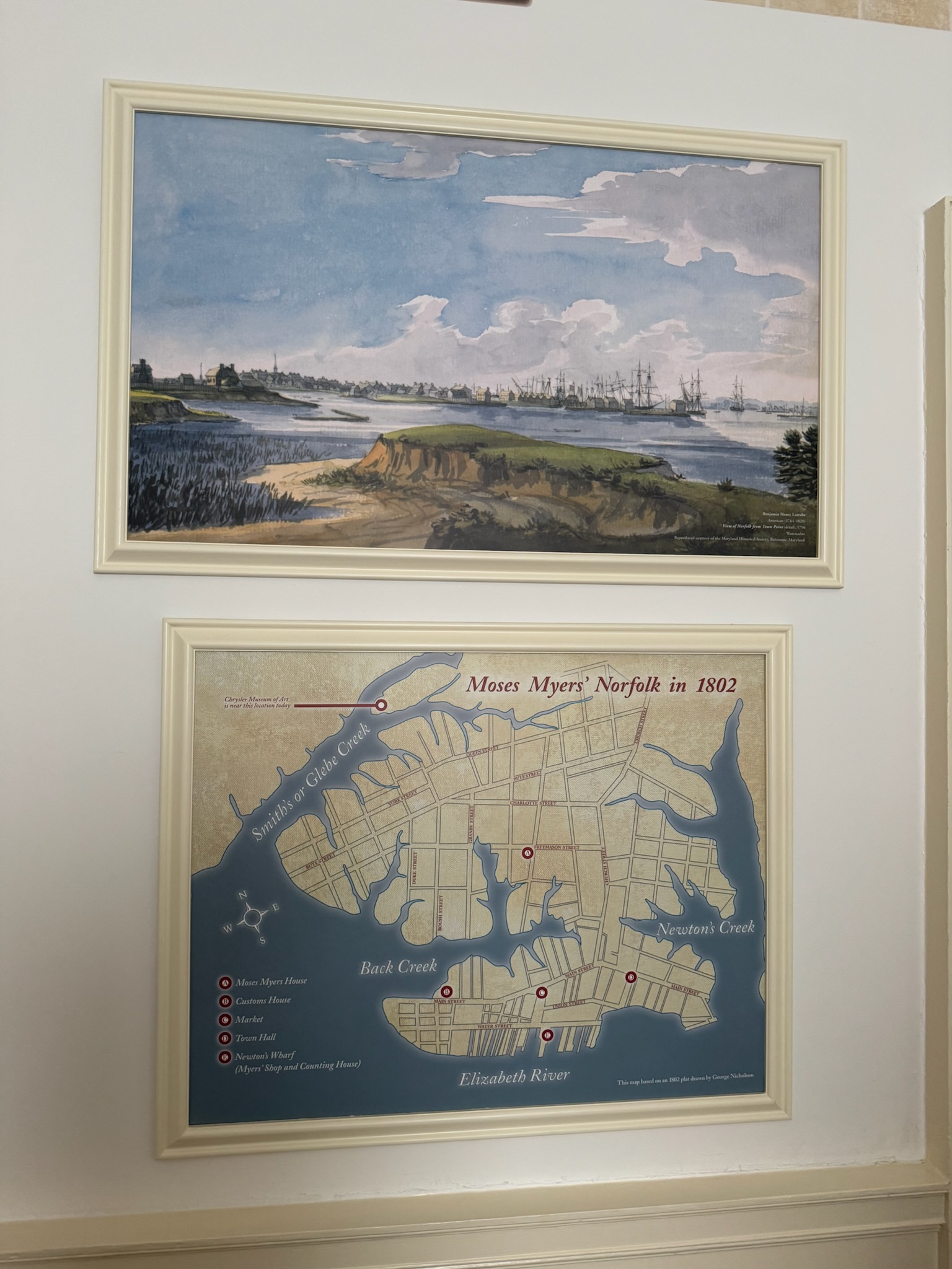 Another particularly fascinating item in the room was another map, this one of Norfolk in 1802. The Myers back yard had been on the edge of Back Creek. The guide explained that the creek had since been filled in. We clarified that the parking garage next door was built on reclaimed land, and she confirmed that it was. She went on to explain that a lot of Norfolk was built on reclaimed land, and those areas had serious flooding problems. There were actually efforts underway to remove some of the man-made land and restore the natural waterways.
