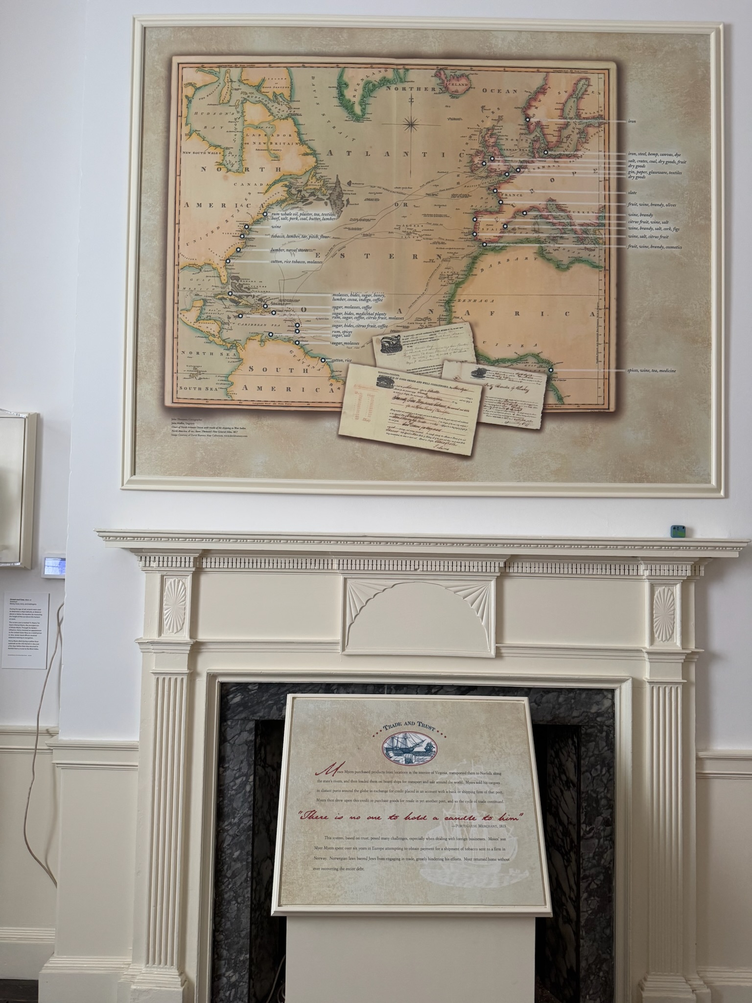 One of the former bedrooms was a display area that focused on Moses’s career. One particularly fascinating item in the room was a map from 1817. This depicted of part of the Atlantic and the continents that bordered it. There were dots on various port cities and the key identified what products were exported from those locations. There were also sailing routes between various ports of call. The sign under the map said that Moses usually owned about 6 ships at a time. He would buy products from the interior of Virginia, transport them by river to Norfolk, then exported those products overseas. Then he’d used the money made to buy products at those foreign ports to bring back to the US to sell. In selecting which ports to send his ships to, he had to factor in current events, exchange rates and market prices. The Napoleonic wars hindered trade with both Britain and France, and the disruption of commerce led to a national depression in 1819 that left Myers bankrupt.