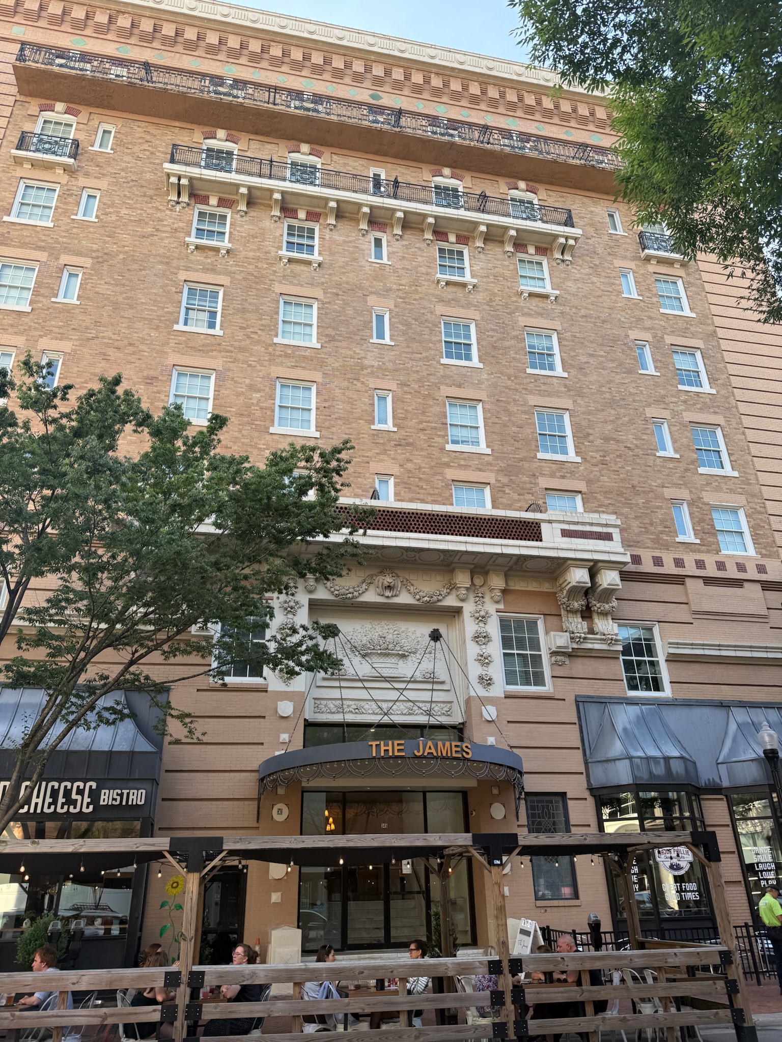 We settled on a gourmet grilled cheese restaurant called The Grilled Cheese Bistro. It was on the ground floor of the James Hotel, which was built in the early 1900s and was now an apartment complex.