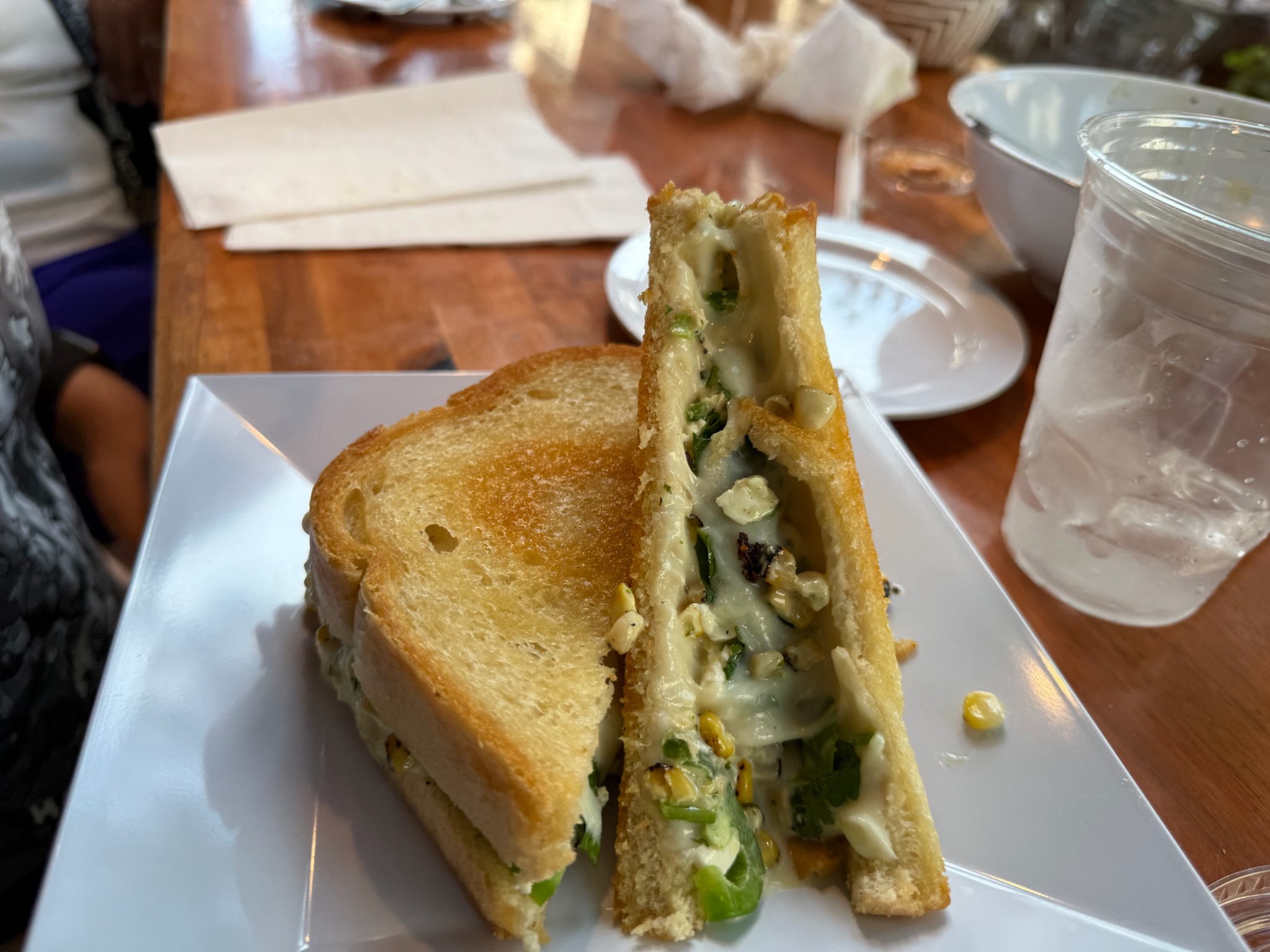 Keith ordered one with feta, parmesan and mozzarella with corn, jalapeƱos, and a chimichurri (a sauce made with garlic and parsley or cilantro sauce) aioli on sourdough. That was messy for him to eat.