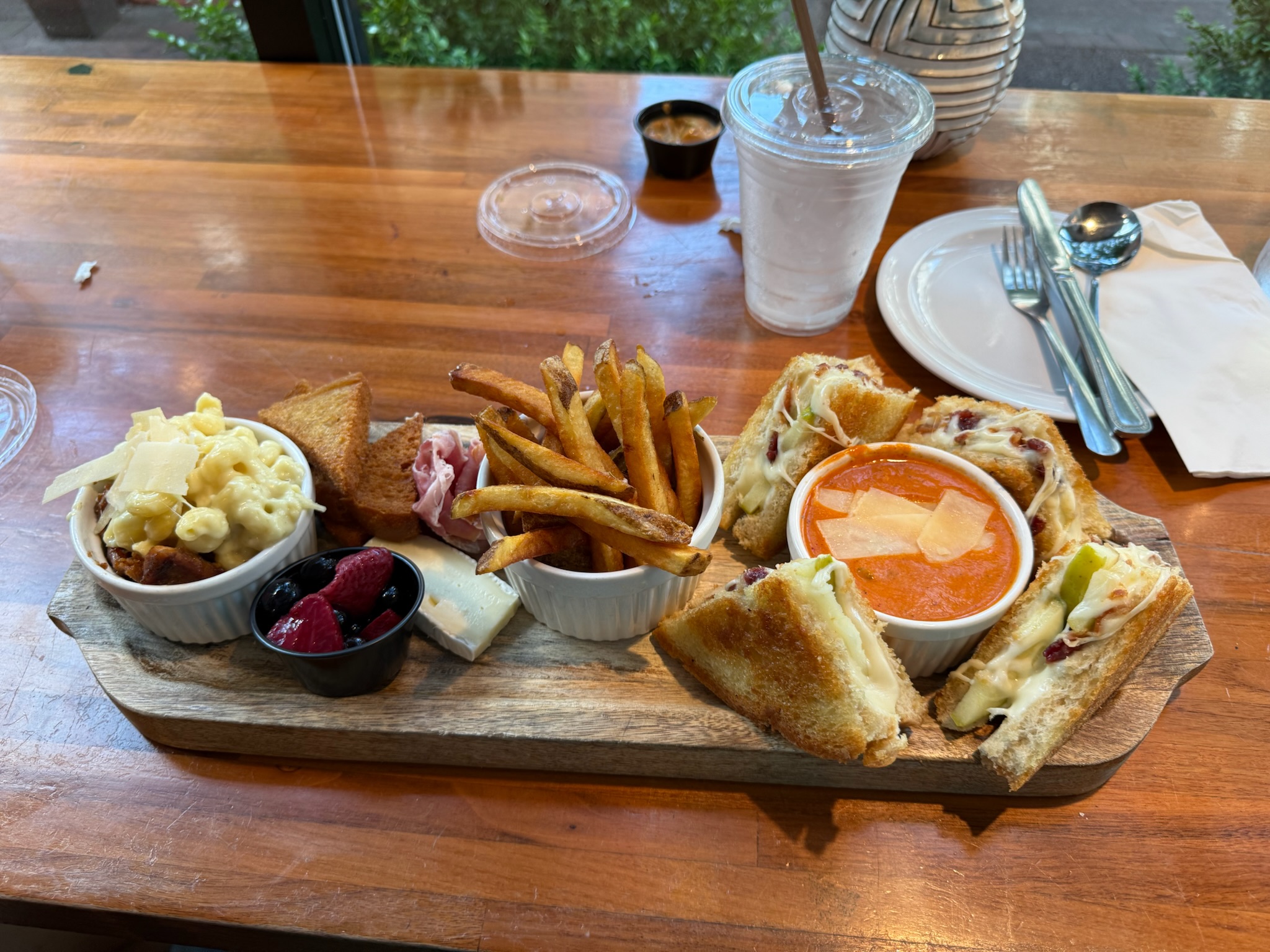 Eric ordered a tasting board with: Grilled Cheese with cheddar, bacon, apple on sourdough; bourbon chicken topped with black truffle mac & cheese; rosemary truffle fries; slices of crostini, brie and prosciutto with a side of berry compote and tomato bisque topped with parmesan.