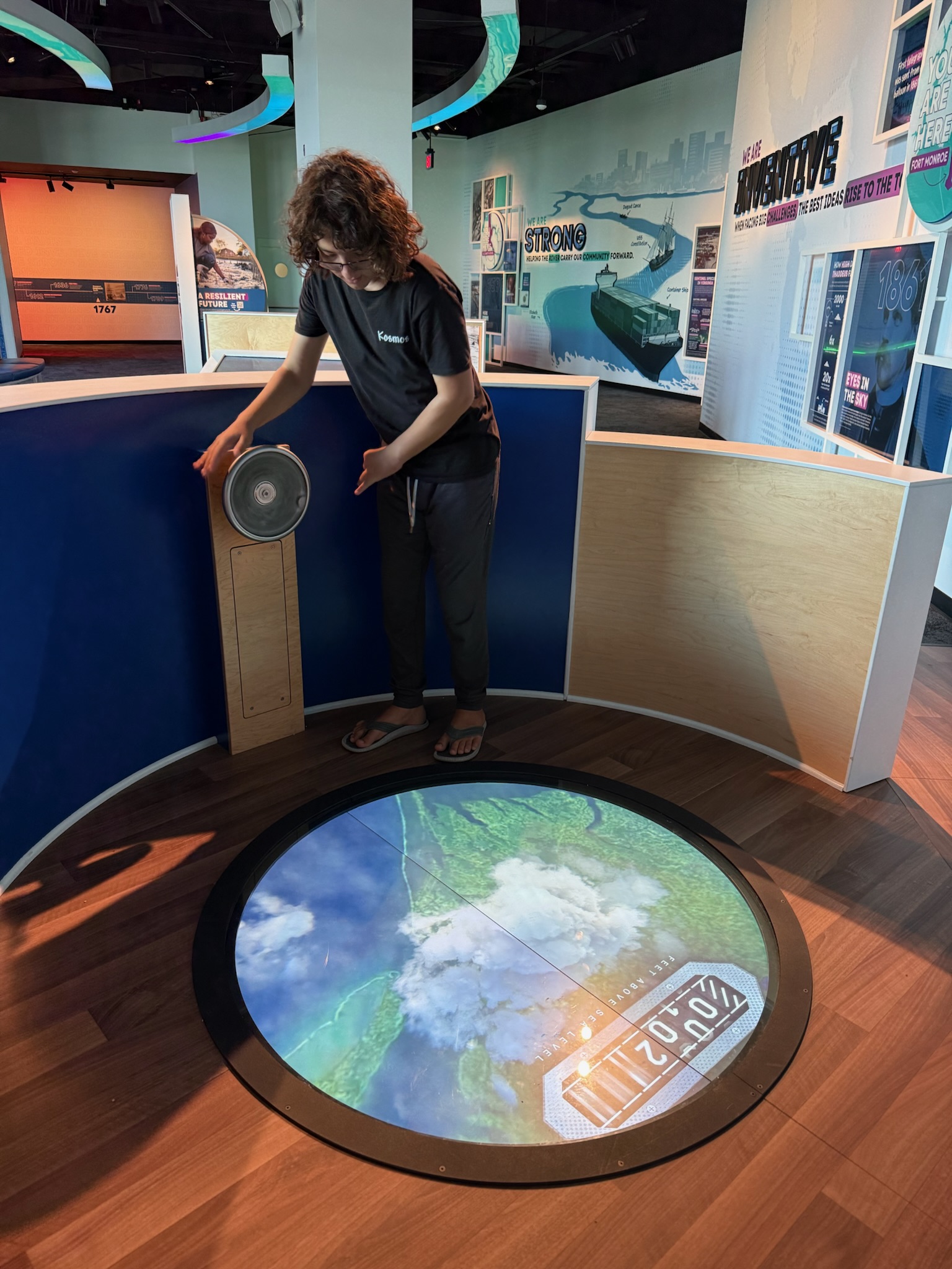 Many of the trivia signs had interactive activities accompanying them. For example, in 1862, Thaddeus Lowe took areal spying to a new level. He realized that if a person went up in a balloon over water they could see more than doing so over land, ho he tethered his balloon to a coal ship in the Hampton Roads. He was able to see for miles beyond Norfolk. The balloon went up 2,000 feet. There was a screen that simulated being in a balloon, showing what the view of the area was from different heights.
