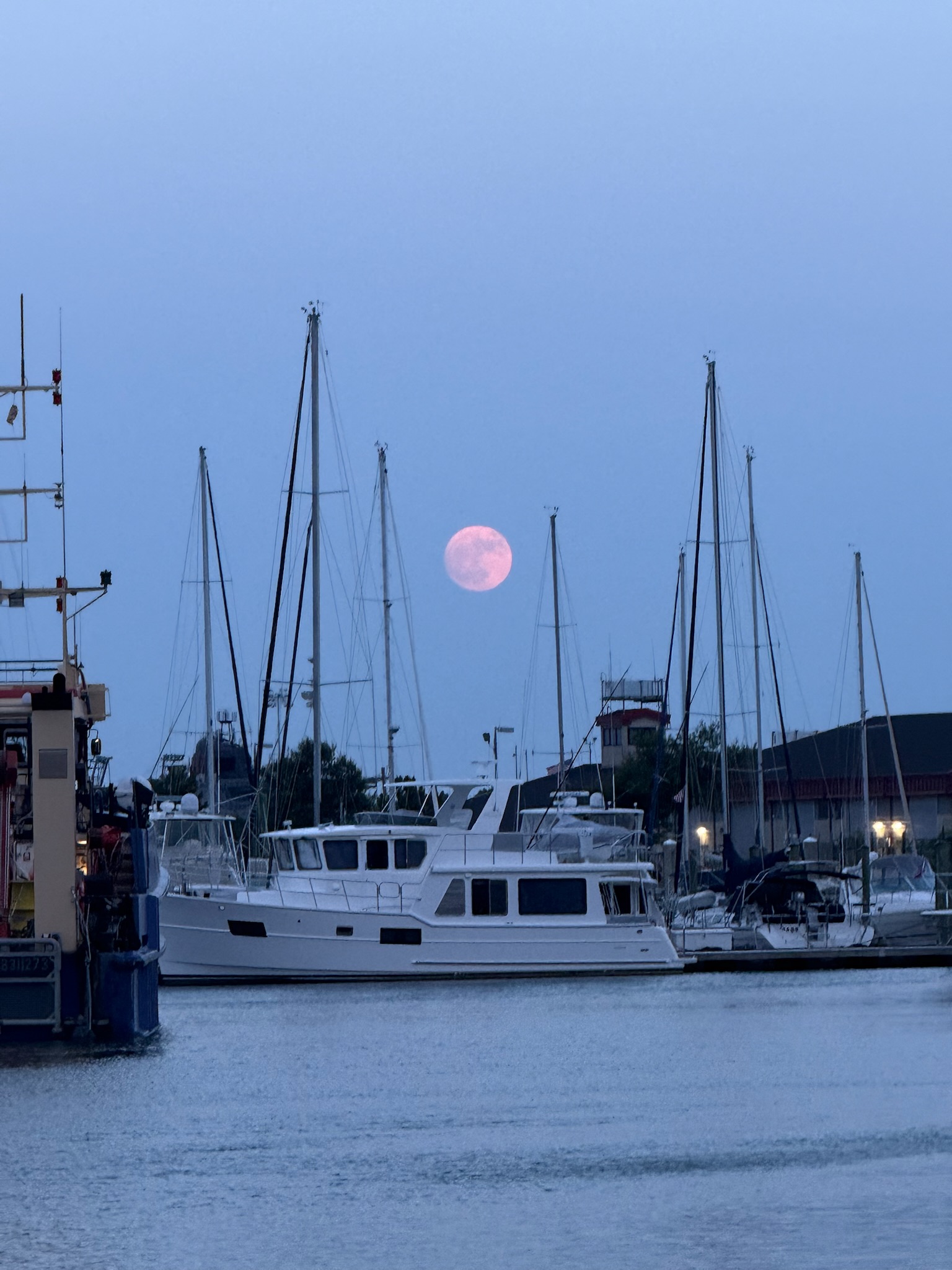 On our way back home, we stopped at Karen’s to visit with her and her family. The full moon was rising just as we returned to the marina.