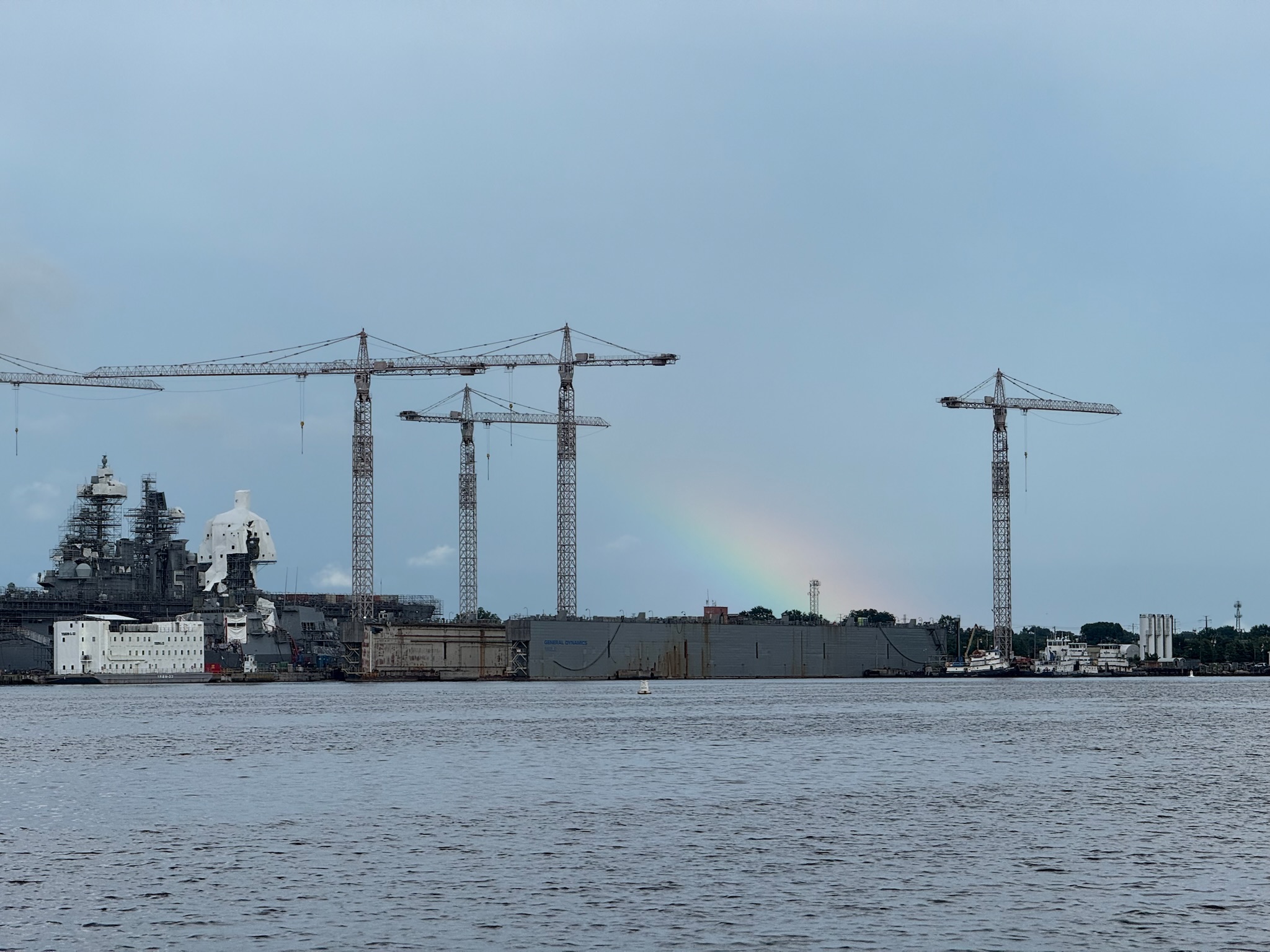 In the afternoon, Eric and Keith went to Portsmouth to see the family that we’d met a couple of weeks ago, Bigger Boat. Eric helped them find the source of a mechanical issue they were having and Keith played games with the kids. Christ was not eager to venture out in the rain, so she stayed onboard Kosmos. During a break in the rain, they saw a nice rainbow