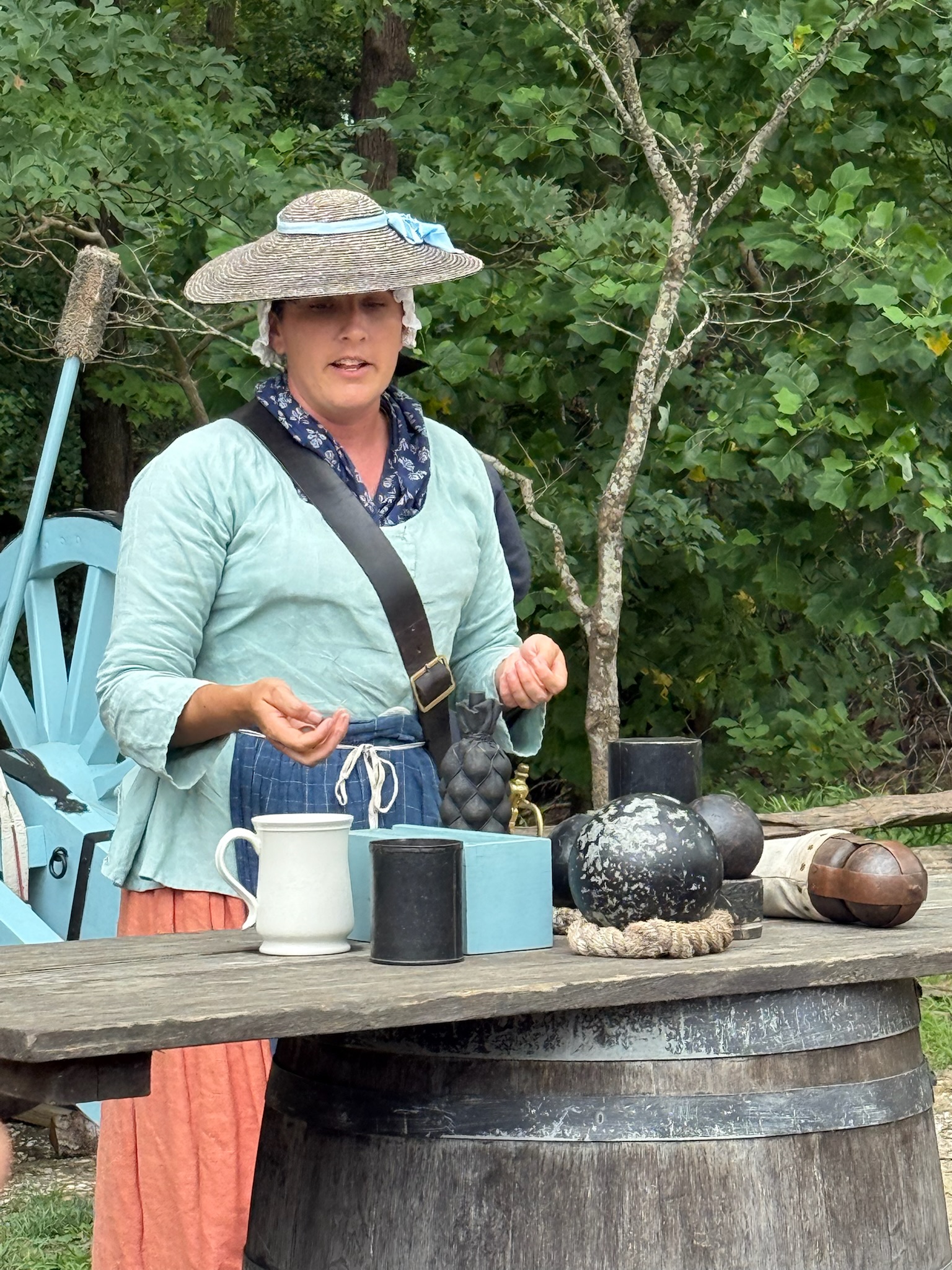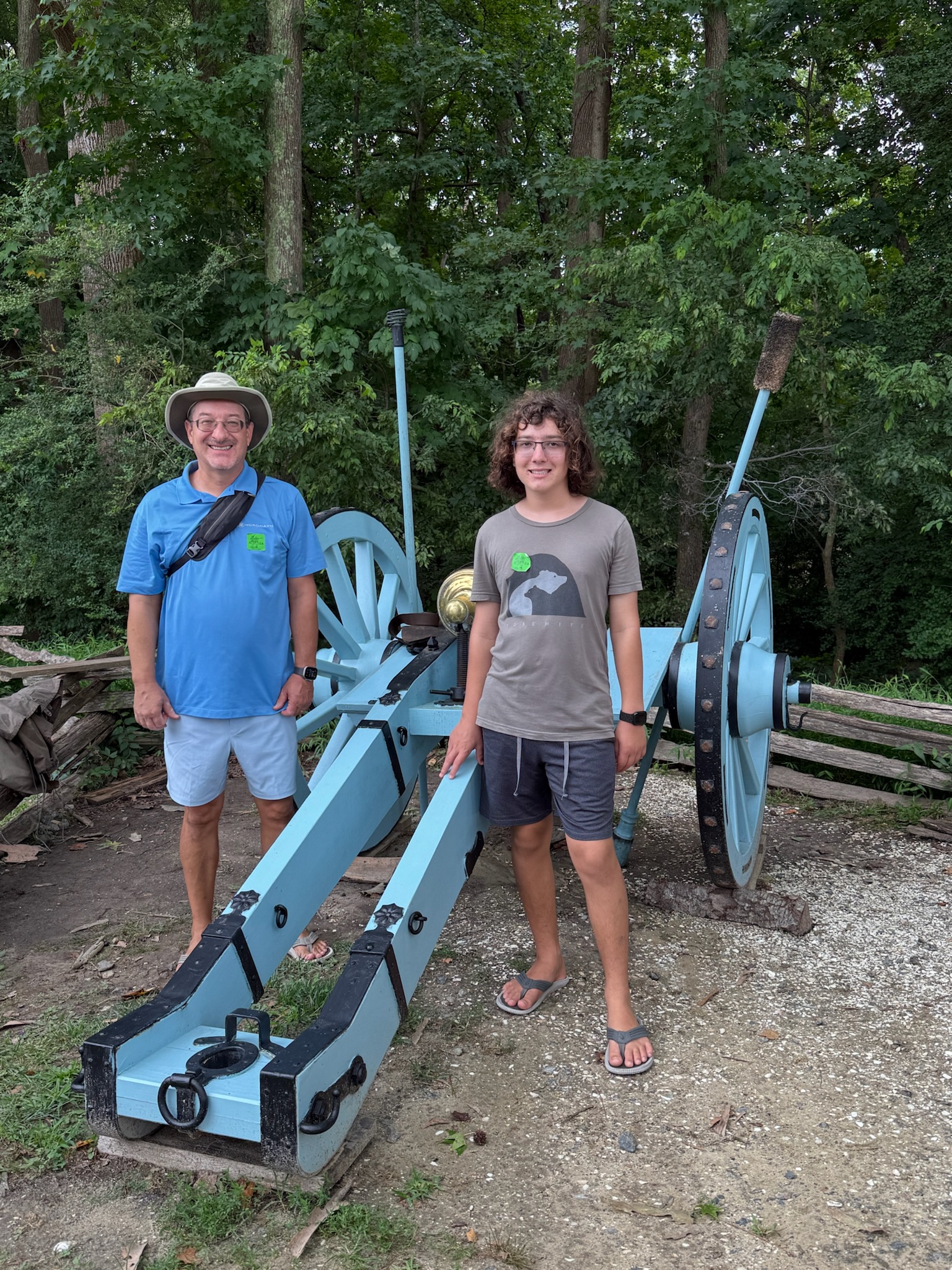 Once he finished, we met Blue Heeler at the Trail Center in First Landing National Park, which was a large state park that encompassed the tip of Cape Henry (where the Chesapeake Bay met the Atlantic Ocean). Karen had pointed it out to us when she’d given us the tour of Virginia Beach, but up until now, it had been way too hot to go hiking in the forest. But the weather was glorious today, so it was the perfect day for a hike. We apparently weren’t the only ones with that bright idea — the lines to enter the park were quite long, especially the beach entrance. The parking fee was $10. We miraculously found a parking spot. Next to where we parked was a Chesapeake burial ground. According to the sign, in 1997, the 64 bodies had been unearthed during excavation for a bridge in the city of Chesapeake, and the bodies had been reinterred here in a traditional ceremony.