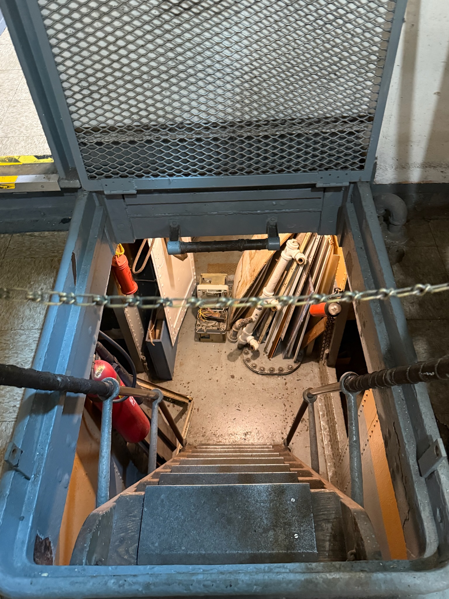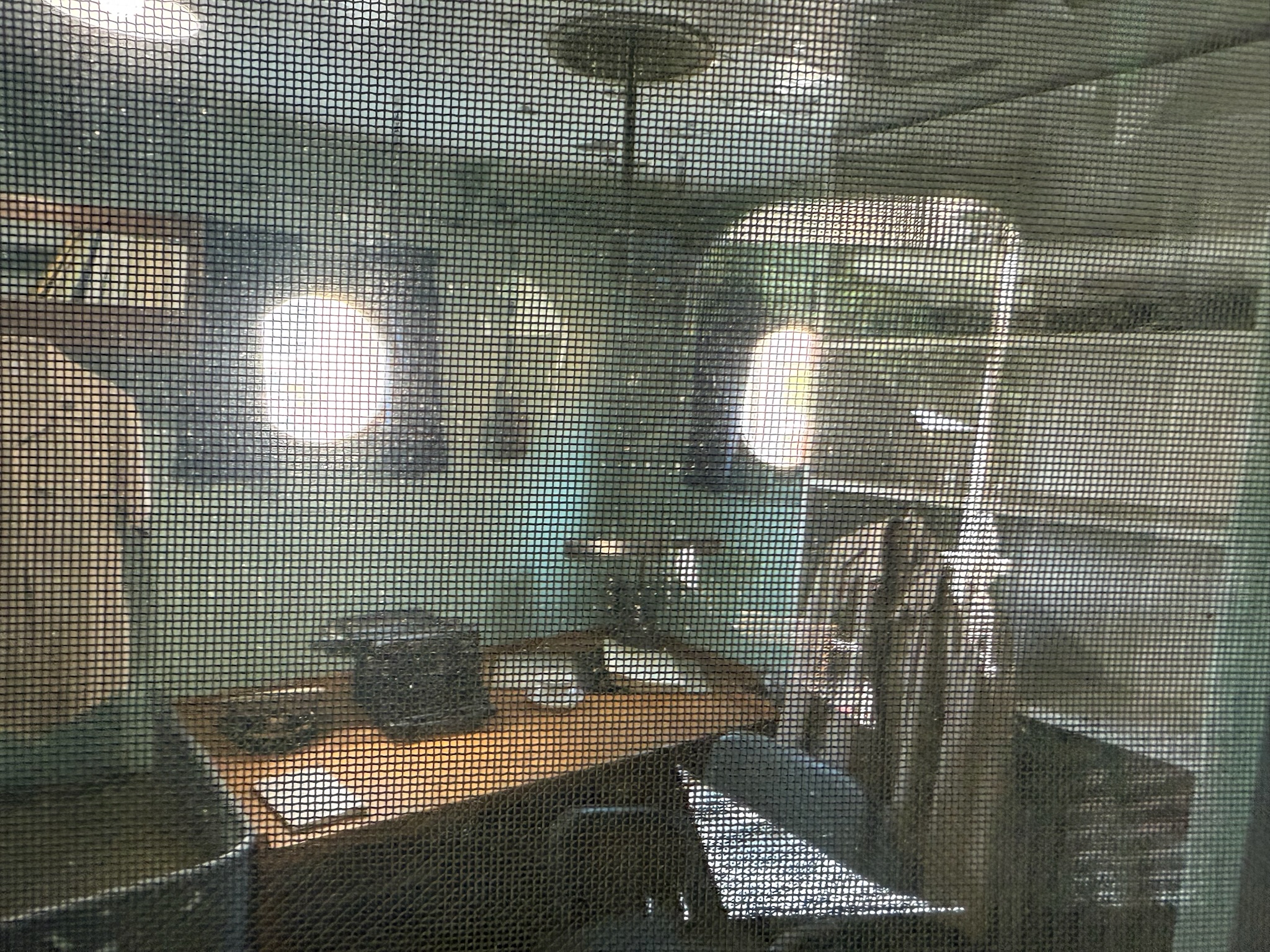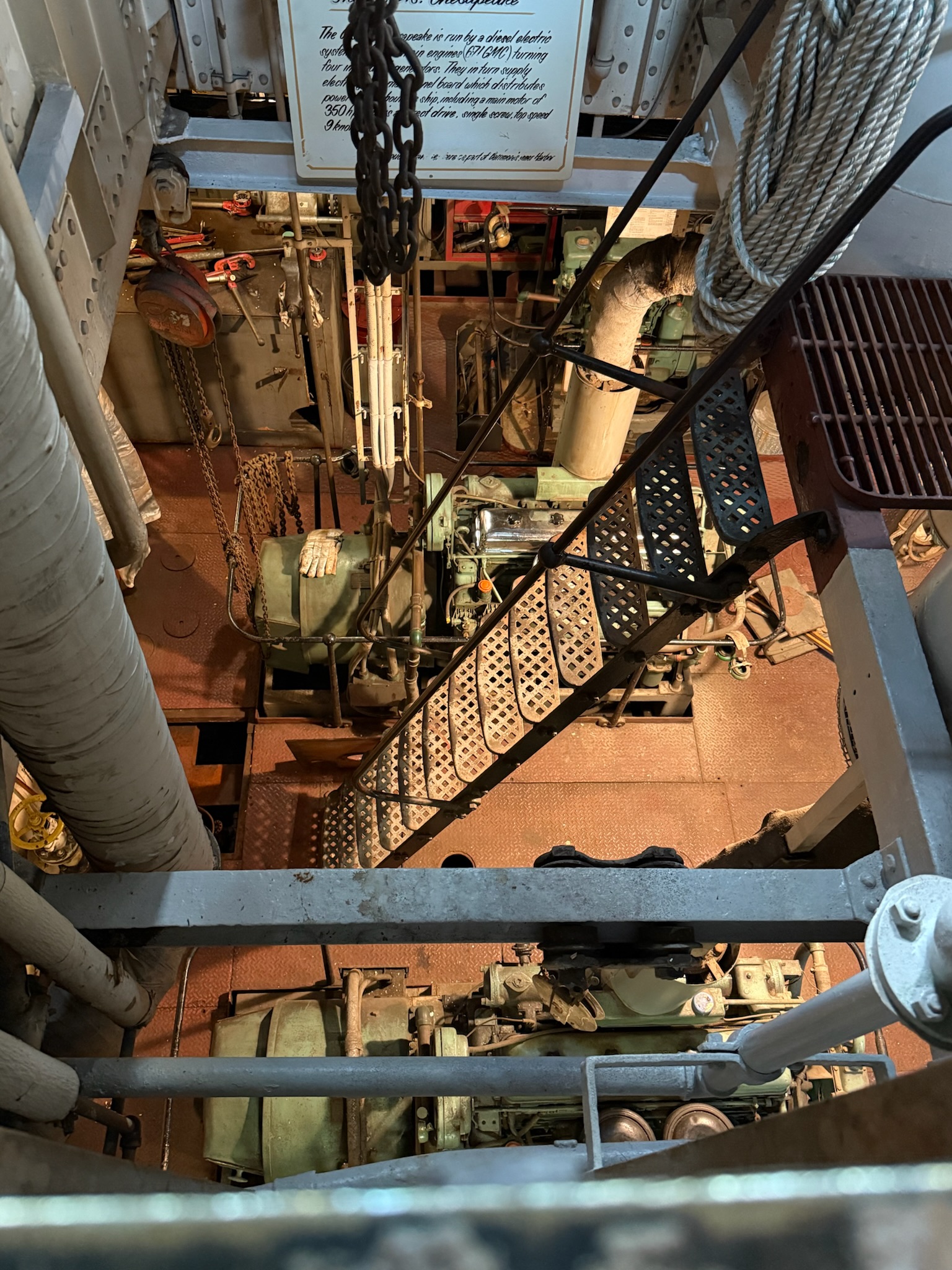 We could peek into a below deck area with the windlass. A sign explained that the mushroom anchor filled with sand and silt, so the longer it was anchored, the stronger the holding power became. The Chesapeake was normally anchored in 65 feet of water and had 120 fathoms of chain out.