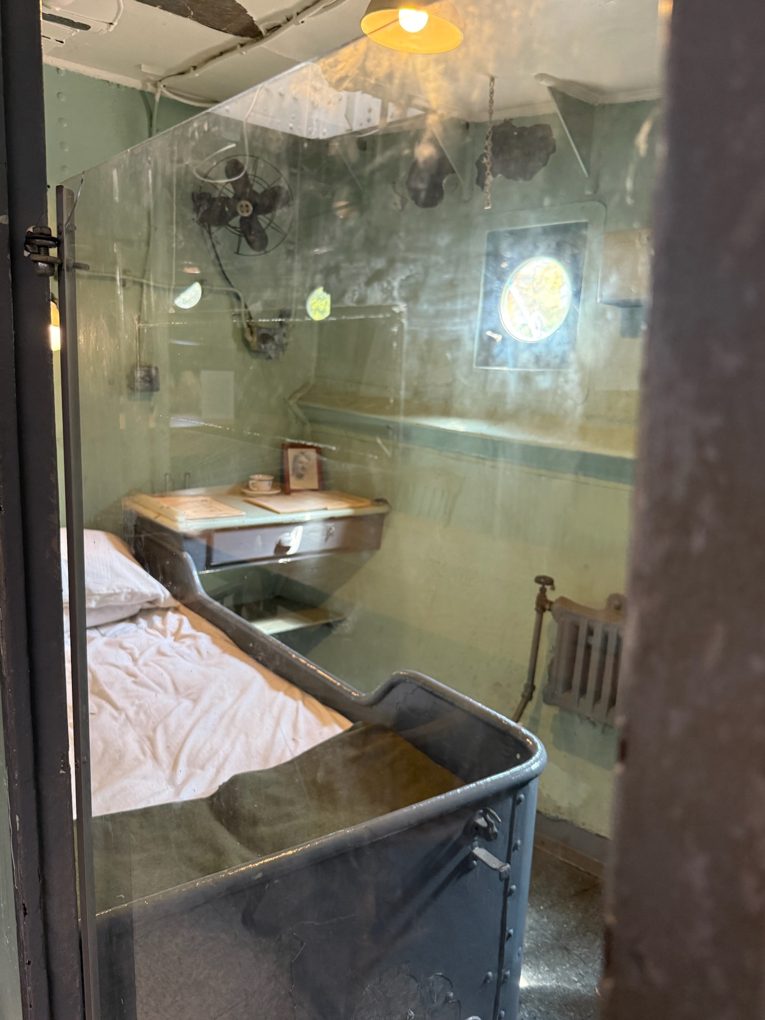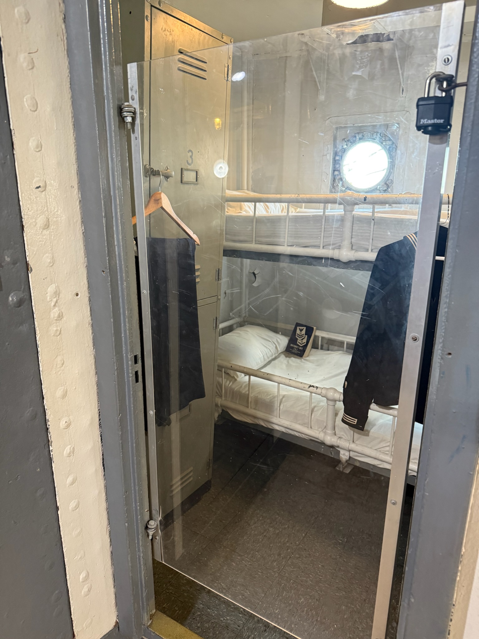 We doubled back to the entrance area and went down the starboard (right side of the boat) hallway. We passed some enlisted men’s quarters. While the rooms were tiny, they were actual rooms with doors, and there were only two beds per room. They looked luxurious compared to the berths in the USS Torsk and the USS Wisconsin. Officer’s had private staterooms.