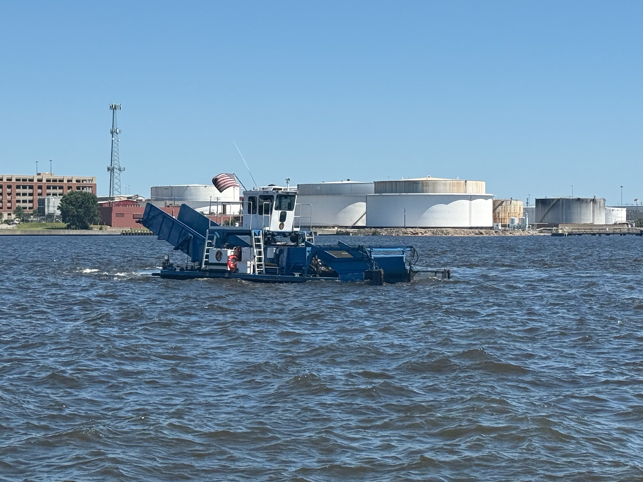 When we asked what was going on, our neighbor explained that it was a natural phenomenon that occurred every few years. We hope we’re remembering what he said correctly. If not, please correct us in the comments: there was a bacteria or algae or something that lived on the bottom. It didn’t bother the bigger fish that lived down there. But when the air was significantly lower in temperature than the water, the bacteria or algae came up to the surface and killed off the little fish. We asked if they were poisonous since the birds didn’t seem to be eating them. He said no, that the birds were simply full because there were so many fish available to eat. There was a vacuum boat sucking up all the excess fish, and he said there were two more vacuum boats in the bay, as well.