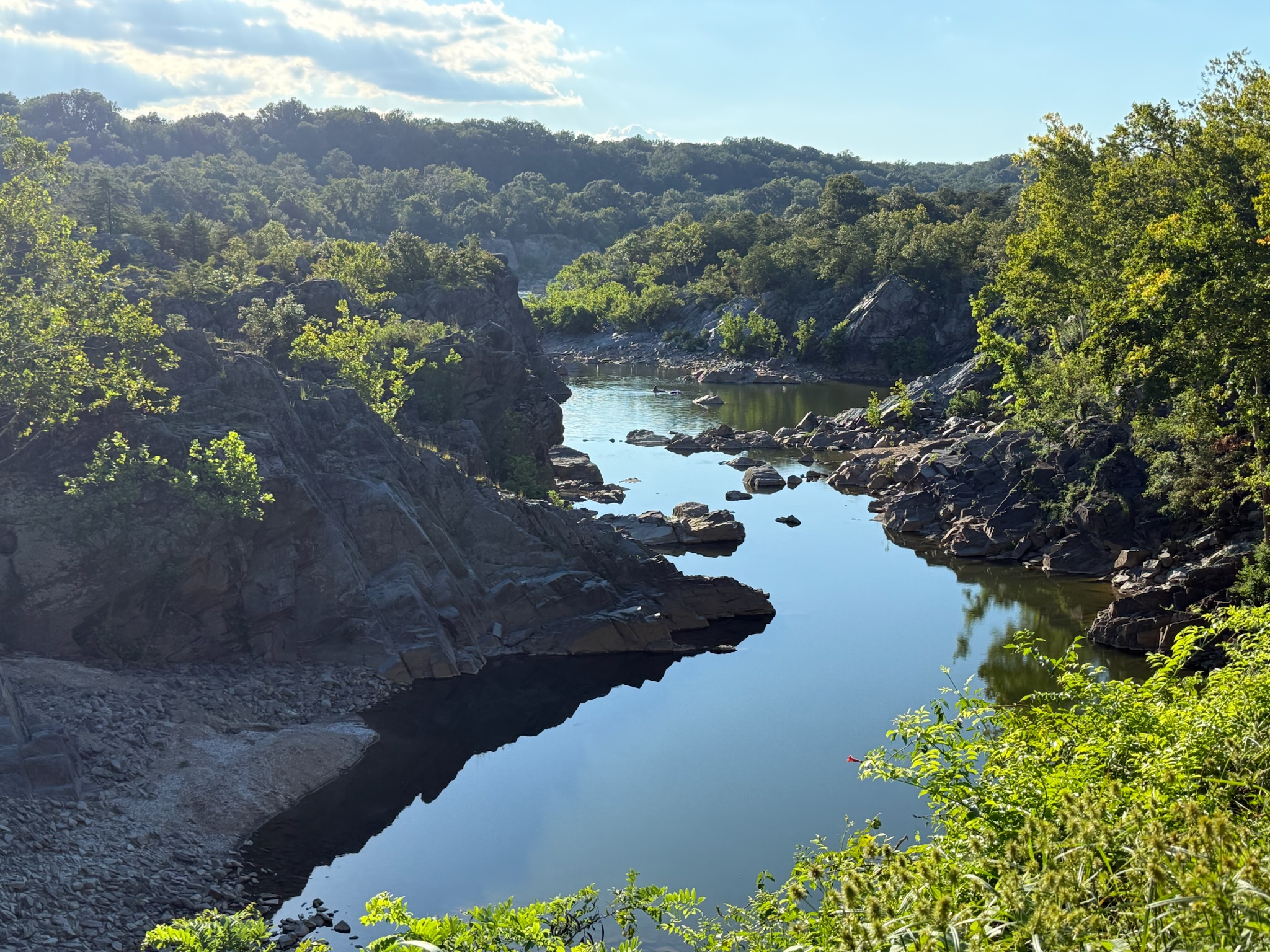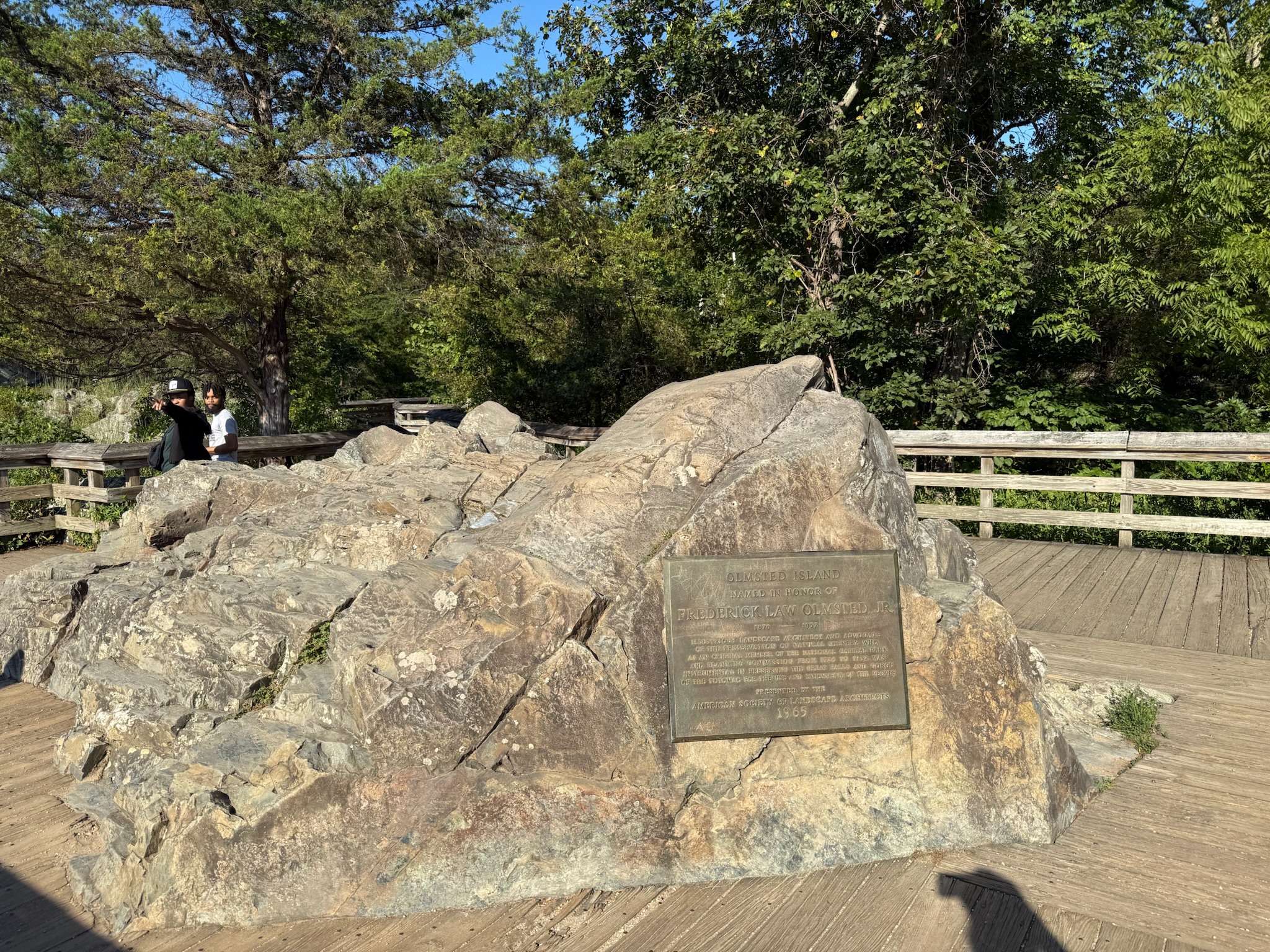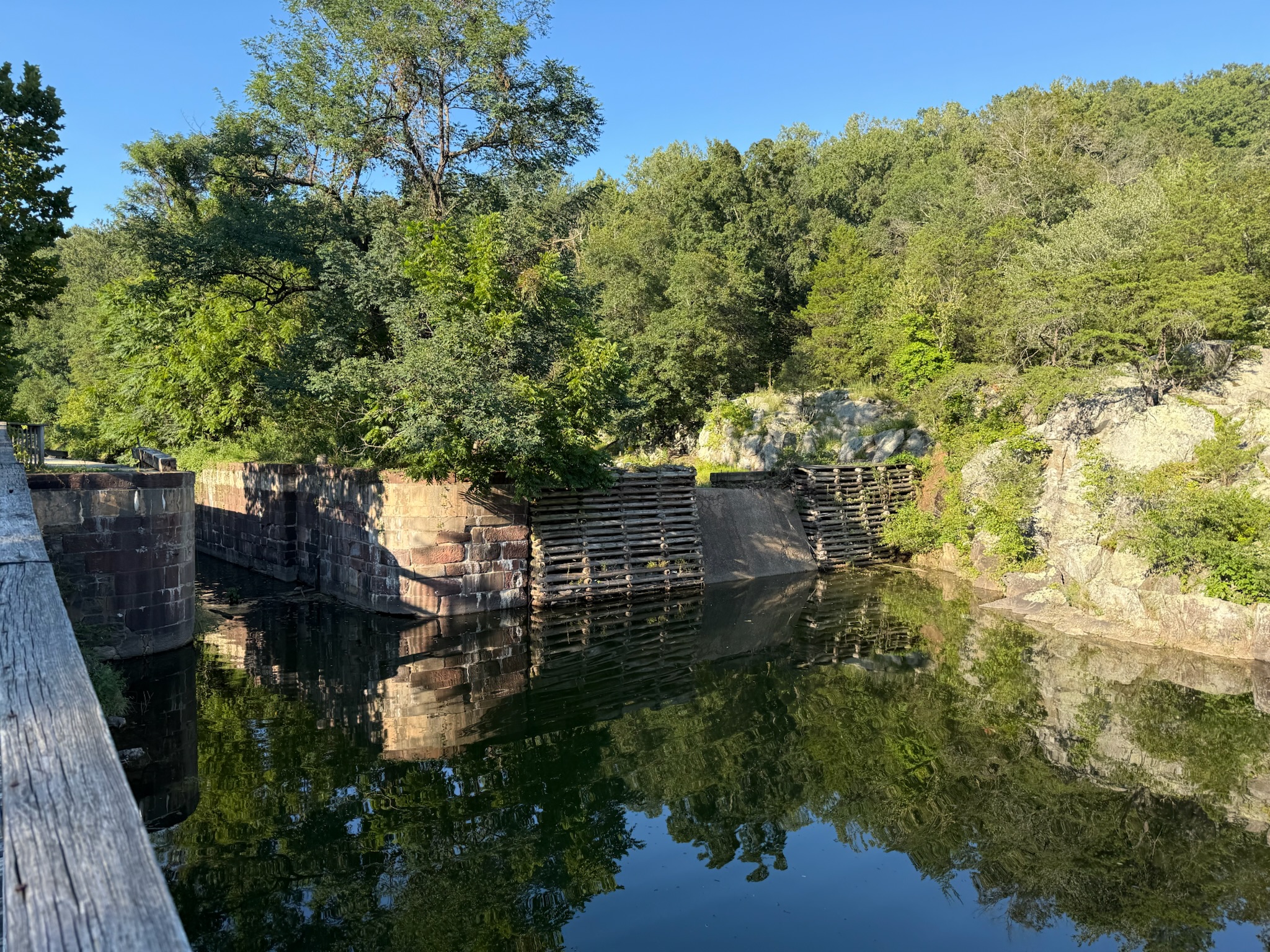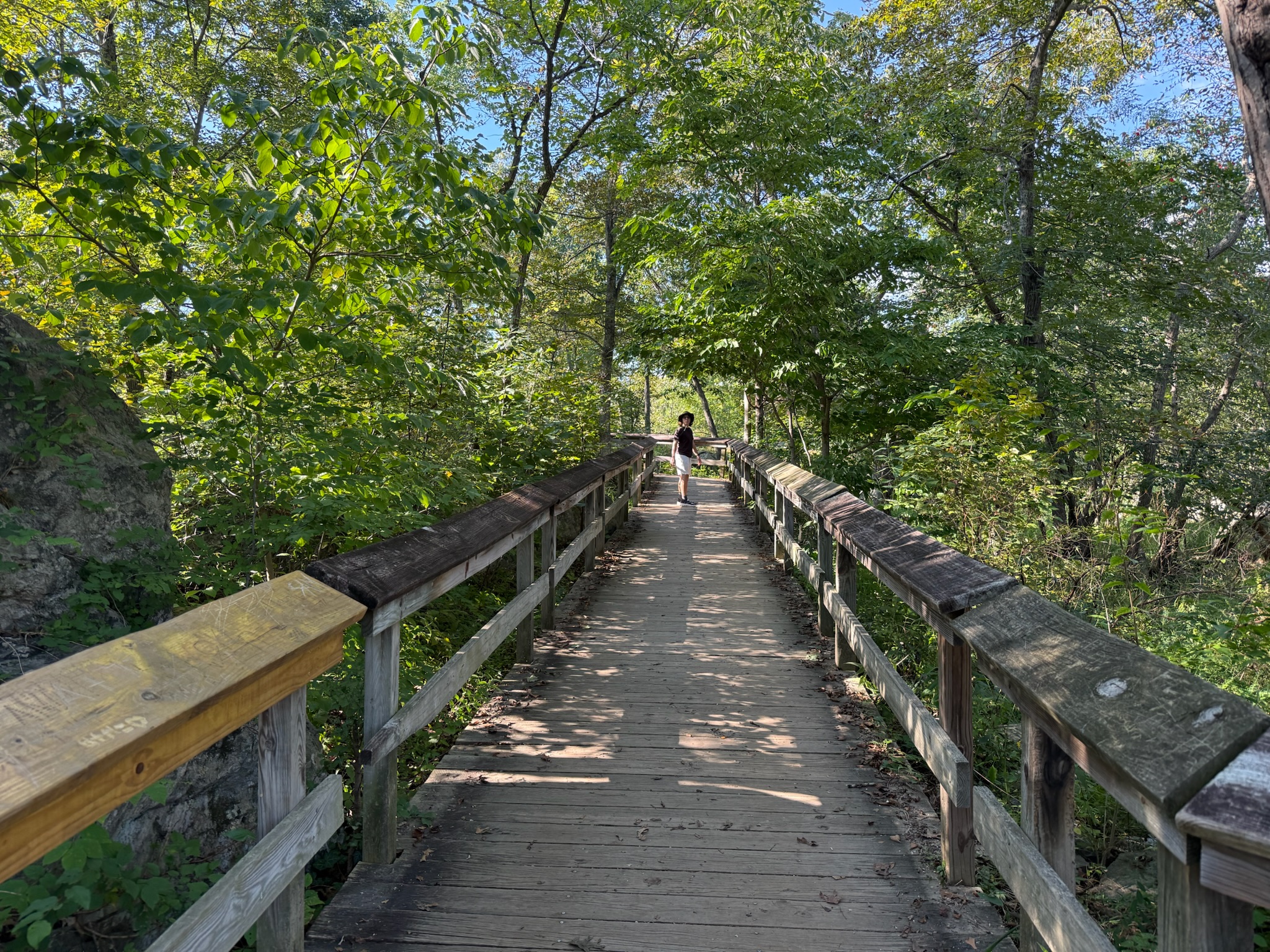We passed another couple of locks, then took a diverging path called The Great Falls Overlook to Olmstead Island. The sign said it was a bedrock terrace forest and was a rare and fragile area. The ground was covered by a wooden walkway.