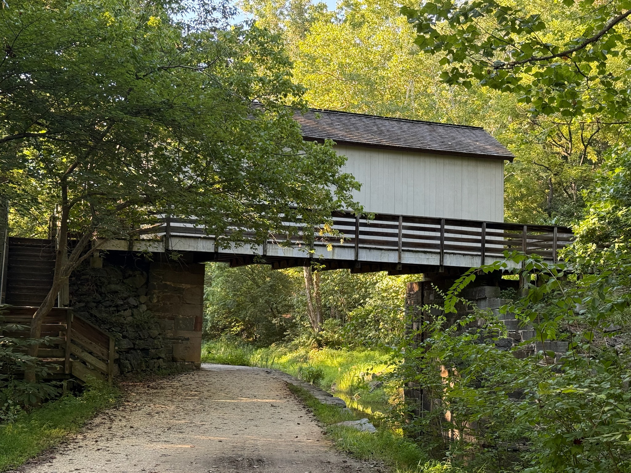 Just beyond the spot those photos were taken was another offshoot trail called Billy Goat Trail that led to Bear Island. The signs said this was a strenuous path, so we skipped it and continued on the towpath. Soon we came to a covered bridge