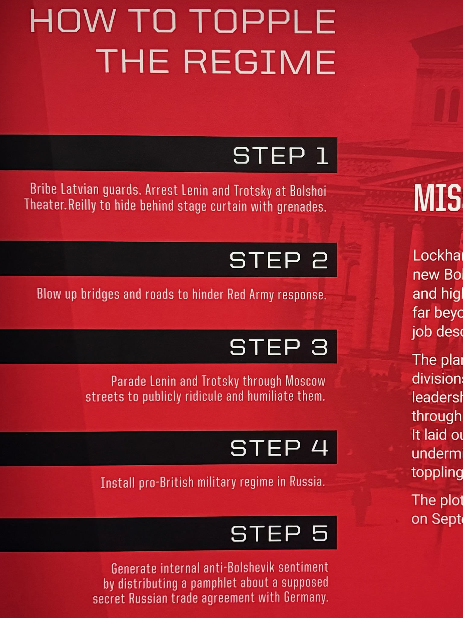 The next section was jaw dropping! The sign said “When governments task intel agencies to secretly undermine a rival’s political or economic system — perhaps by buying votes, bribing candidates, or disrupting trade — the results can change history… The stories here… all are bold attempts to transform the political or economic landscape.”