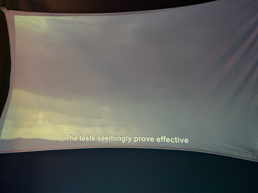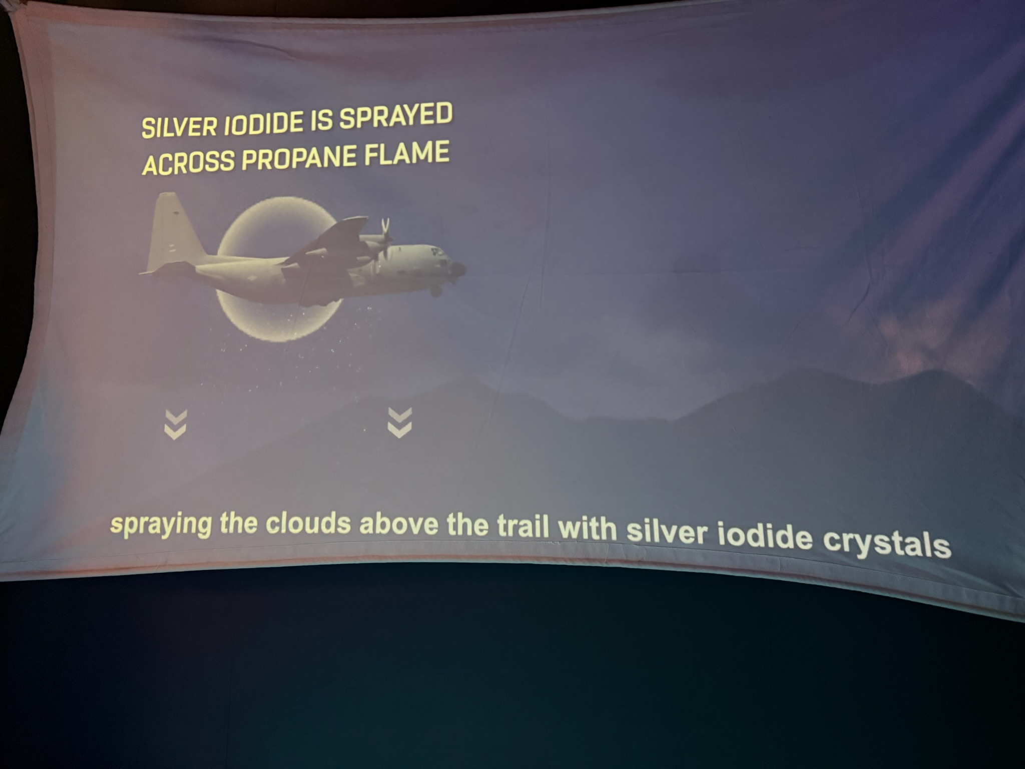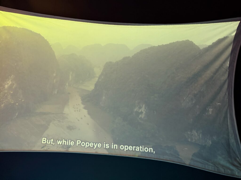 The jaw dropping story: there was a video about the US’s Operation Popeye in the Vietnam War, where they used cloud seeding to modify the weather, extending the monsoon season by 45-days each year. It also made the rains stronger. The hope was that flooded out roads would stop supplies from reaching the enemies. Christi watched the film several times and took photos of the pivotal parts and made a slide show from them: