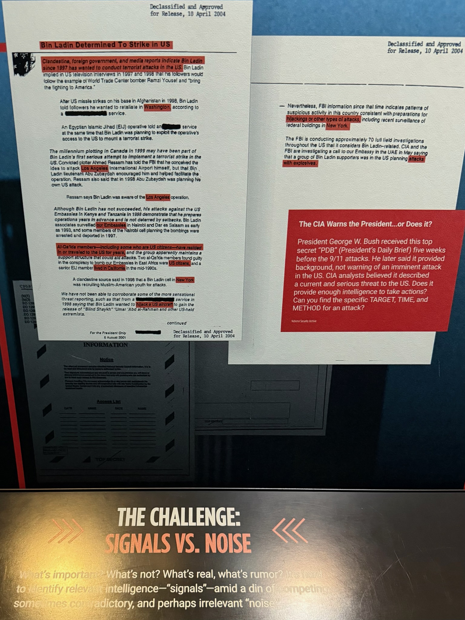 The next exhibit was about the September 11, 2001 terrorist attack on the World Trade Center. There was a copy of the report titled “Bin Laden Determined to Strike in US” that was given to then President George HW Bush on August 6, 2011. Several other reports were also displayed that were prepared by intelligence agencies warning of Al Qaeda threats, particularly involving planes. The signs basically said that it was a failure of imagination; the US leaders didn’t take Al Qaeda seriously because they couldn’t imagine they were a real threat without a sophisticated military. The signs said that then US Defense Secretary Donald Rumsfeld immediately blamed Saddam Hussein and Iraq because he simply couldn’t believe Al Qaeda could pull off a complex attack without Hussein’s help. It felt like this display was trying to emphasize that the intelligence community did its job — the failure wasn’t with the intelligence, it was with the leaders who disregarded the intelligence.