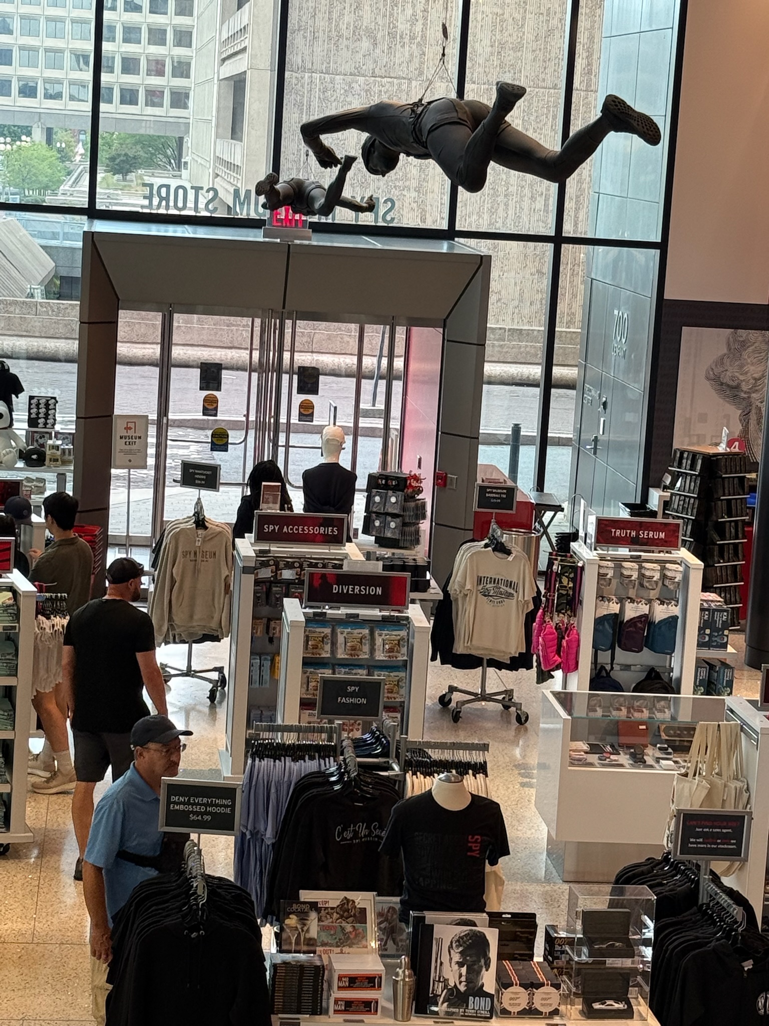We had to exit through the store. It was actually a really big store with all kinds of interesting things related to spying, including a large book section with fictional and non-fictional works. There was even a big kids/teen book section. There was one small exhibit in the store: one of the motorcycles used in the actual filming of Mission Impossible II.