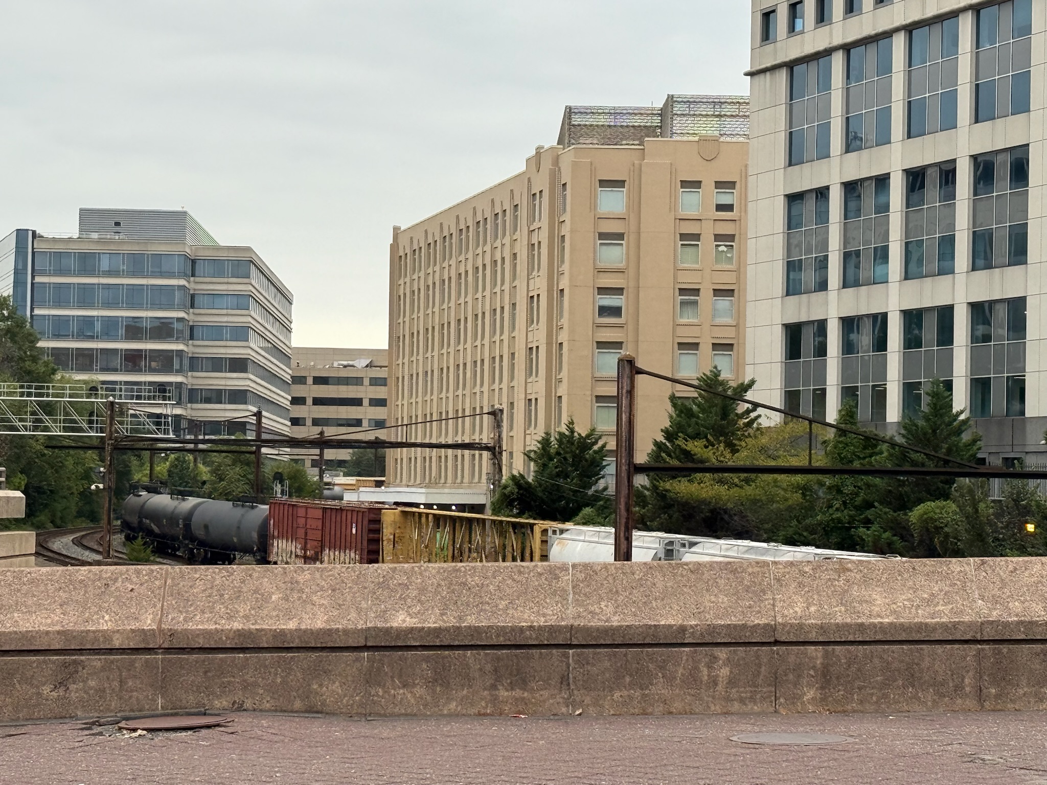 We saw a train going under the bridge. The railroad tracks were barely noticeable between the tall buildings.