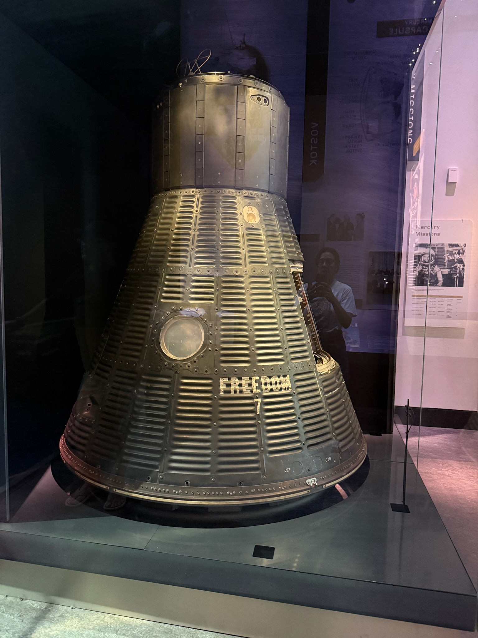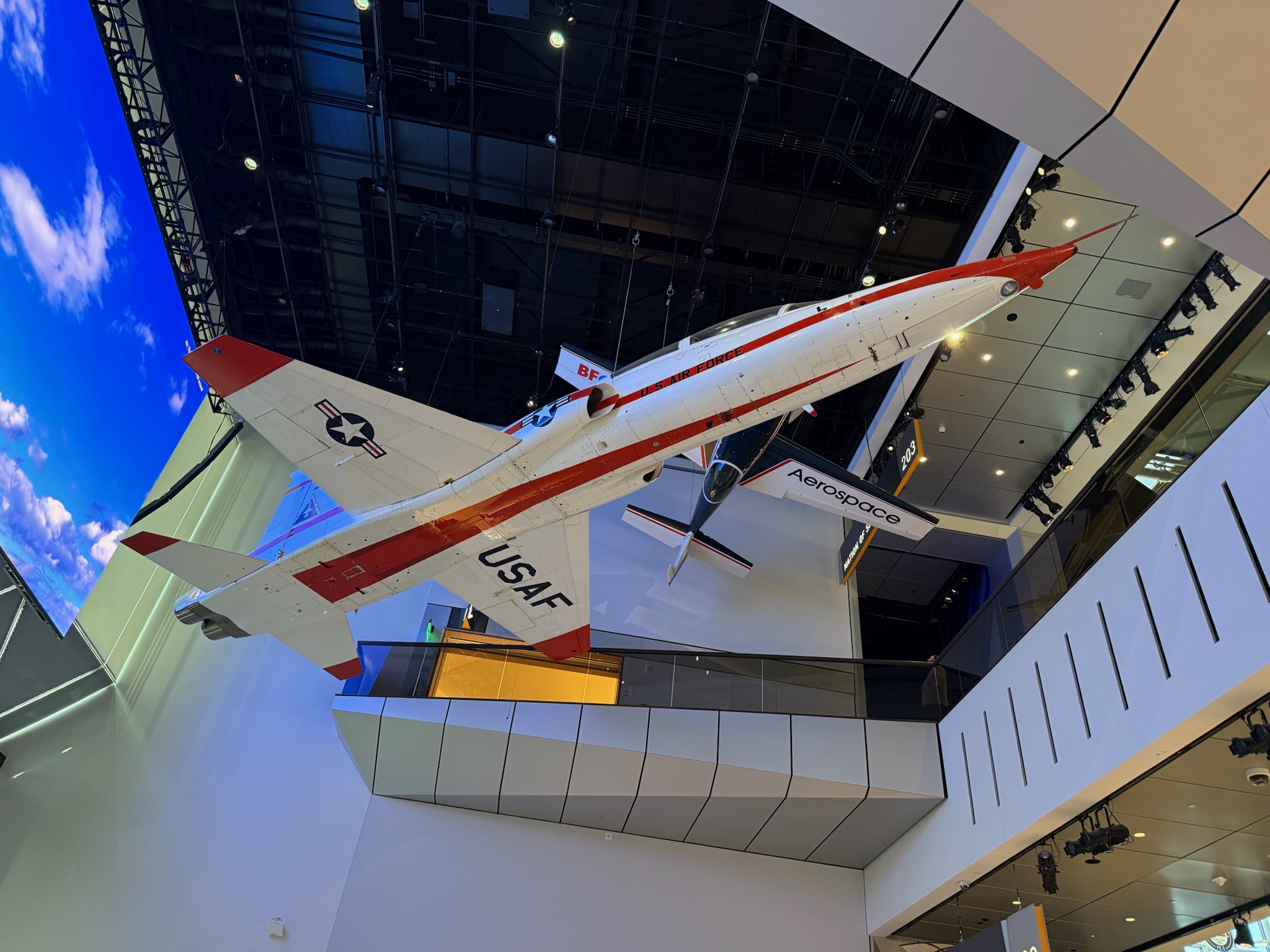 continued… we were already starting to feel like our brains were full. Realizing we couldn’t see the whole museum today, we headed upstairs to the rooms that we wanted to see the most. This Northrop T-38 was hanging over the stairwell. Jacqueline Cochran set eight world records in this jet. At the time of her death in 1980, she had broken more speed, altitude and distance records than any other pilot — than 200, including breaking the sound barrier. Fun fact – she emphasized her femininity and had a line of cosmetics called Wings to Beauty!