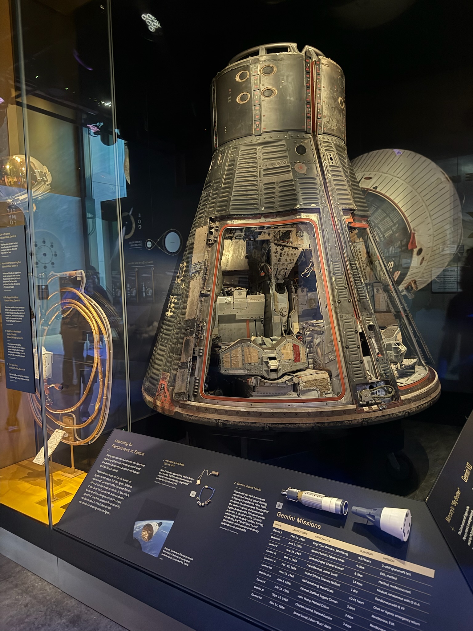 The moon landing mission was called Apollo. After figuring out the logistics and physics involved to make Apollo happen, NASA realized that they first needed to do some research on things like how to live in space. They also needed to do some practice runs on things such as walking in space and linking up the lunar lander to the main rocket in space. To do accomplish the research/practice, NASA created the Gemini program as the precursor to the Apollo program. Gemini ran several missions where they sent crews of two astronauts out into space. In June 1965, on Gemini IV, Edward White became the first American to walk in space (the first person to walk in space was Soviet Alexei Leonov in March 1965). In March 1966, Neil Armstrong commanded the Gemini VIII mission and made the first successful docking in space. This was a Gemini capsule.