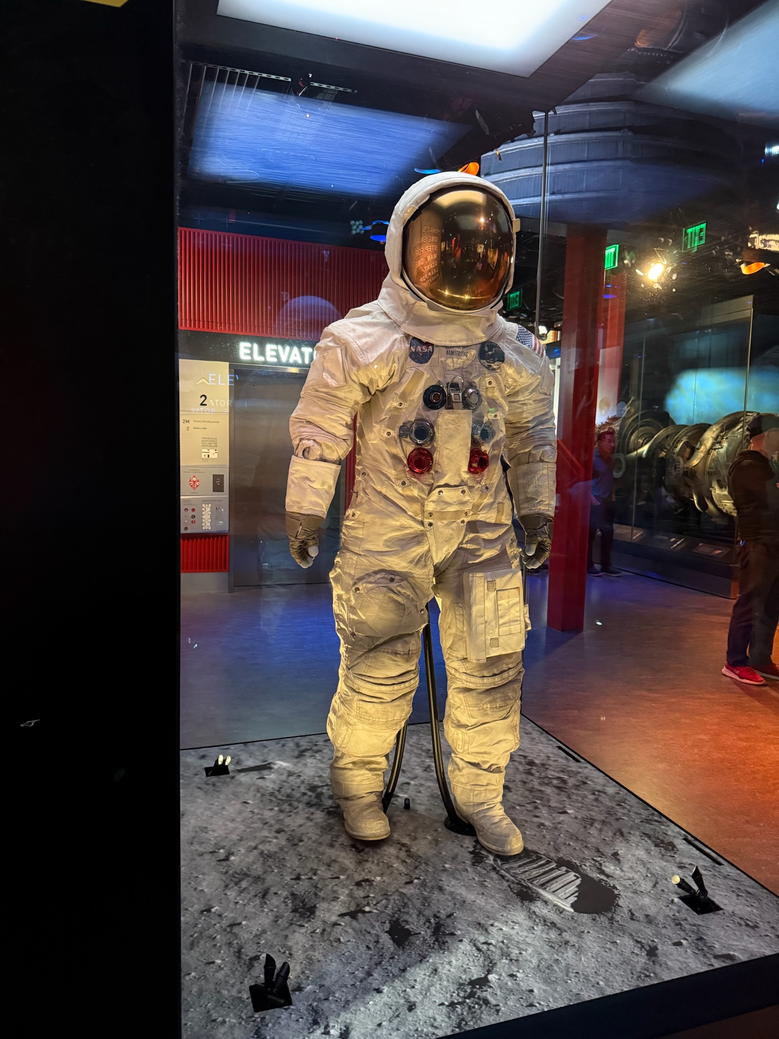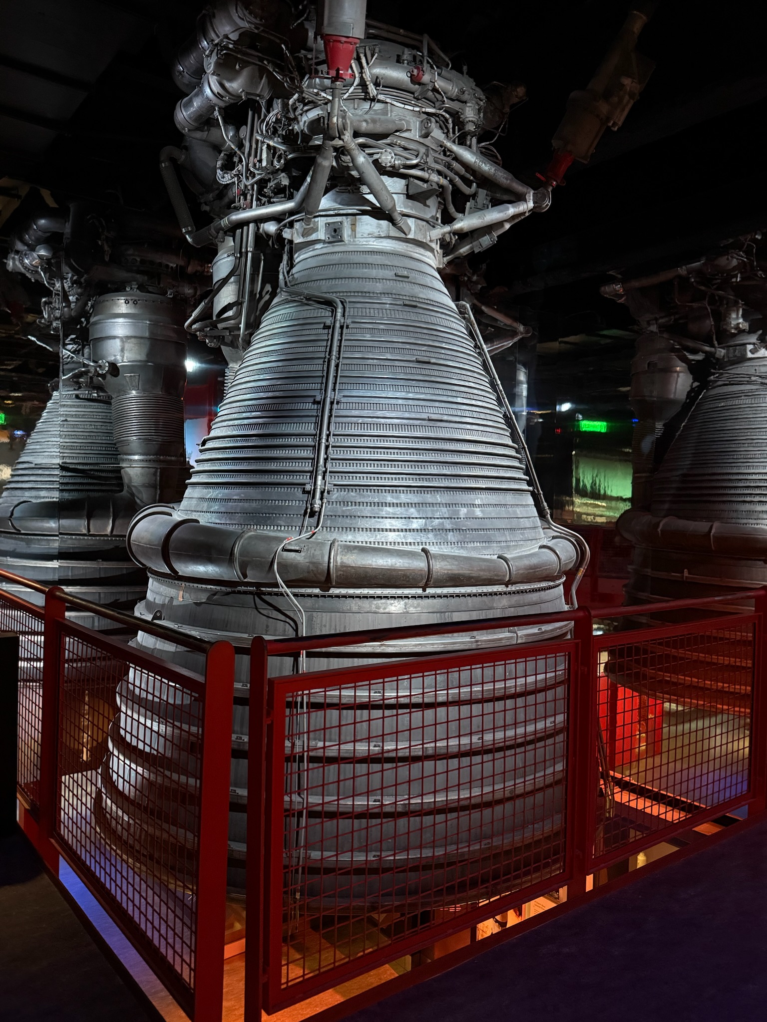 Neil Armstrong became the commander of Apollo 11 mission, which made the first moon landing in July 1969. The rocket that they used for this mission was called the Saturn V, which was powered by five Rocketdyne F1 engines. This is a piece of a F1 that was put up against mirrors so it looks like multiple complete engines (the goal being to give visitor’s a better sense of what the actual 5-engine rocket had looked like).