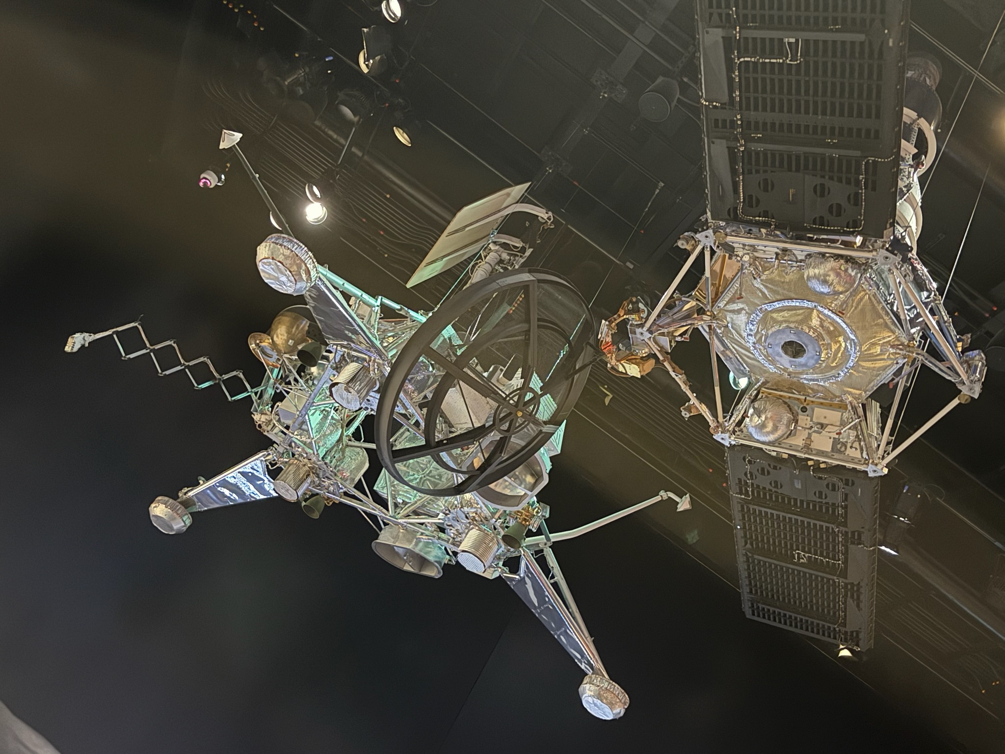 Meanwhile, the Soviets were still beating the US to important milestones. The first robotic spacecraft to land on the moon was Soviet Luna 9 in February 1966, beating the US’s Surveyor 1 by four months. Surveyor 1 analyzed the composition of the soil, proving the surface was solid and could support the weight of the spacecraft and astronauts. The Soviet Luna 10 entered the moon’s orbit to capture images of the dark side of the moon in April 1966, beating the US’s Lunar Orbiter One by four months. The US also launched Ranger spacecraft to take images, as well. We think these are replicas of Ranger and Surveyor, but we’re not 100% sure.