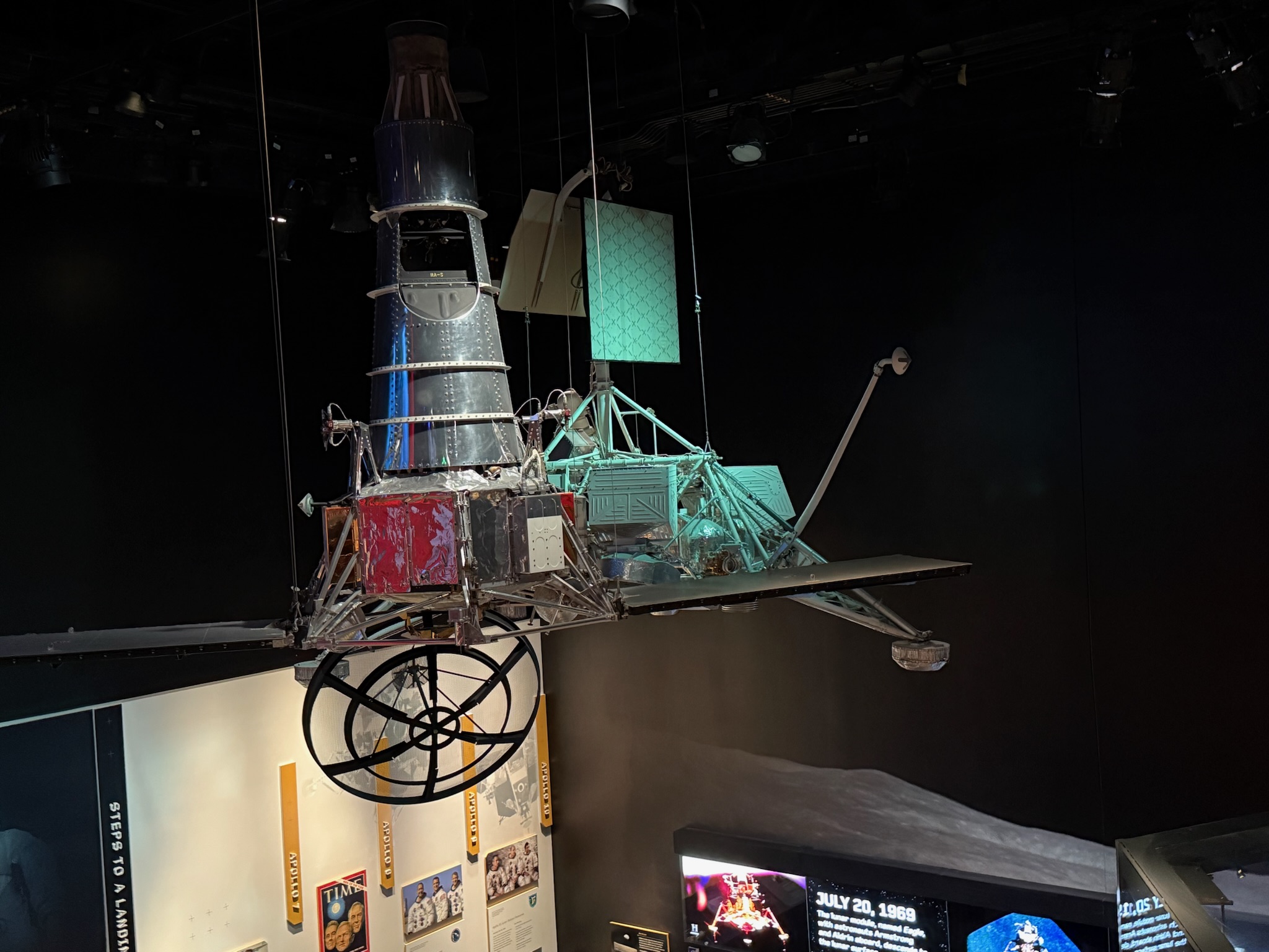 From there, there were small displays about subsequent moon landings and surveillance. Apollo 12 also landed on a flat site. Apollo 13 failed because an oxygen tank exploded en route to the moon, forcing the astronauts to return to earth. Apollo 14 landed on a slightly rougher, more scientifically interesting area. Apollos 15, 16 and 17 had astronaut driven rovers and lunar modules. With better gear, and more confidence about their ability to safely land in more diverse landscape, the last three missions went to rougher terrain that they thought would yield better scientific results. This was the Lunar Roving Vehicle used in the last three missions. It was was battery powered, could go in forward or reverse, was operated with a hand controller instead of a steering wheel, and was stored folded up during the flight and unfolded/deployed on the ground.