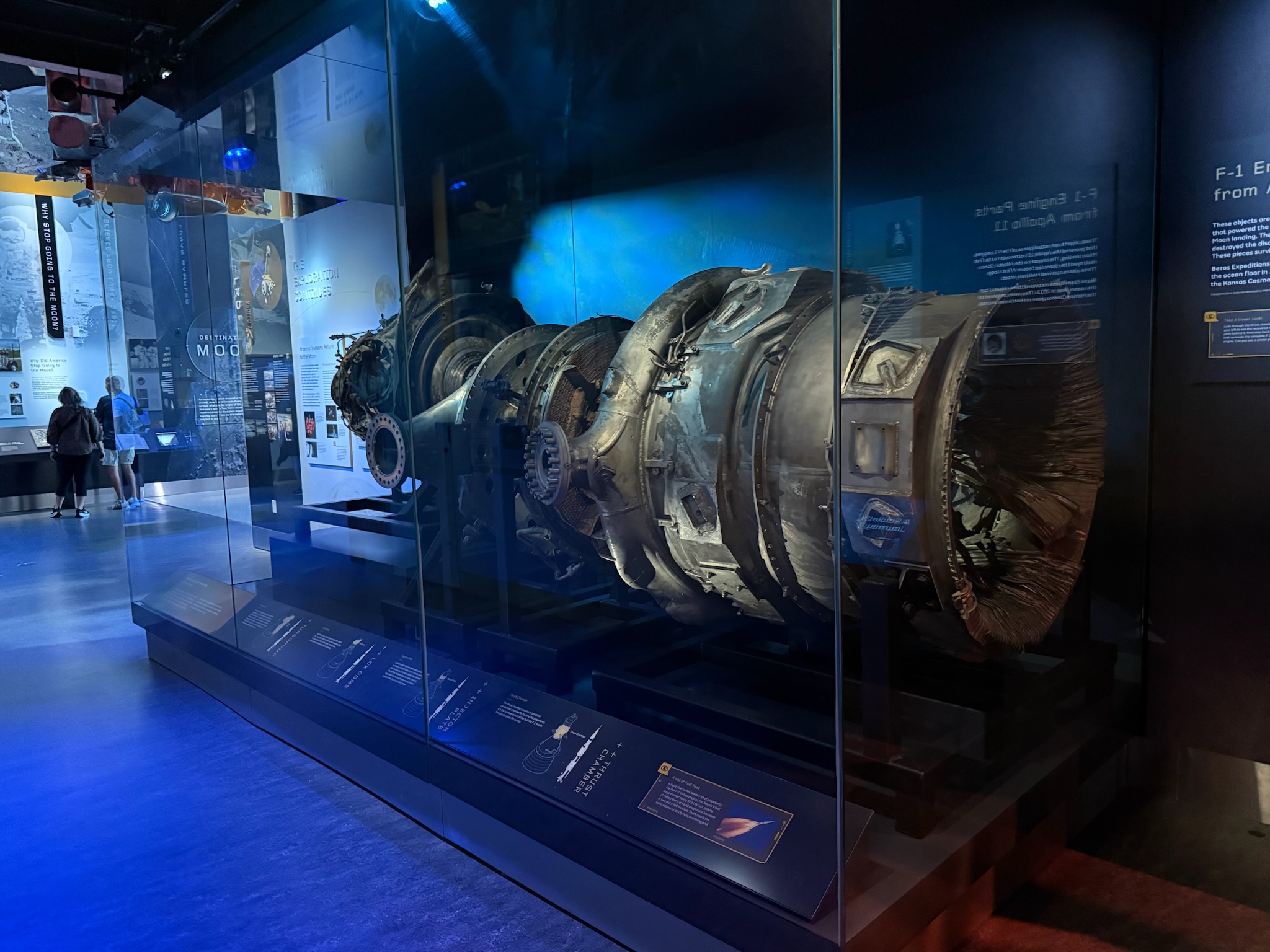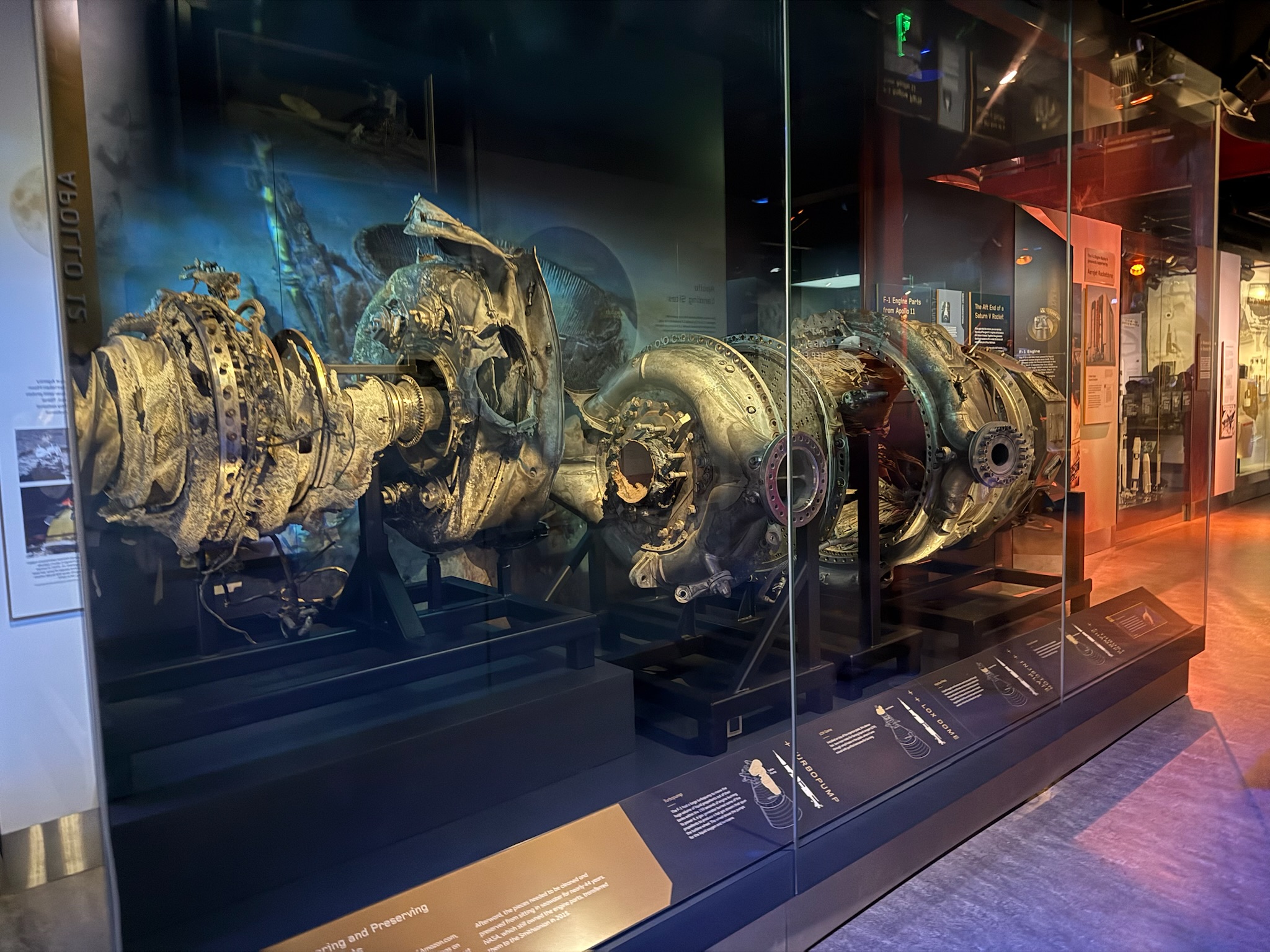 According to the signs, in 2013, Jeff Bezos funded a mission to find and salvage the burned up ruins of the Saturn V rocket. He gave the remains to NASA and NASA donated these two engine segments to the Smithsonian.