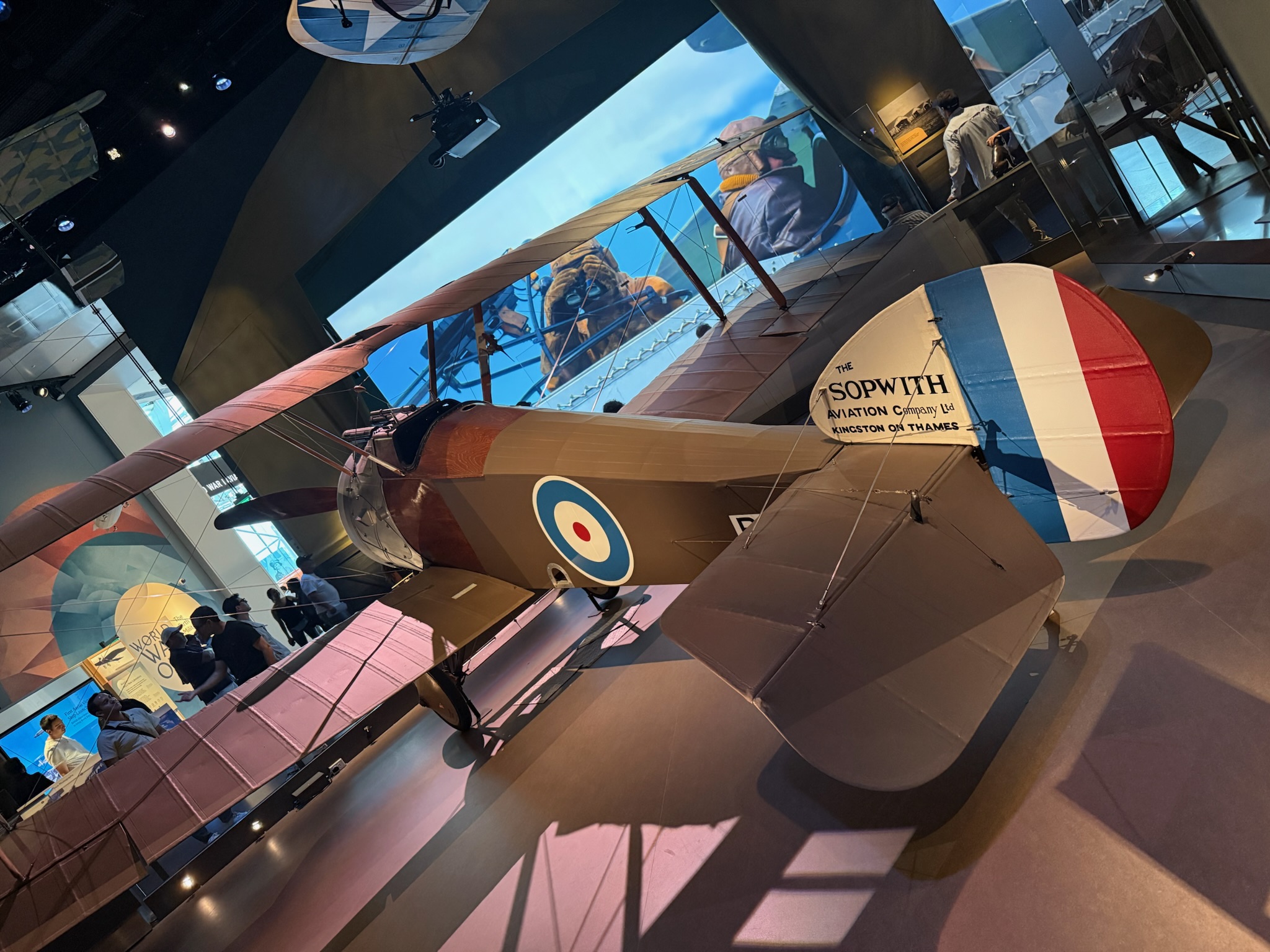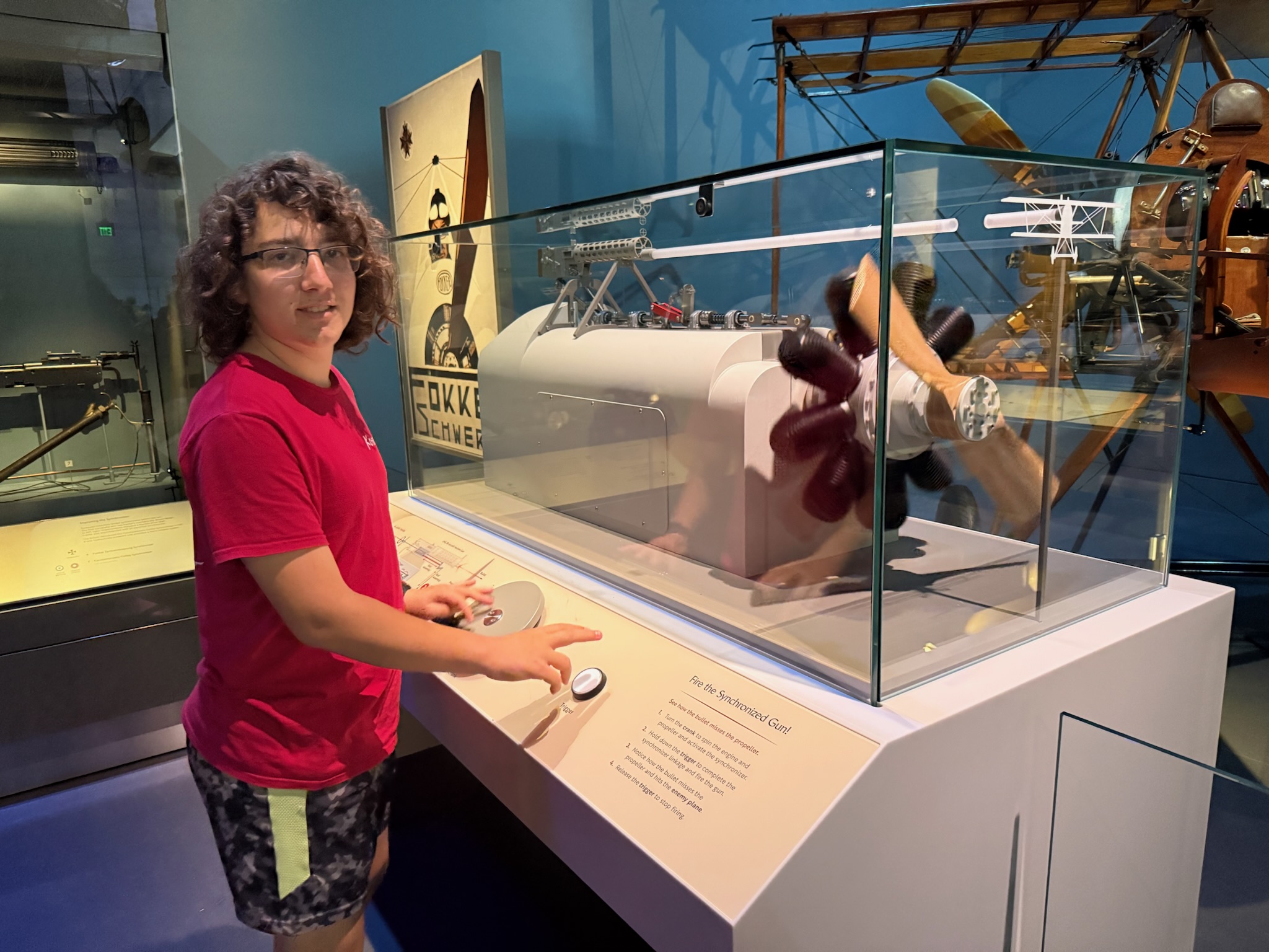 Once we finished at the Destination Moon room, we went down the hall to the WWI Aviation room. We were delighted when our friends from Blue Heeler joined us! As we mentioned in the Wright exhibit, between 1908 – 1916, the new aviation technology took off like wildfire and advanced quickly. With the advent of the war, airplanes became important tools/weapons — scouting for enemy troops/vehicles, dropping supplies for allies, and dropping bombs on enemies. Each country added aviation units to their navies and/or armies that started small and rapidly expanded.