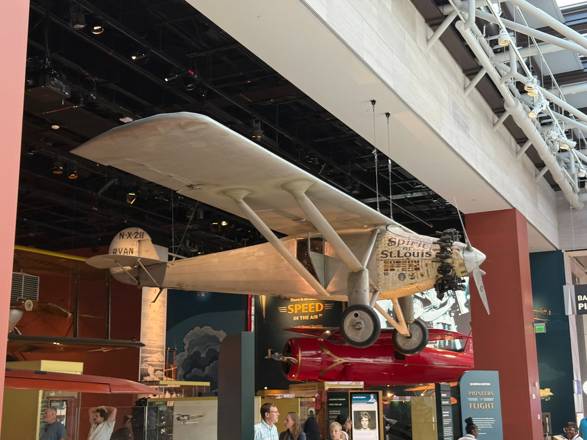 The next room we went to was called Pioneers of Flight. One of the first planes visible from the entrance was The Spirit of St. Louis. We’d also learned about the plane on the Air & Space Museum tour we went on in San Diego. This plane was built in San Diego (where the current airport is, hence the name Lindbergh field!) in 1925 – 1926 by Ryan Aeronautical. A second back-up plane was also built. In 1927, flown by Charles Lindbergh, it became the first plane to fly non-stop from New York to Paris. The flight took roughly 34 hours and the plane was flying so low that it was mostly skimming the water. It had no windshield, so Lindbergh looked out the side window and used a periscope. This successful flight led to the expansion of commercial aviation.