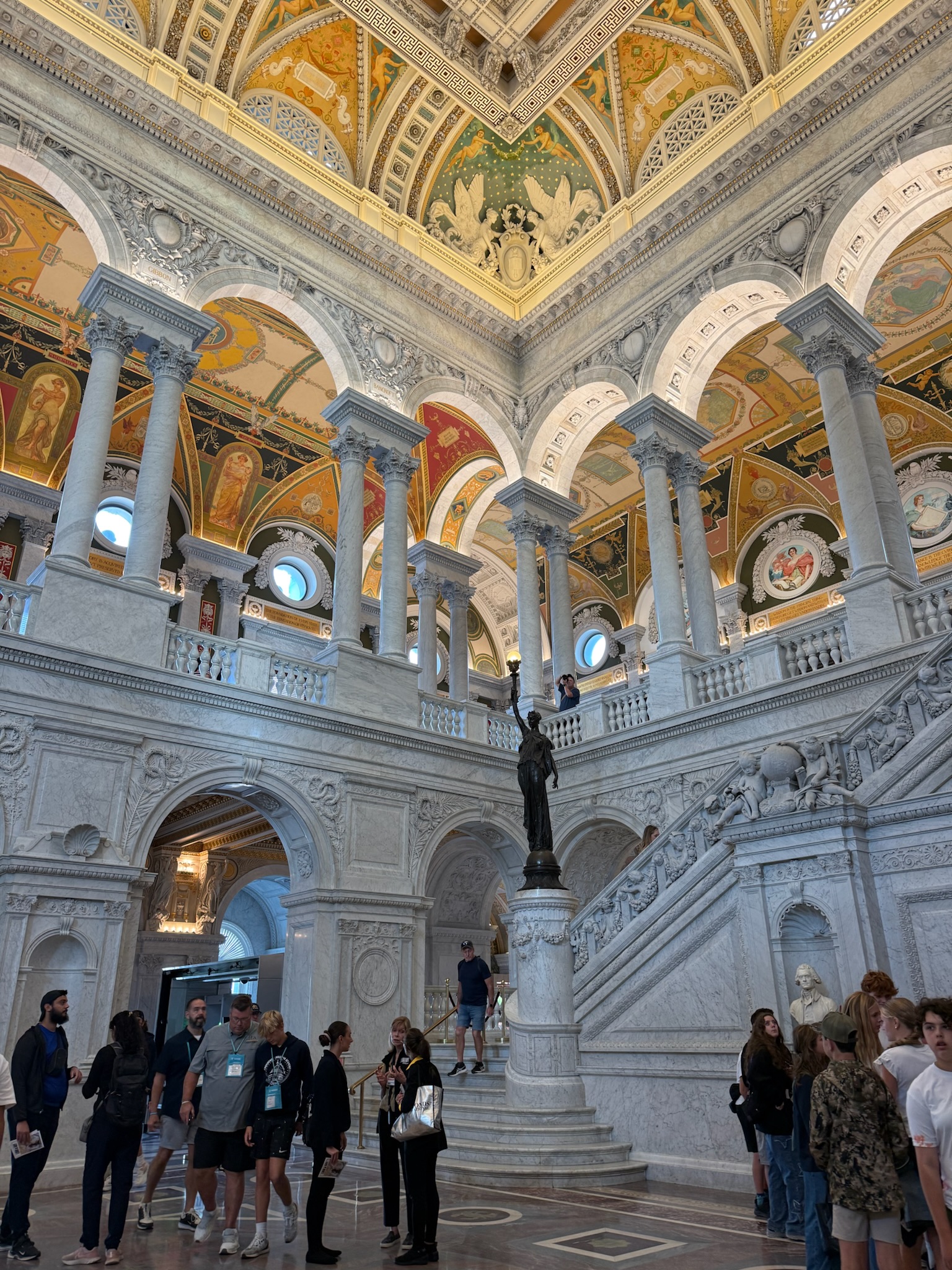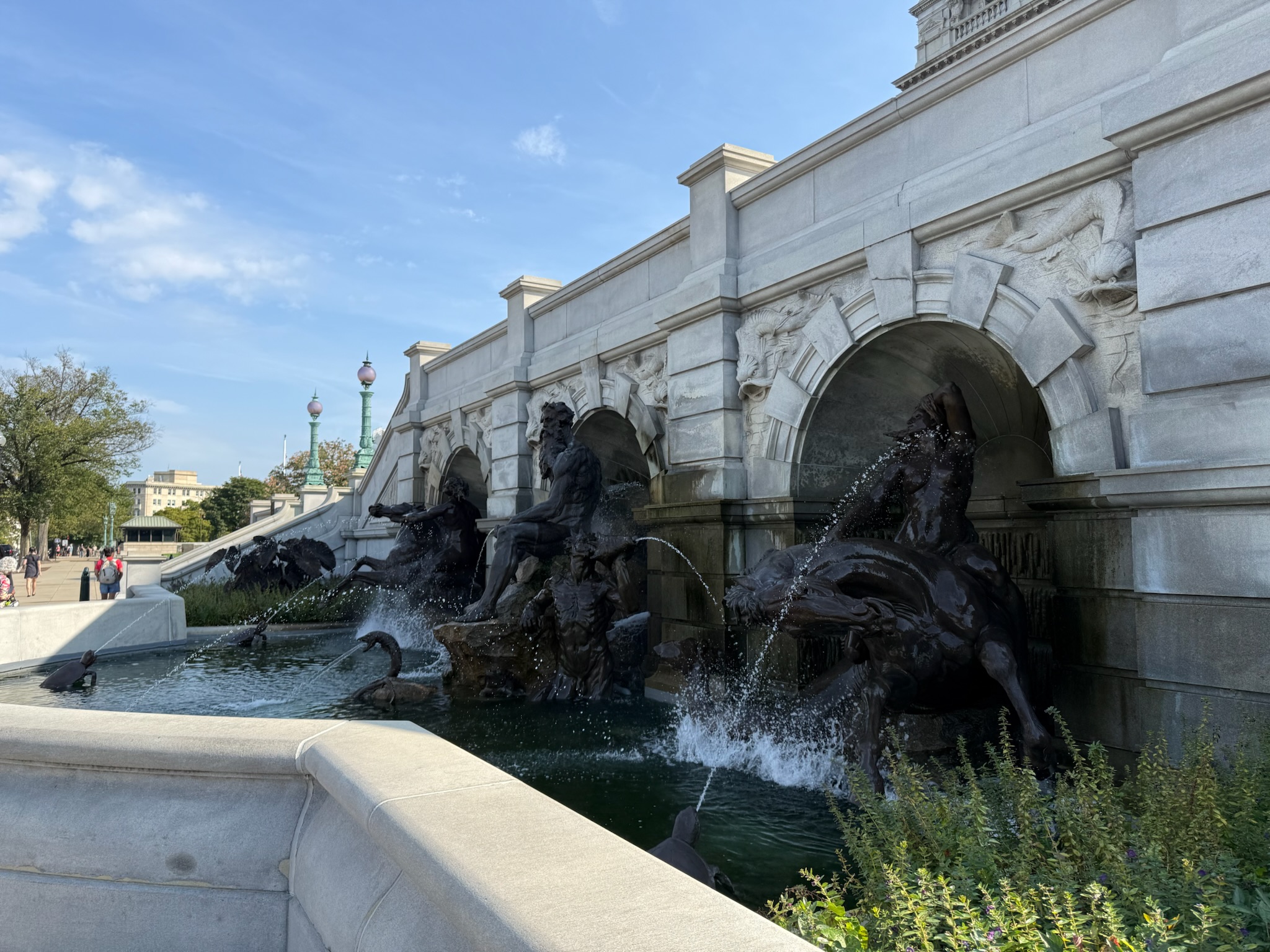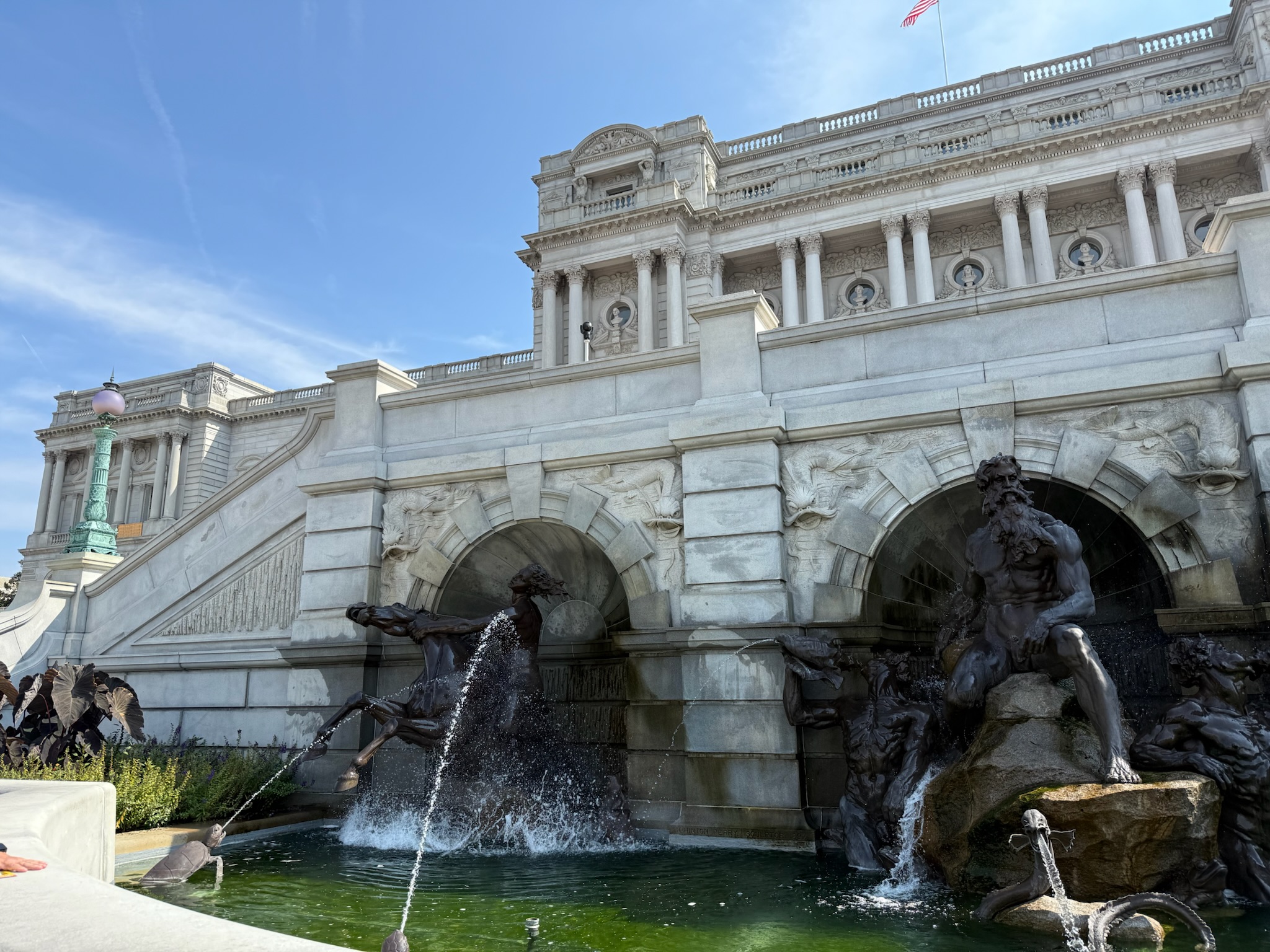 We walked north past the construction zone to the next intersection. A sign indicated that the Jefferson building of the Library of Congress was just ahead. There were apparently several more Library of Congress buildings, which makes sense since it was currently the largest library in the world. The Jefferson building was the original building, and the one that was open to the public. The ground level had a large fountain with multiple statues.