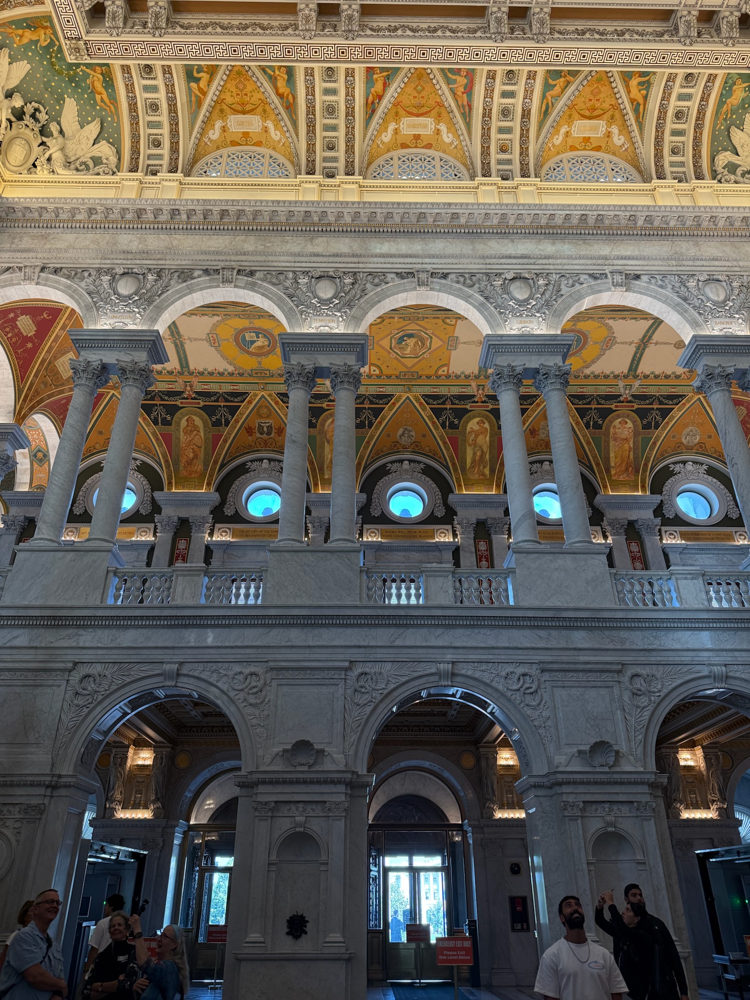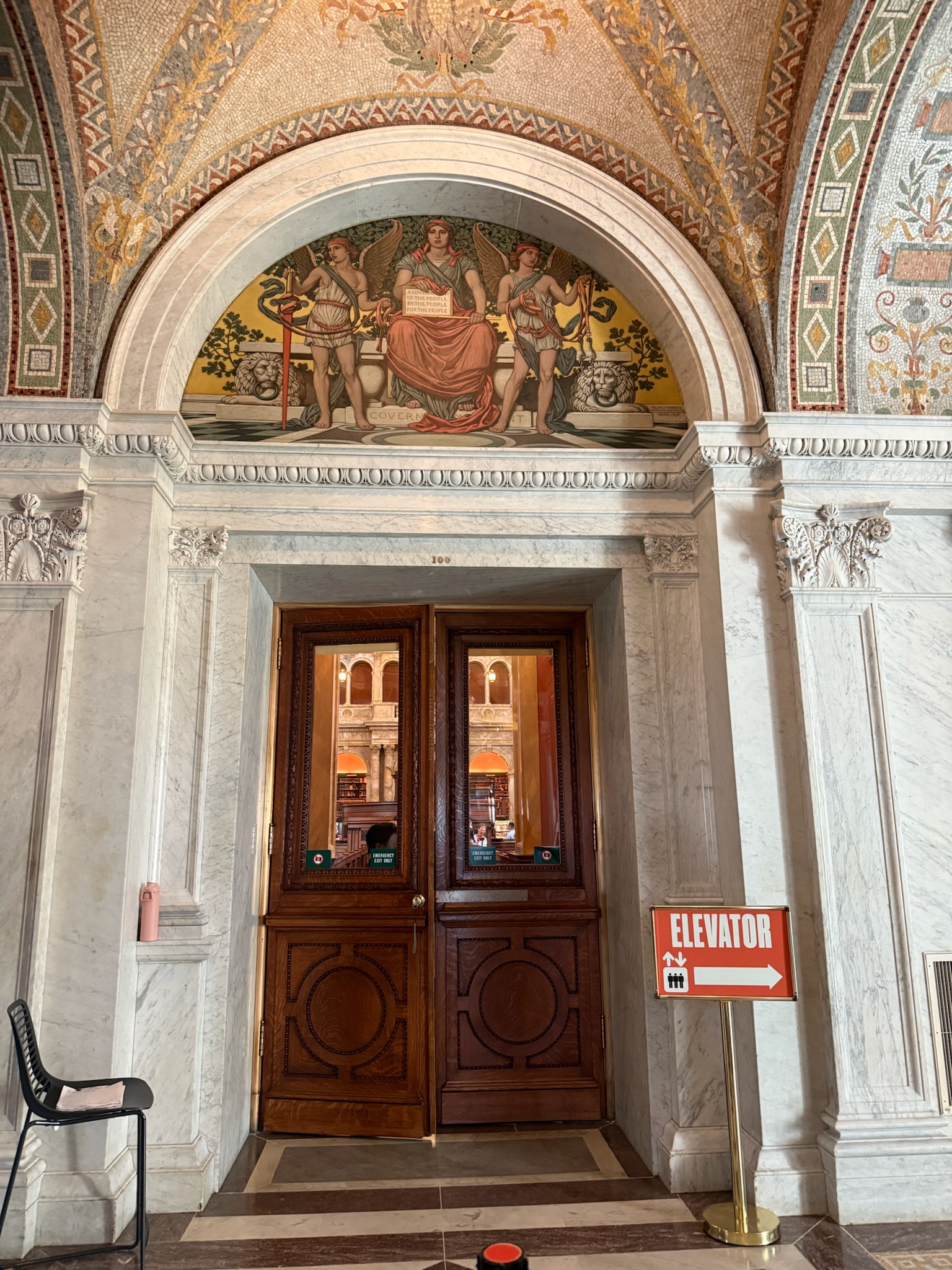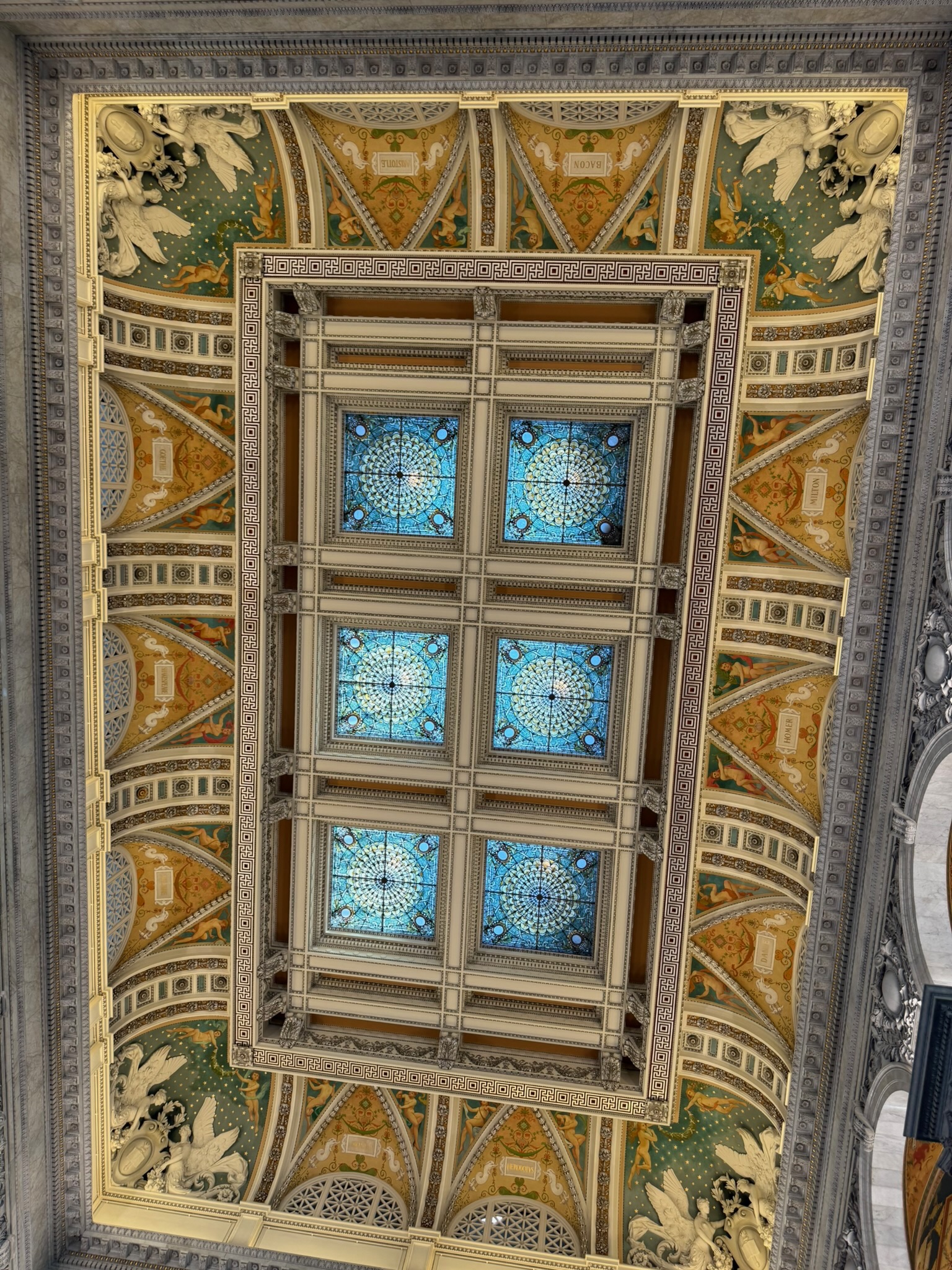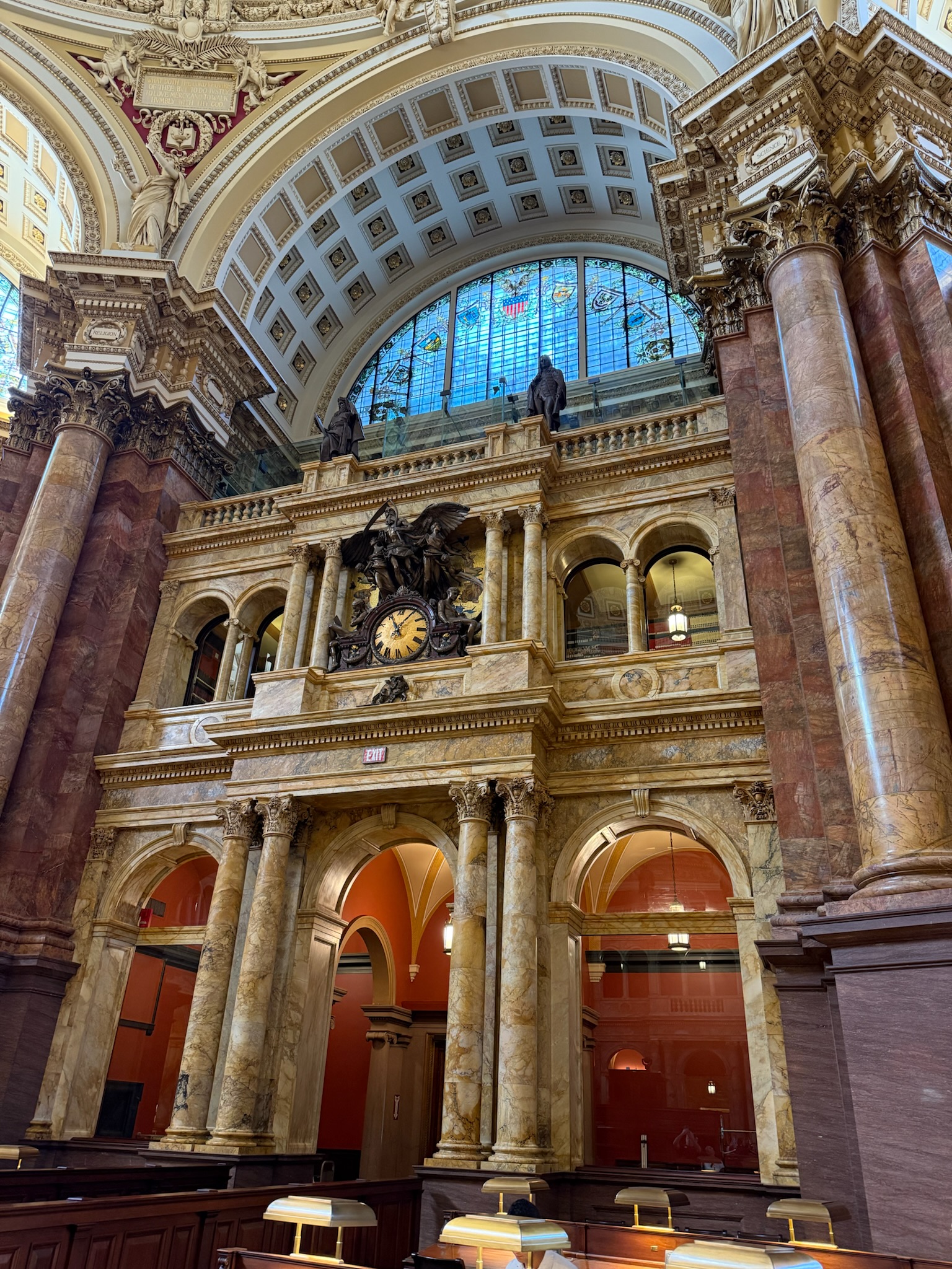 As we neared the front of the line, we saw the entrance being used was through a side door on the ground floor, not the main entrance in the photo above. When we got to the front of the line, they scanned our tickets and quickly inspected Christi’s purse before waving us inside. We followed the crowd up an escalator to the first floor. The building was gorgeous. Elaborately decorated in the style of Italian renaissance, it looked more like a European palace than a library.