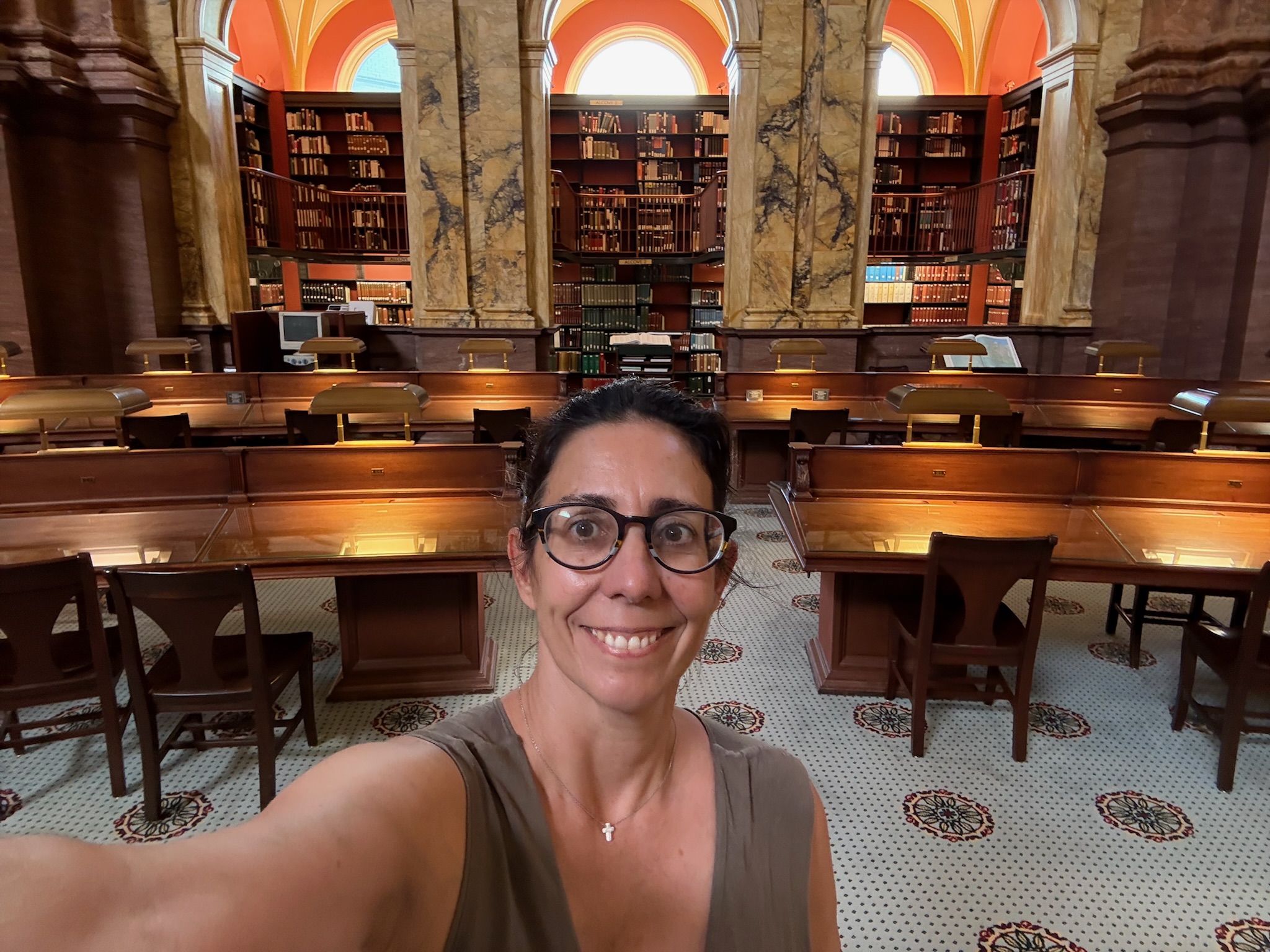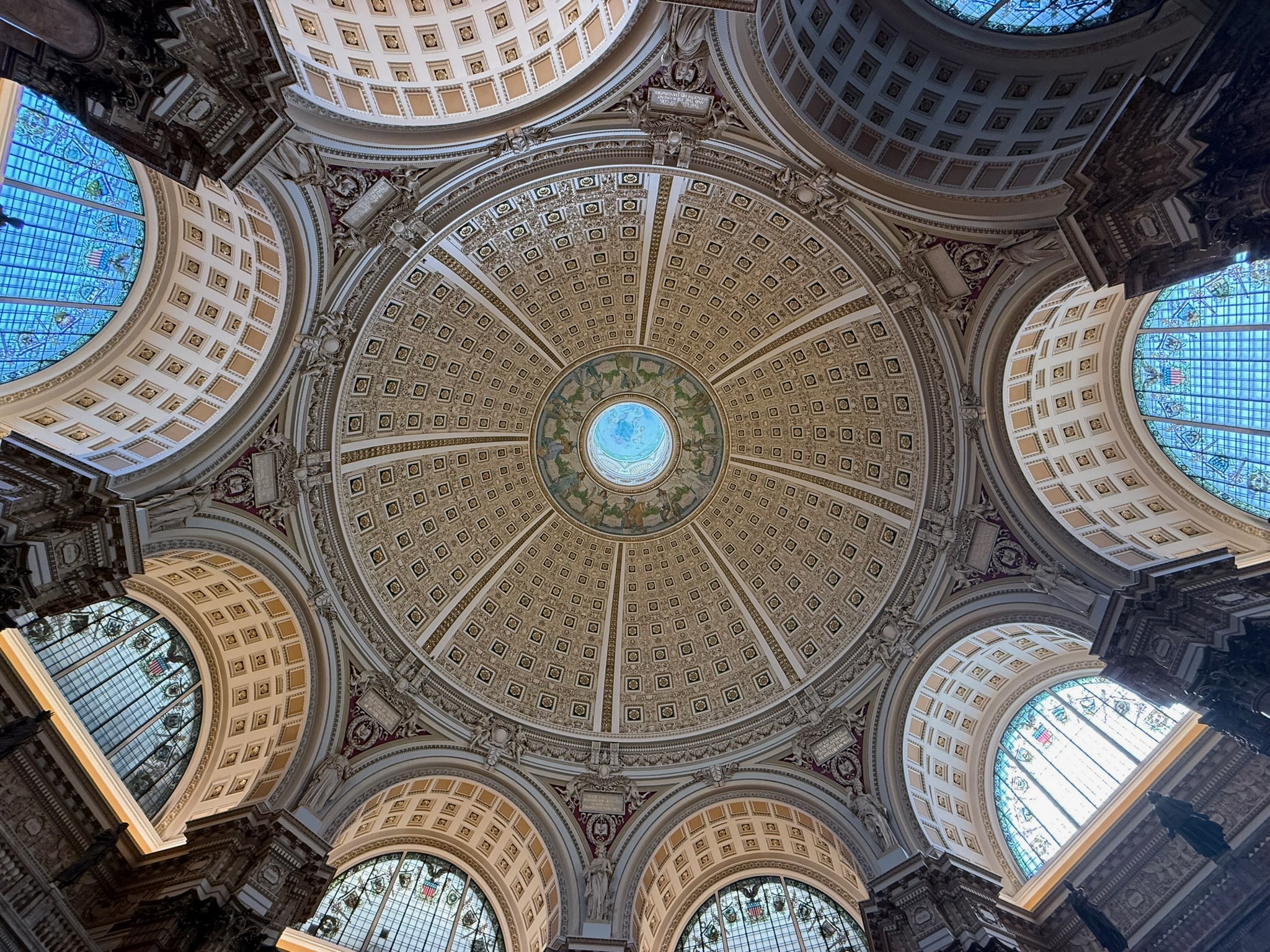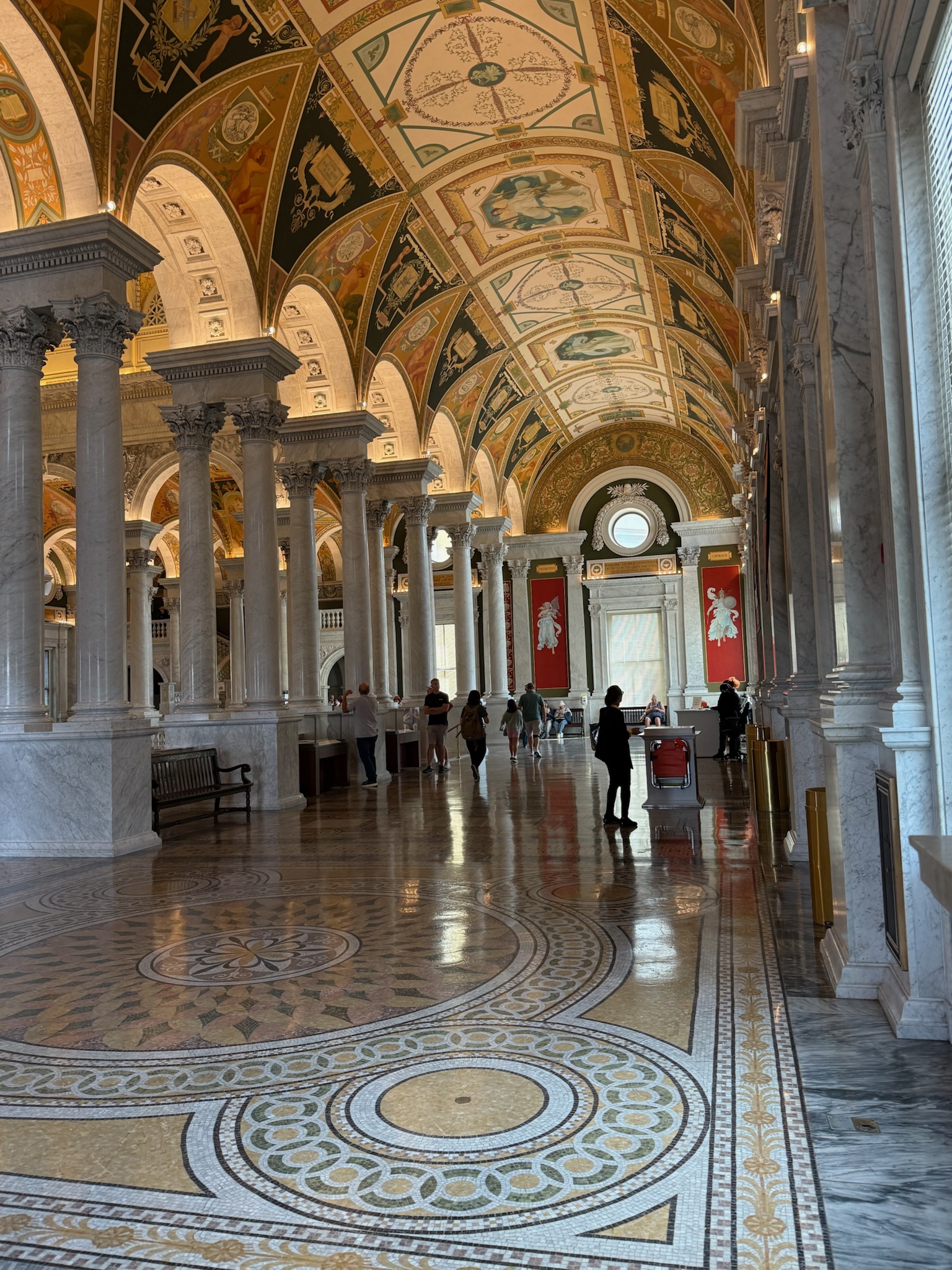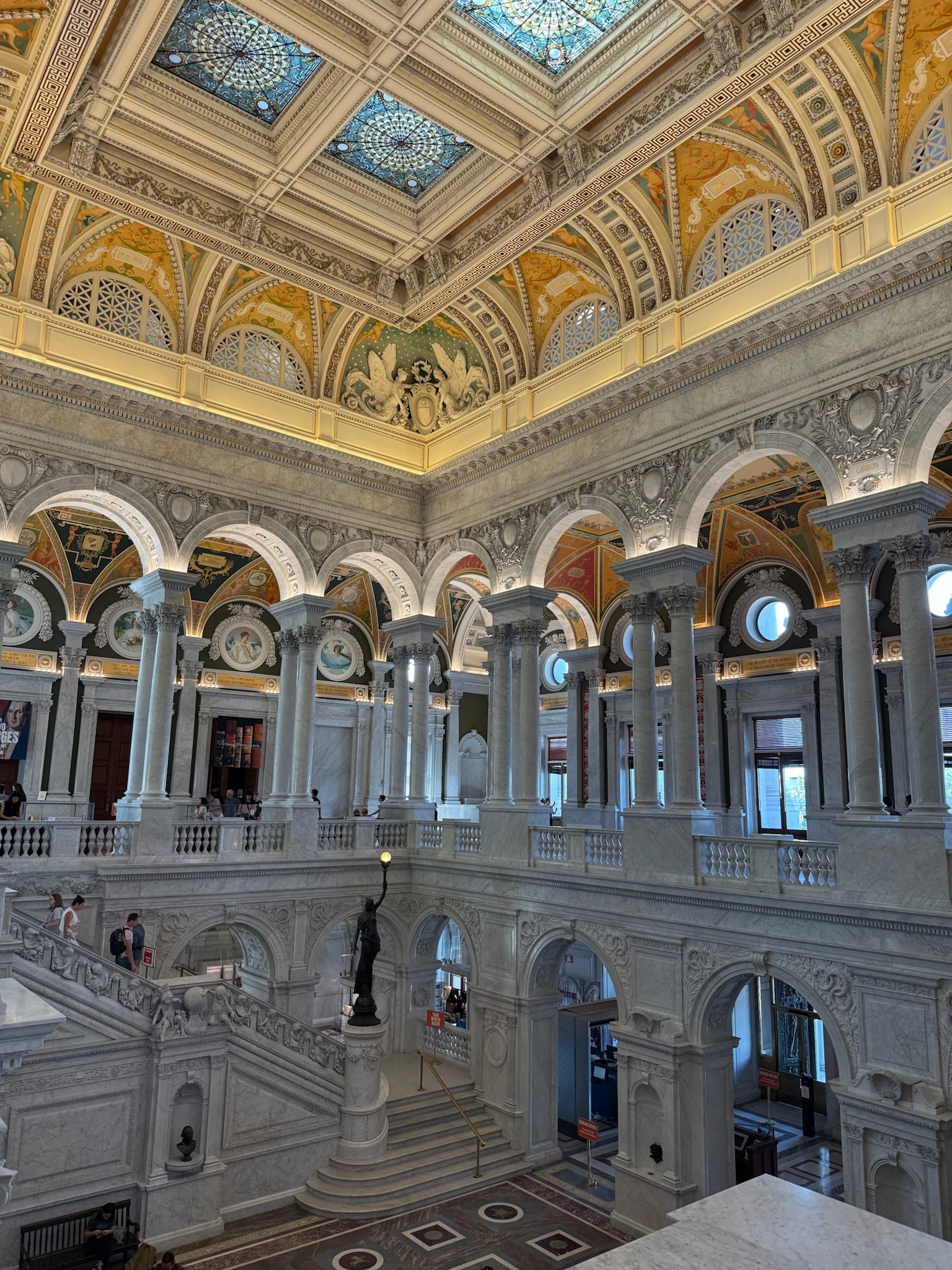 As we neared the front of the line, we saw the entrance being used was through a side door on the ground floor, not the main entrance in the photo above. When we got to the front of the line, they scanned our tickets and quickly inspected Christi’s purse before waving us inside. We followed the crowd up an escalator to the first floor. The building was gorgeous. Elaborately decorated in the style of Italian renaissance, it looked more like a European palace than a library.
