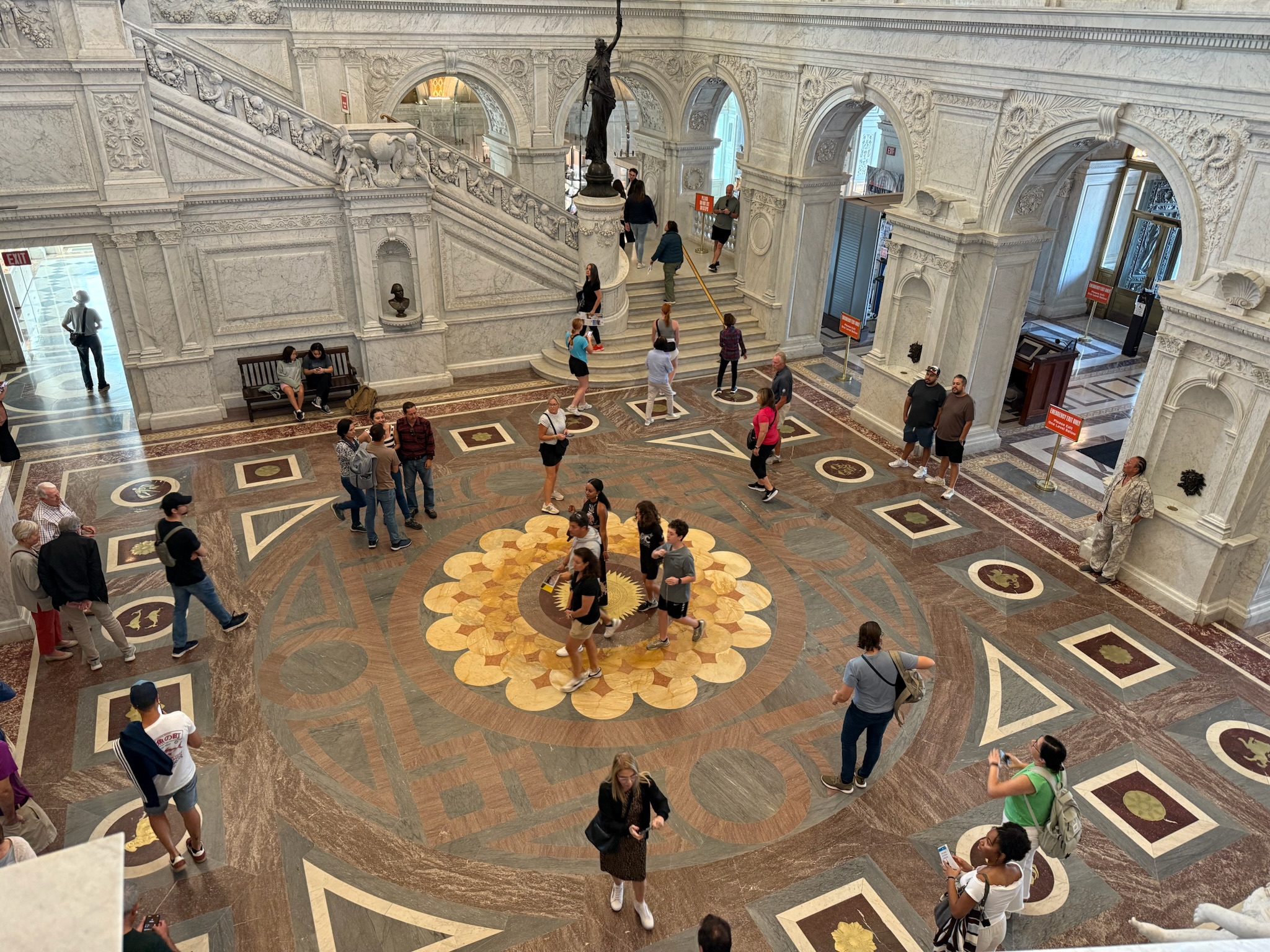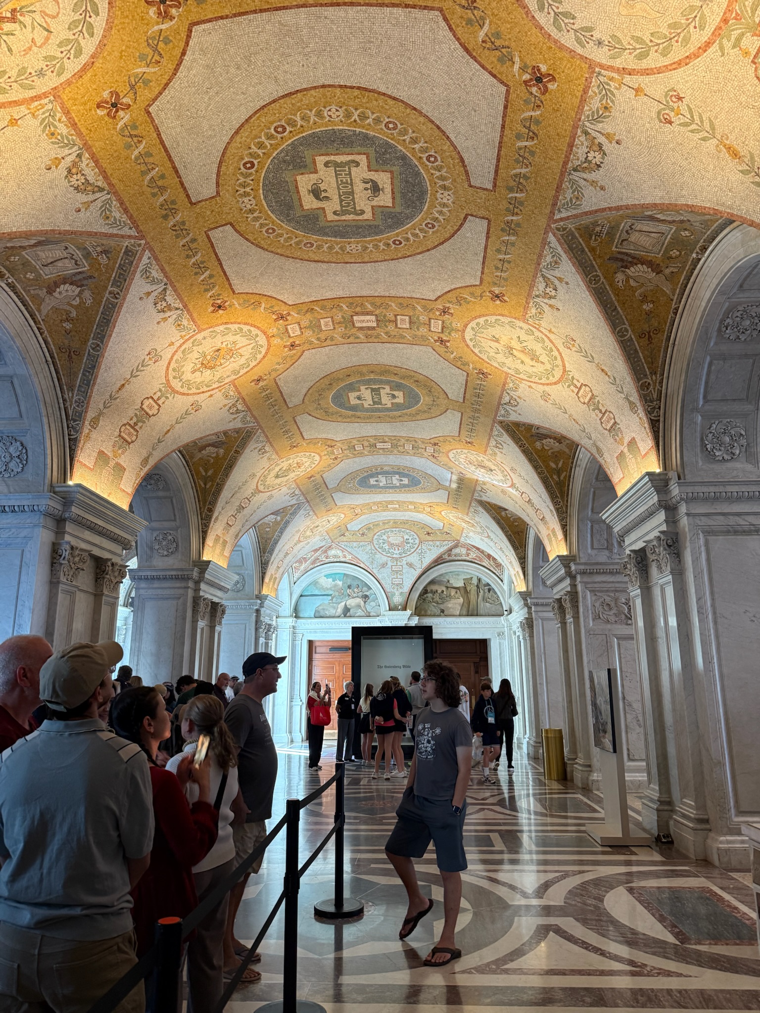 Near the entrance/exit of the Main Reading Room was a copy of a Gutenberg Bible. As Keith had learned in school last year, in 1455, Johann Gutenberg introduced the printing press in Germany. Prior to that, all books were hand written and few were produced. The ability to (relatively) easily print up many copies of books revolutionized society, leading to the renaissance as more people learned to read and became educated. 180 copies of this bible were printed; less than 50 still exist today and only 21 of them are complete. Most of the bibles were printed on paper; this was one of the few that had been printed on vellum (parchment made from animal skin). It was kept in monasteries for almost 500 years before being purchased by the Library of Congress in 1930. Unfortunately, there was a throng of people surrounding the case, so we weren’t able to get a look at it.