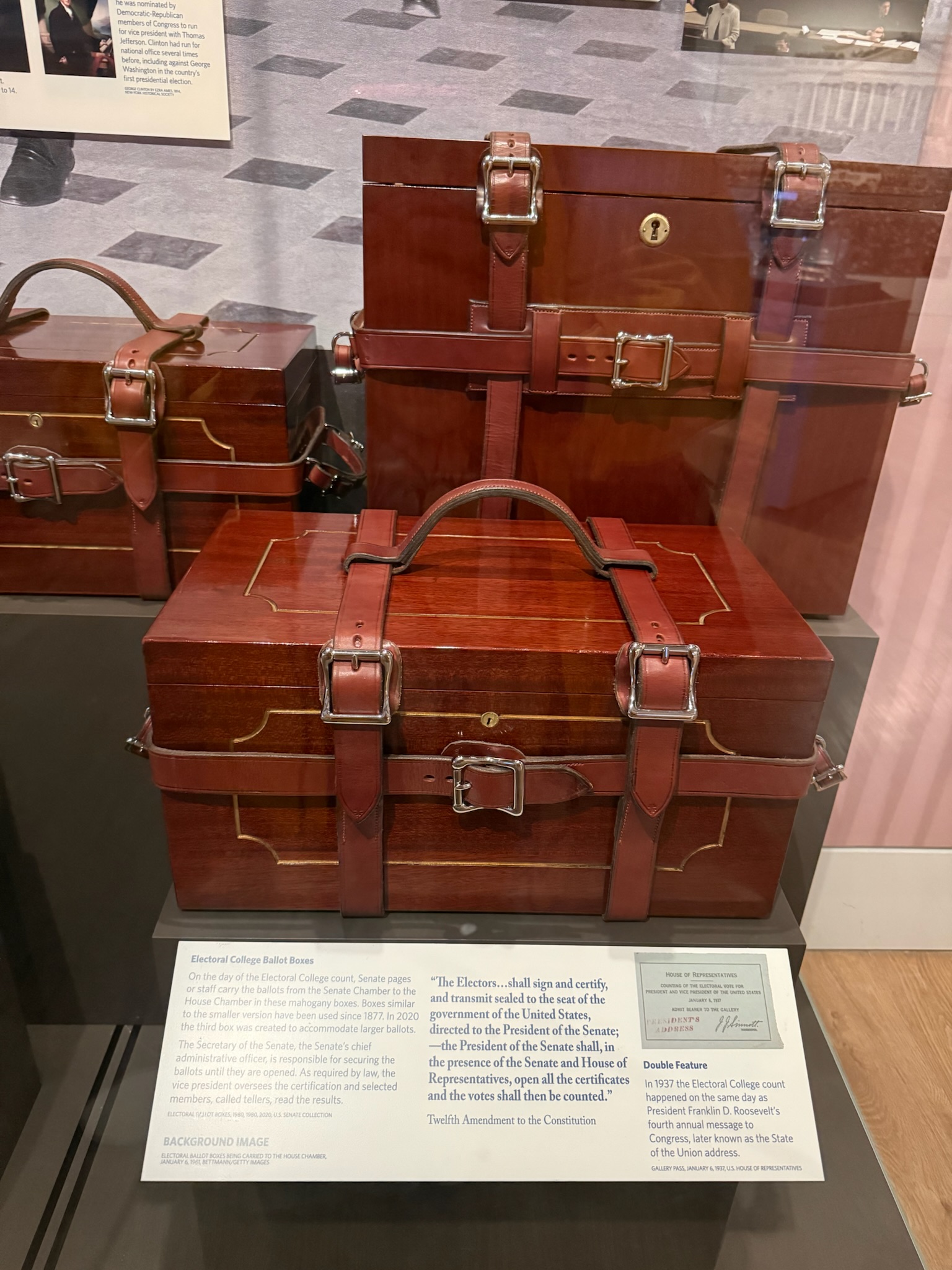 The vice president counts the Electoral College votes and certifies the winner on January 6. There were several signs about VPs having to certify their own defeat, such as Nixon when Kennedy won in 1961 and Harris when Trump won in 2025. There were also several signs about contested elections, including in 1800, when Jefferson and Burr had both gotten the same number of votes and the House had to choose the winner. Another was in 2000, when Bush was declared the winner despite the fact that the Florida Electoral College votes were extremely questionable due to apparent election irregularities. There was a large exhibit devoted to the 2021 debacle, which we won’t get into since it is still such a controversial hot-button topic.