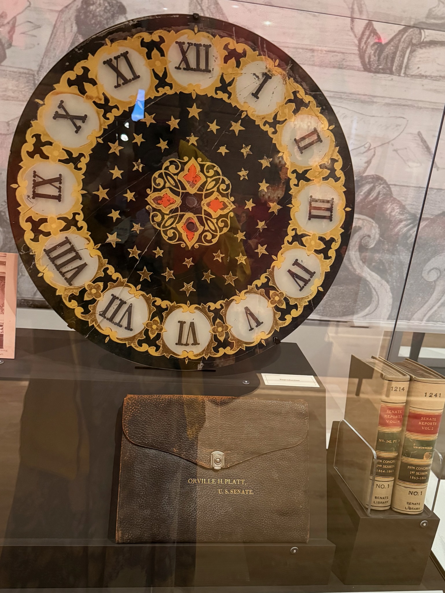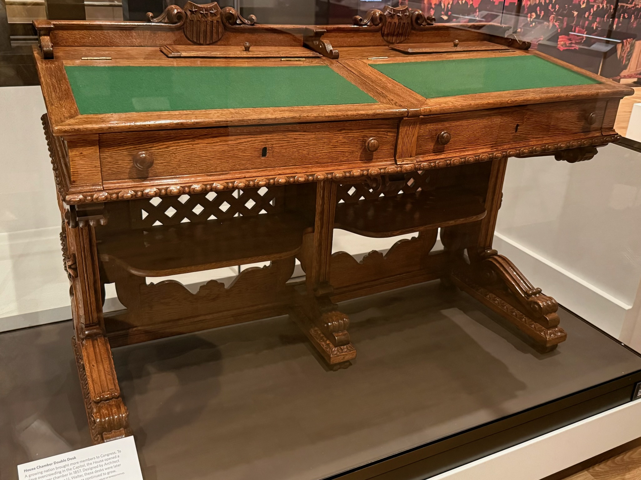 We moved on to an exhibit about the Civil War. In the late 1850s, Congress was deadlocked by regional and partisan disputes. After the war started in 1861, more than 85 legislators from southern states left to join the Confederacy (which was almost all of the southerners). The northerners took advantage of this to push through bills that had been stalled for years, including bills about education and transportation. They also paid for the war by passing the country’s first income tax (which was repealed in 1872. Before and after the war, the government funded itself via tariffs and excise taxes as income taxes were not legal except during war. In 1913, the legislature passed the 16th amendment allowing income taxes).