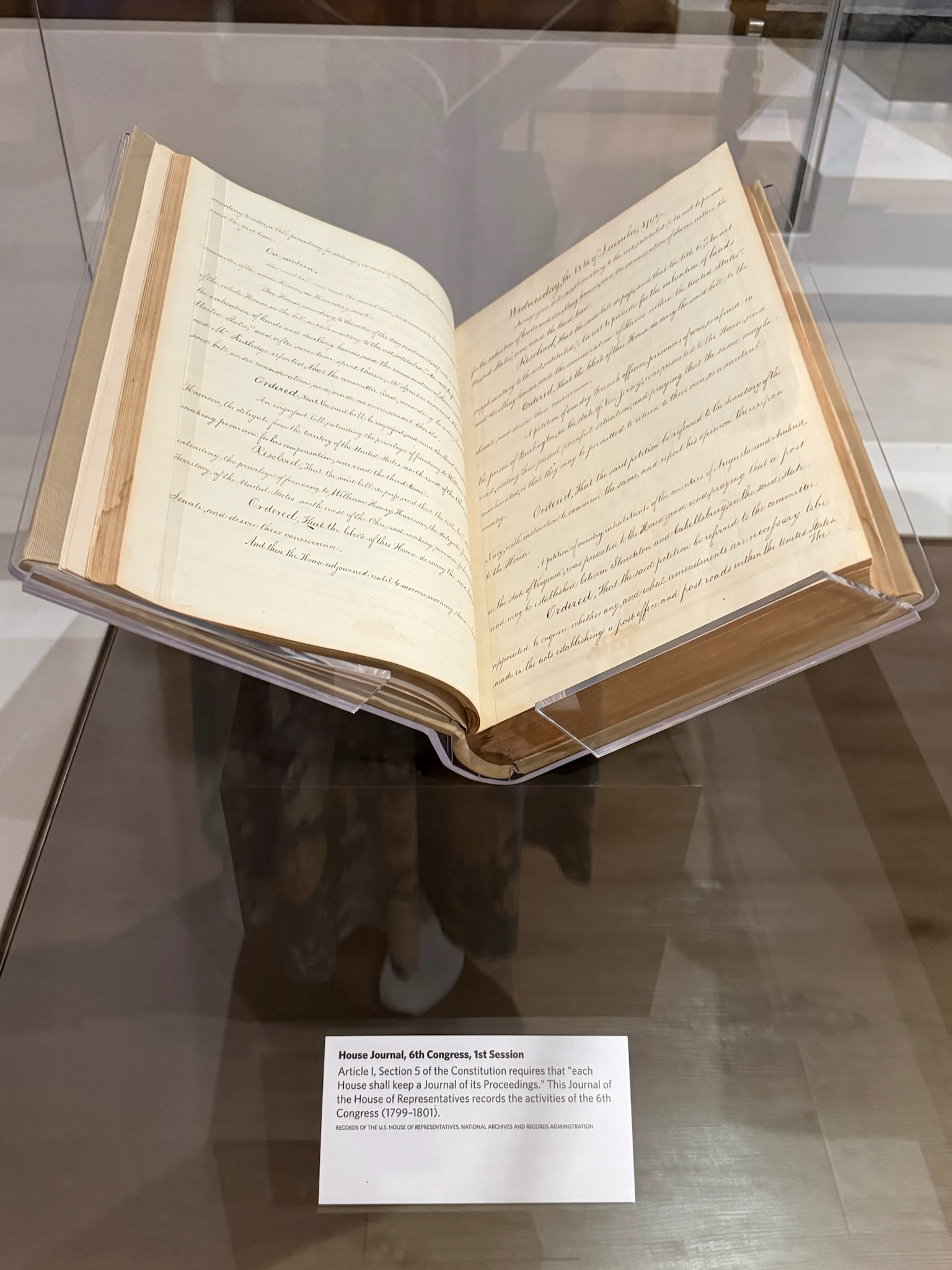 continued… The next exhibit was about more general early US government history. It started by explaining that the fledgling nation’s founding framework was the Articles of Confederation, enacted in 1781. And it explained why they were replaced in 1789 with a revolutionary new idea that had never been tried before — the Constitution. It explained how the Great Compromise led to a balance of power between three branches of government so the federal government couldn’t become tyrannical, and also ensured no state could have too much power over the others. An addendum called the Bill of Rights was added with a list of amendments to the Constitution which protected individual liberties. Interestingly, the author of the Bill of Rights, James Madison, didn’t think it was necessary, but realized that the anti-Federalists wouldn’t support the Constitution without individual rights explicitly laid out. The Constitution states that federal laws and treaties take precedence over state laws.