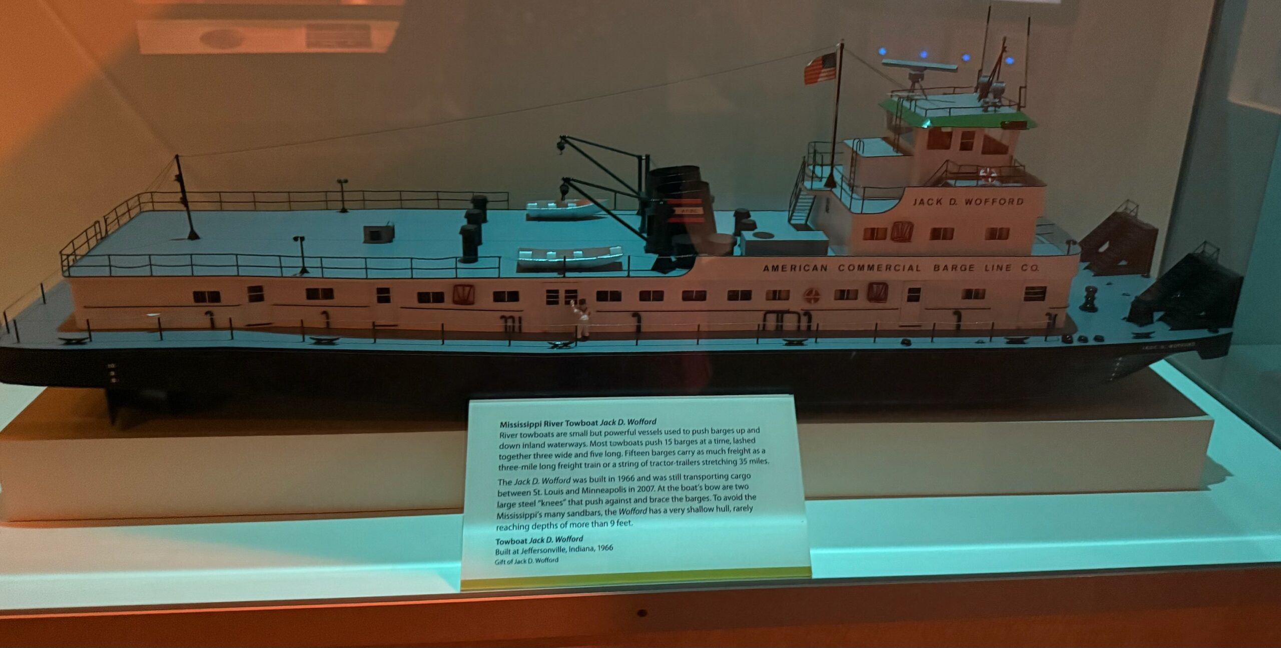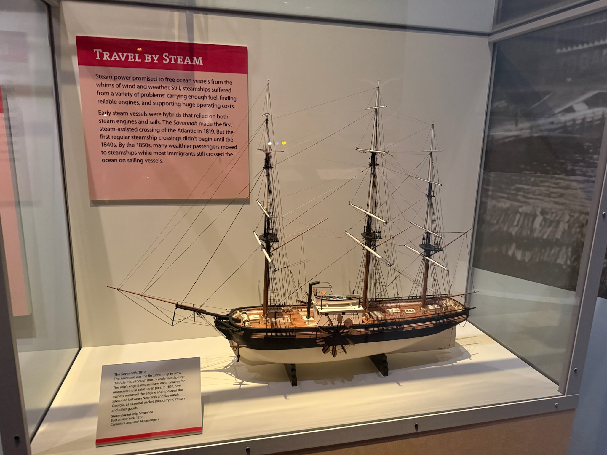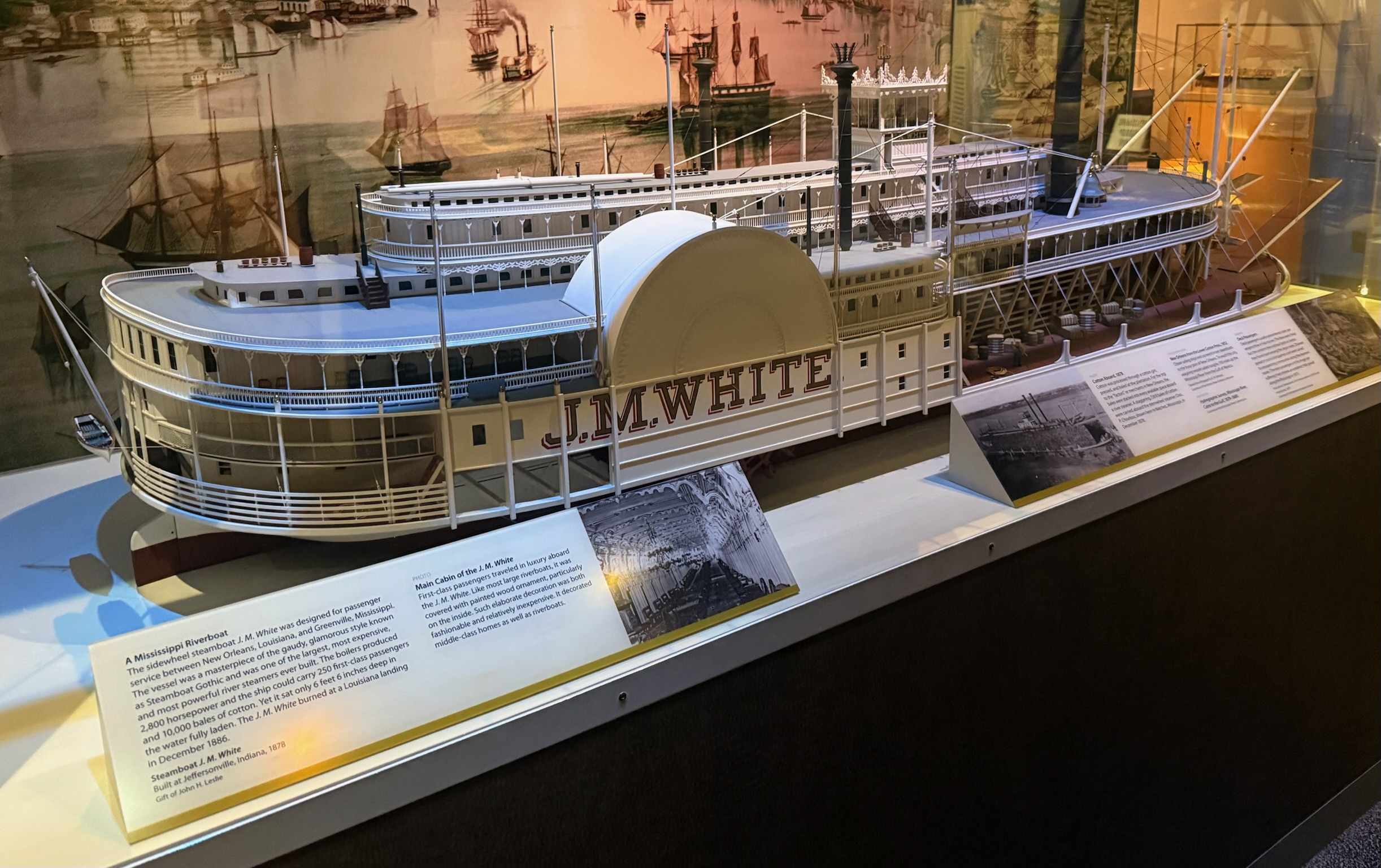 The next display was about inland waterways (navigable rivers). It started by saying that before roads and trains, water was the most efficient method of transporting goods to market. The majority of prosperous cities were on major waterways, such as New Orleans and Cincinnati. New Orleans was both an important ocean port and an important inland river port, connecting the American heartland with the rest of the world. By the 1820s, cotton, grain, pork and other agricultural products floated down the Mississippi River to New Orleans for international export. The rise of the steamboat made it easier to transport finished products and passengers to towns up the river. By 1850, New Orleans was the second busiest port in the US and the fourth busiest port in the world.