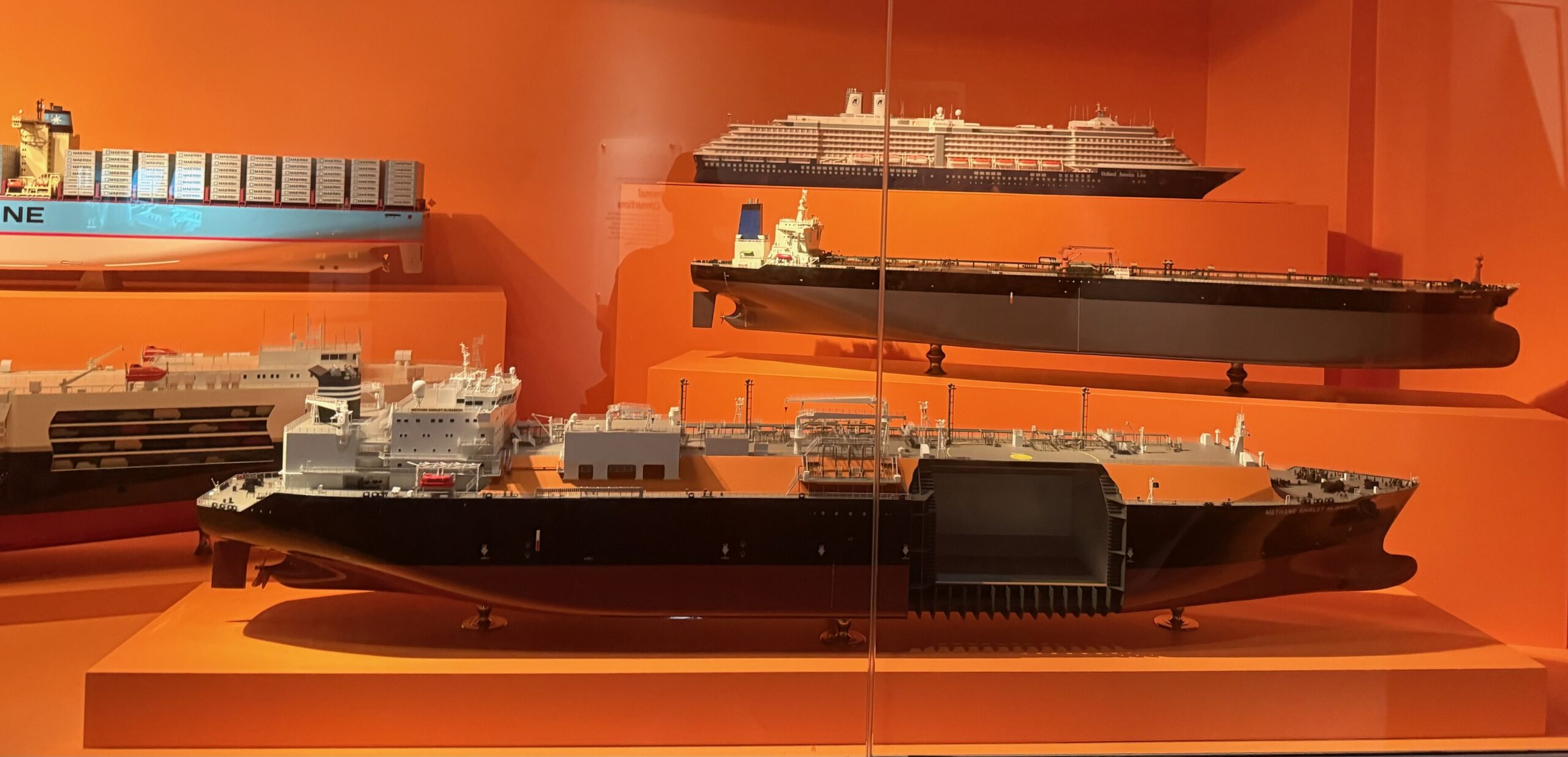For the modern Maritime Industry, the signs talked about some of the different specializations, with a model of each type of specialty ship on display: Tankers for Liquid Natural Gas (LNG), oil tankers, cruise ships, fishing trawlers, container ships, and car carriers.