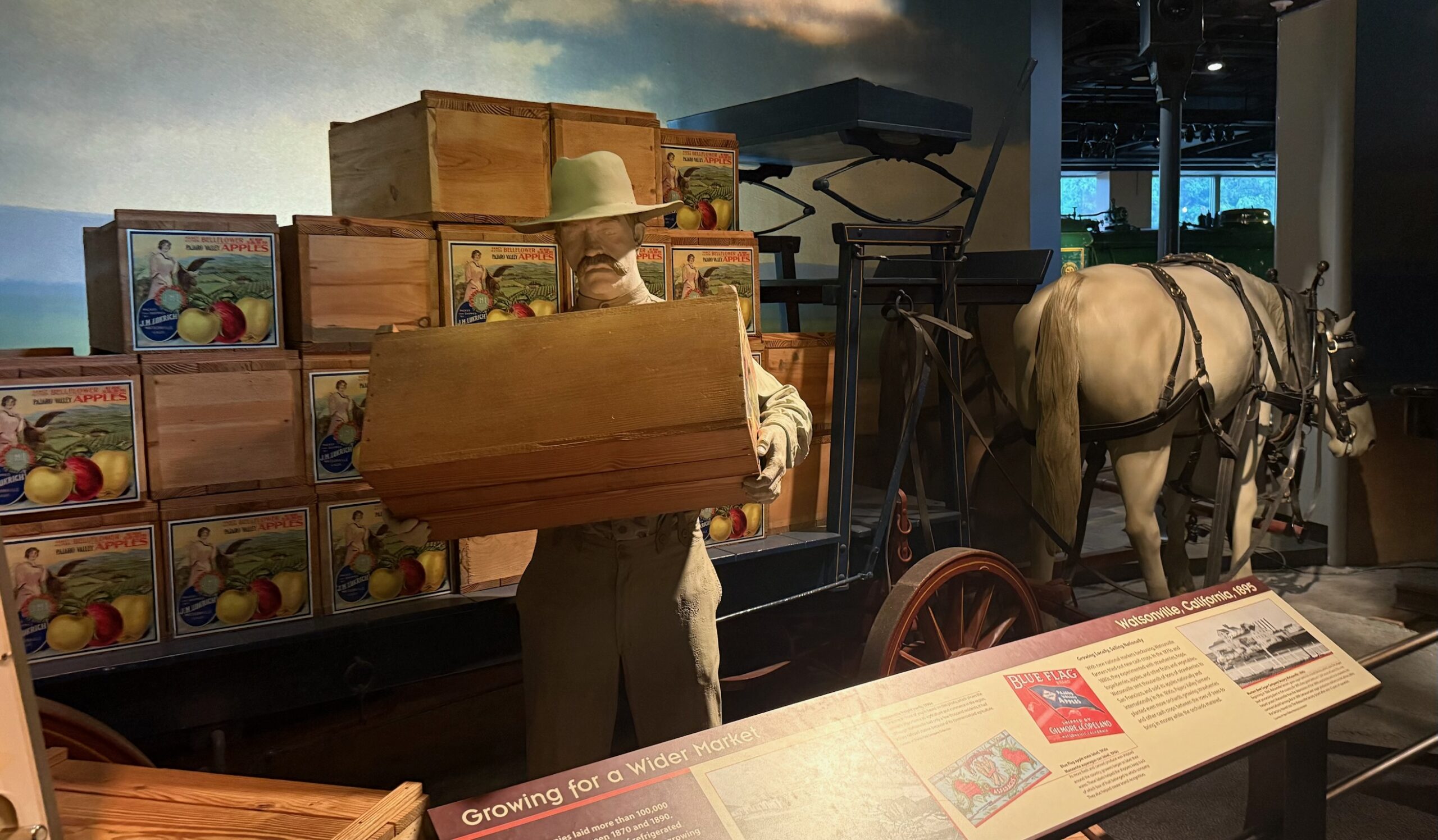 The first exhibit that we saw in the room was on Watsonville, California (in Santa Cruz county, about halfway between the cities of Santa Cruz and Monterey). More accurately, it was about how the coast-to-coast train system changed the national economy, but Watsonville was the story cited to help bring history to life.