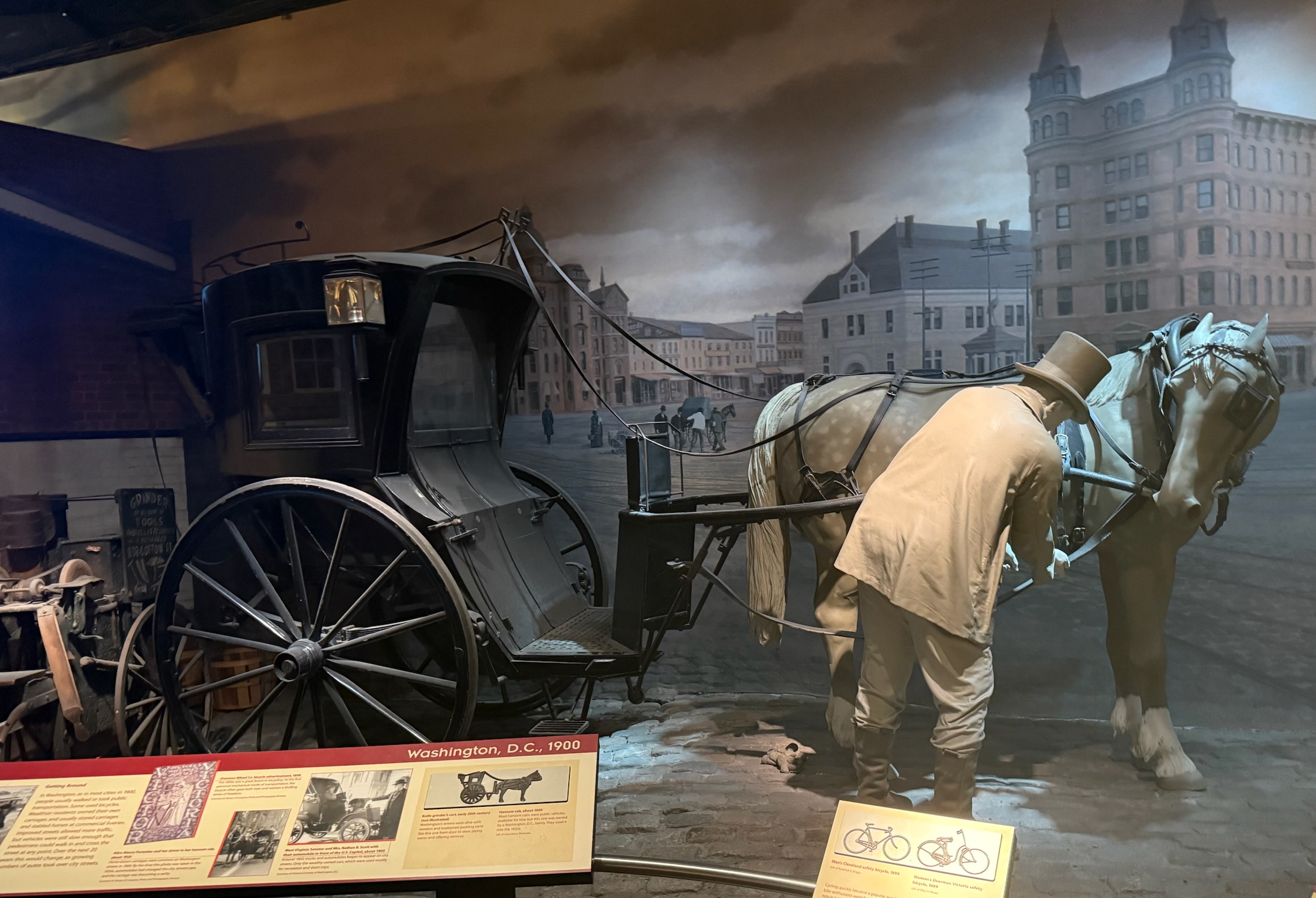 The exhibit on DC changed from food to transportation in DC. In 1900, most of the rural farmers who took their products to DC to sell used horse-drawn wagons. Tradesmen and vendors also used horse-drawn wagons to transport tools/goods. Most city residents lived close to where they worked/shopped, so they walked. Some people had bicycles, which, as we’d learned in another exhibit in this museum had become popular in the 1890s. Wealthier residents had their own horse-drawn carriages, which were kept at commercial liveries. There were horse-drawn carriages available for hire. And in 1900, the first few automobiles appeared.