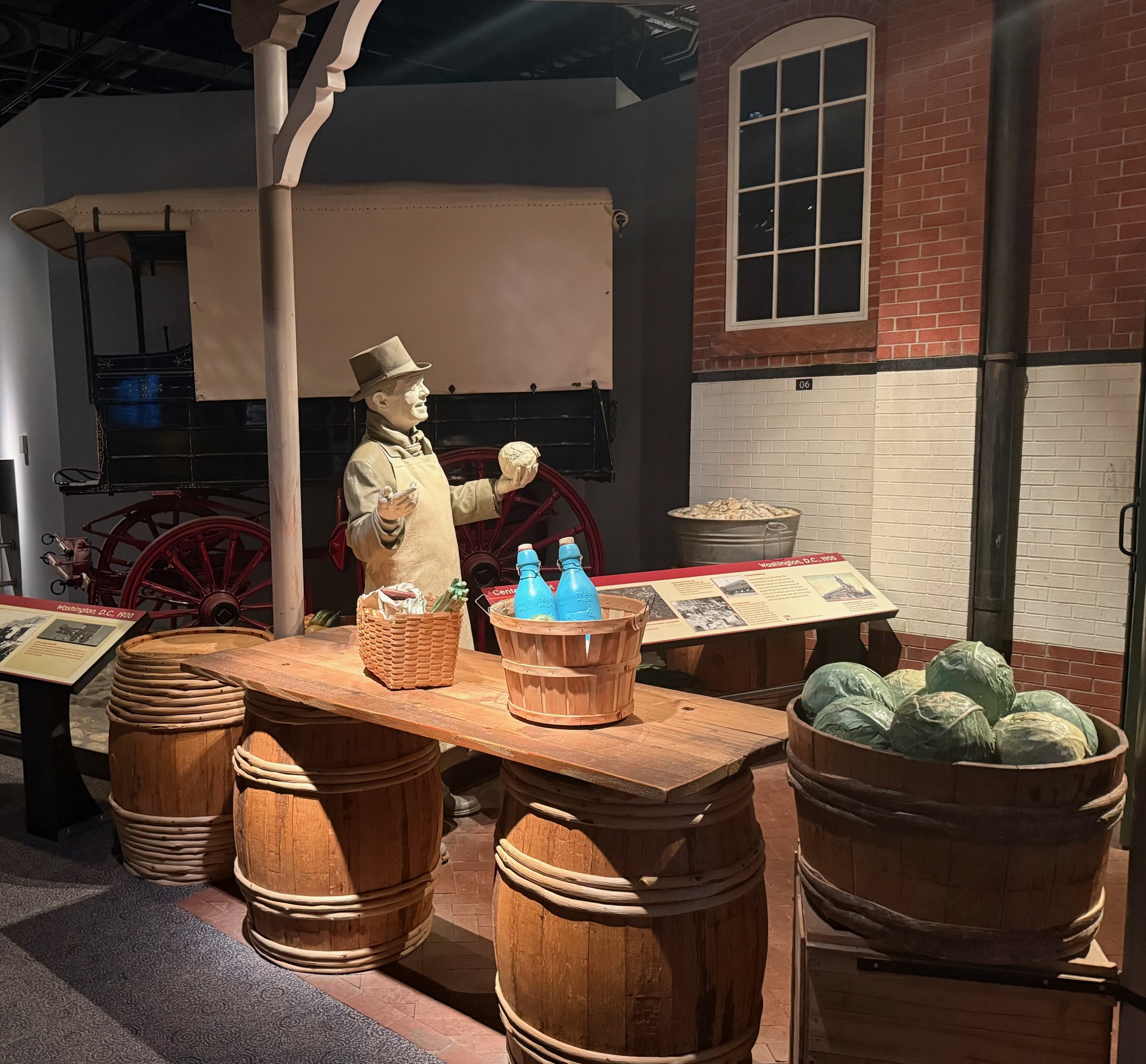 From here, the exhibit switched suddenly from Watsonville to Washington, DC. We suppose the idea was to follow where the produce grown in Watsonville in 1900 went. In this case, the farm sent it to a wholesaler in DC, who sold it to retailers. Some retailers were small, independent neighborhood markets. Other retailers took the produce to the Center Market, where vendors sold produce, meat, seafood, etc out of stalls to city residents. Thanks to the train system, shoppers in DC could buy all kinds of exotic foods that had previously been unavailable, such as oranges and bananas (the bananas arrived from Central America by boat and were transported by train to DC).