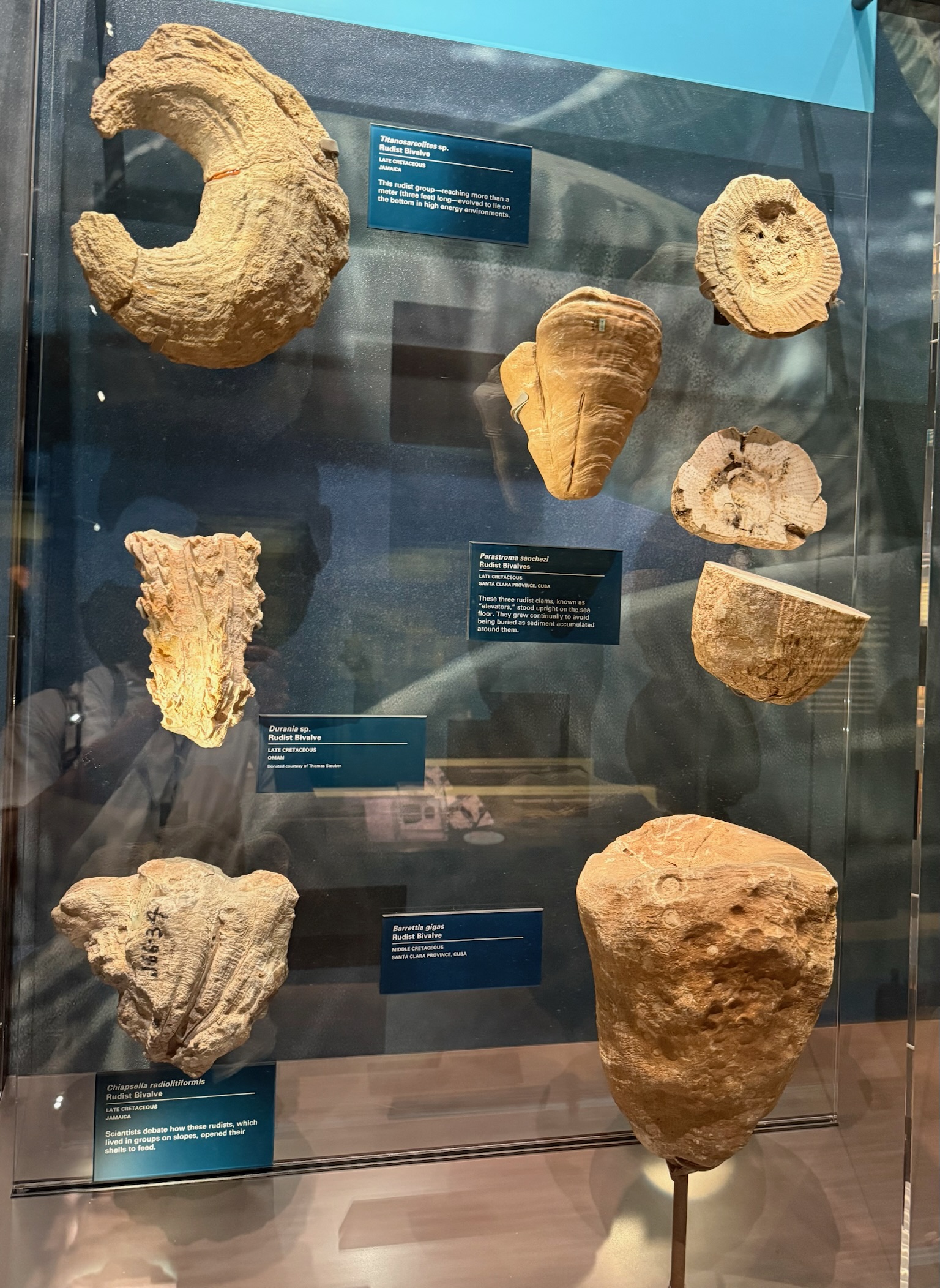 There was a display about ancient species of clams that built tropical ocean reefs 100 million years ago. These various species died out 65-million years ago, the same time as dinosaurs.
