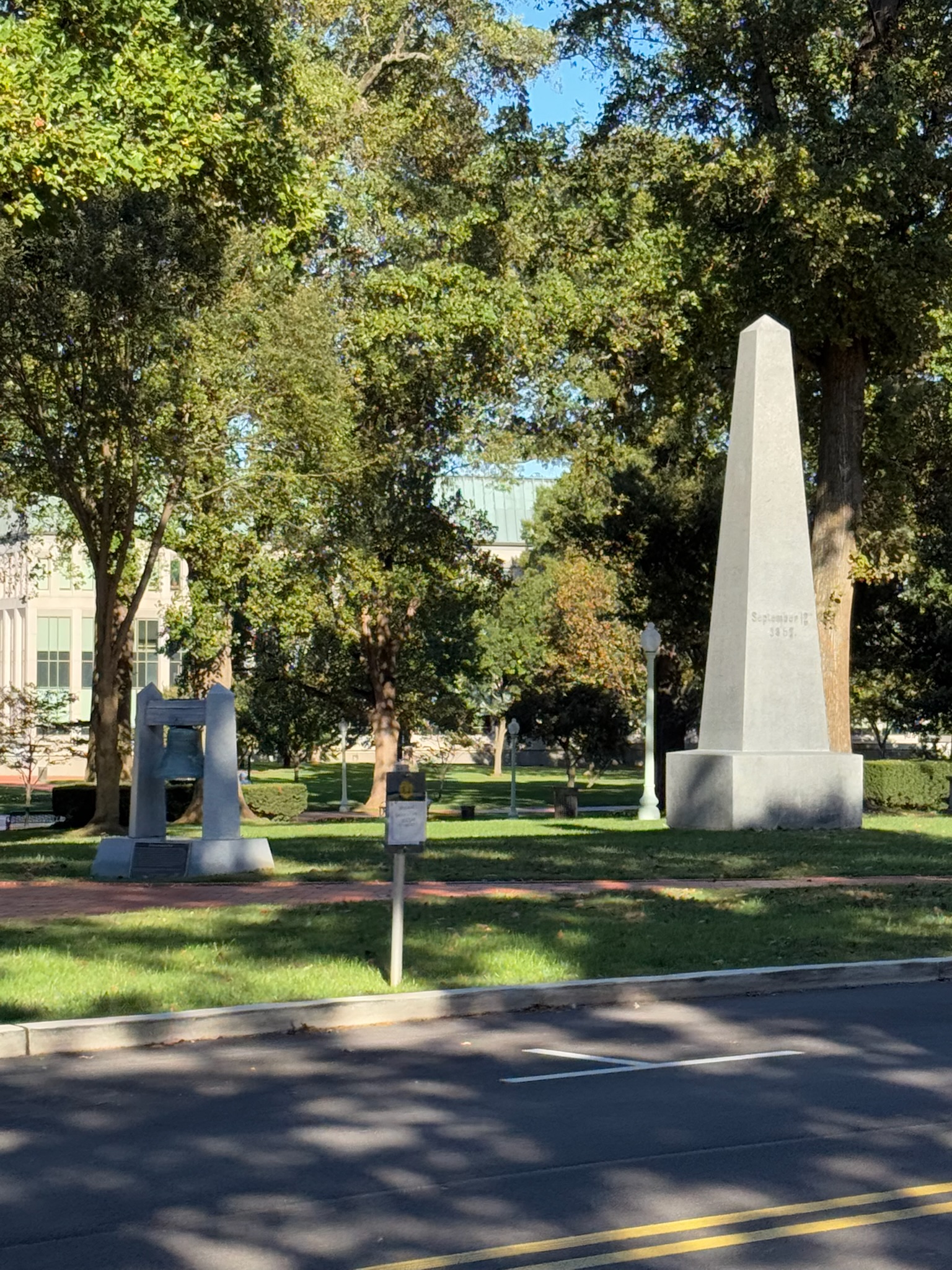 Our next stop was a park-like area across from the chapel and Larson Hall. We forgot what the guide called it, but similar spaces at our schools were called “quads.” There was a gazebo and several monuments in the park. He told us about several traditions and rituals that were performed at the park, including one where they greased the cap on the obelisk, and the students have to work together to climb up and get the cap down. We believe he said this annual ritual was performed by freshman at end of year.