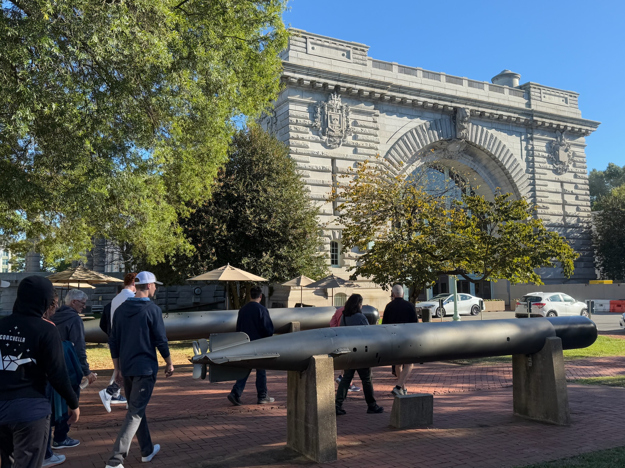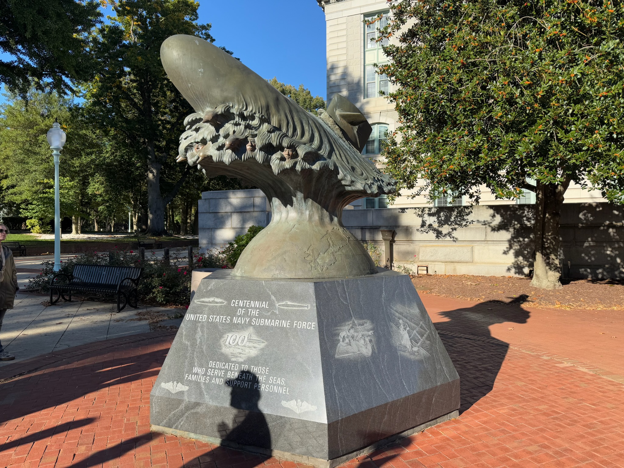In between the dorms and the next building that we visited (visible in the photo below) was a statue commemorating 100 years of the submarine force. We hadn’t realized that the submarine force had started in 1900! Next to it was a statue commemorating The Battle of Midway, which was fought against the Japanese during World War II. Near the statues were two real Japanese missiles from World War II. According to the sign, these were the largest enemy weapons that the US encountered during that war.