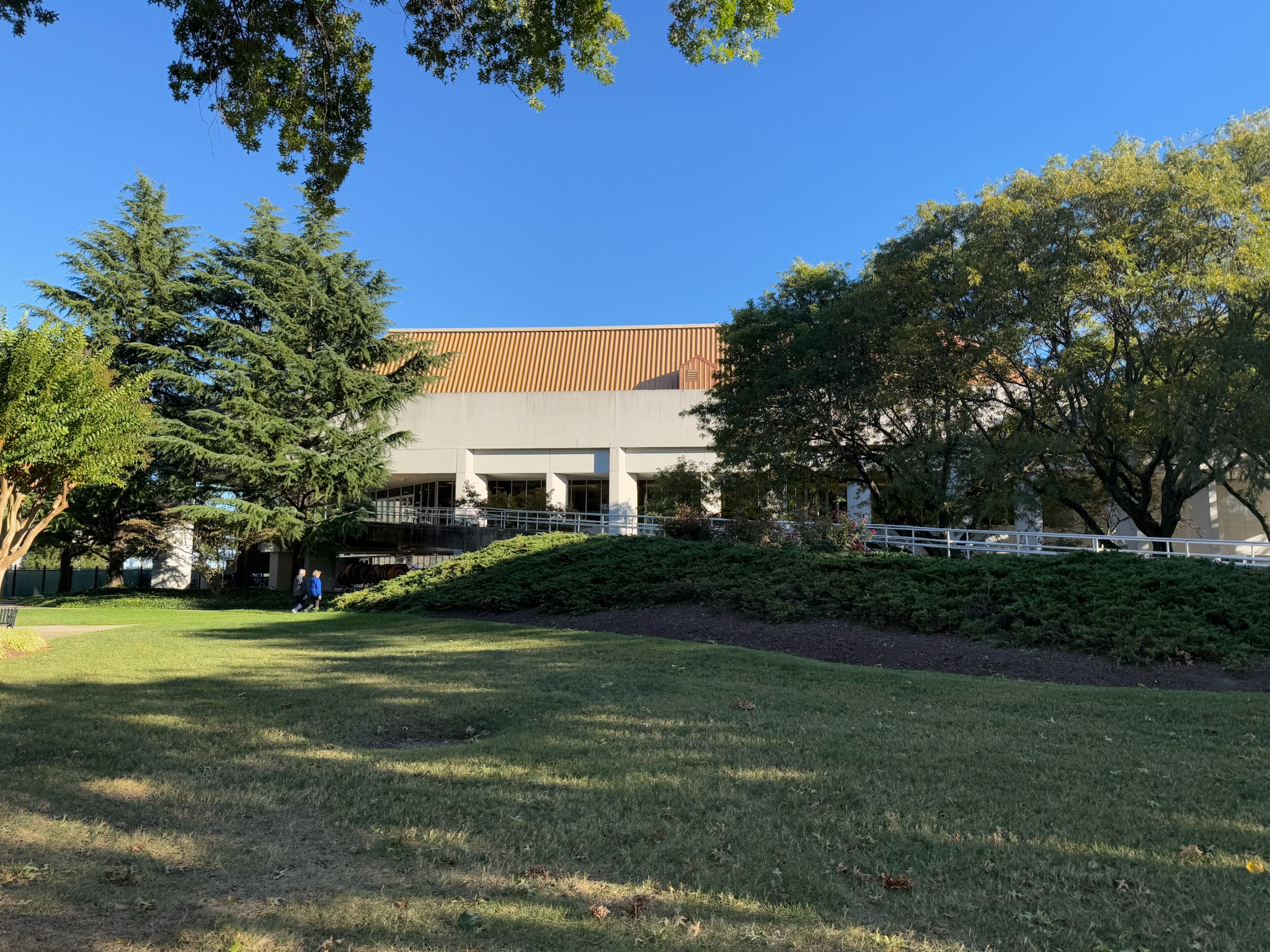 We exited the building and stopped in the parking lot between the sports complex and the dorms. This photo gives a sense of how big the dorm complex was — it looked much bigger from the back than it had from the front.