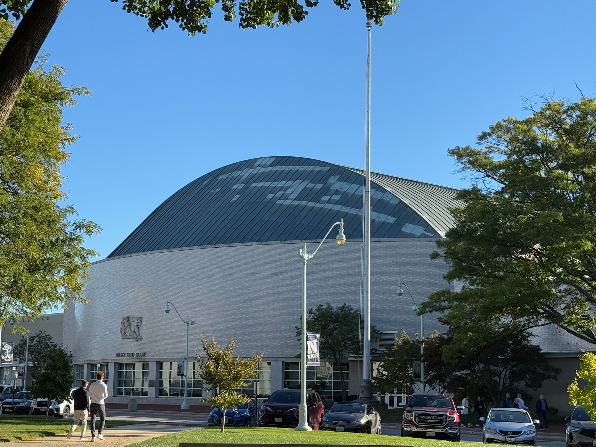 We joined the tour group, which had moved a little ways and were outside the entrance to an indoor football field, called the Halsey Field House. We asked someone what we had missed, and he replied that the guide had mostly given a background on himself and was just beginning to talk about the school.